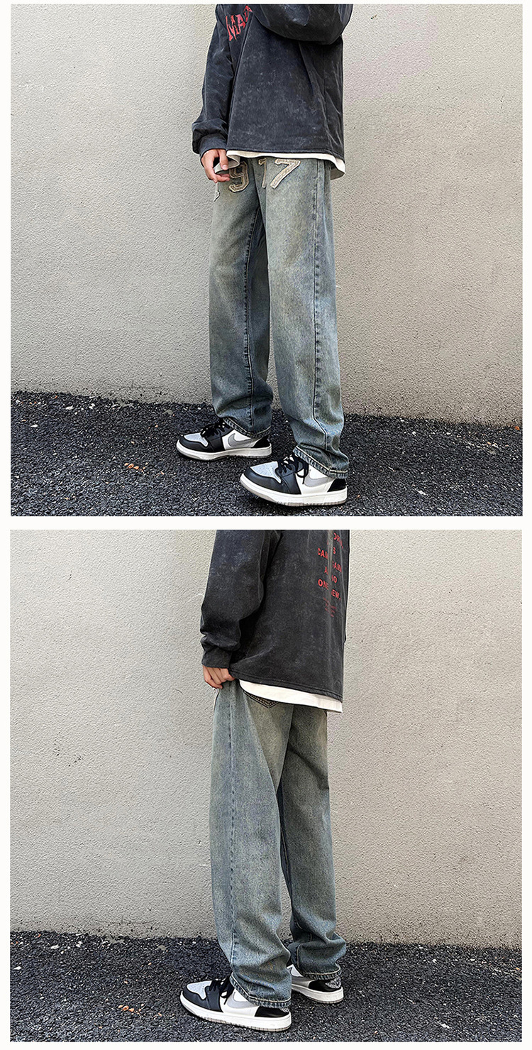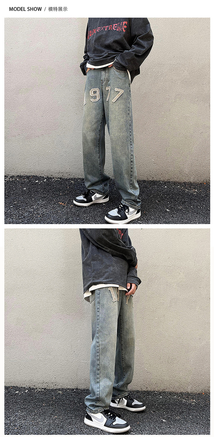 유럽과 미국의 스타일 바이브 스타일 팬츠, 하이 스트리트 트렌디 브랜드 미국 스타일 빈티지 1977 자수 청바지 남성용 슬림 핏 스트레이트 바지스토어 가기