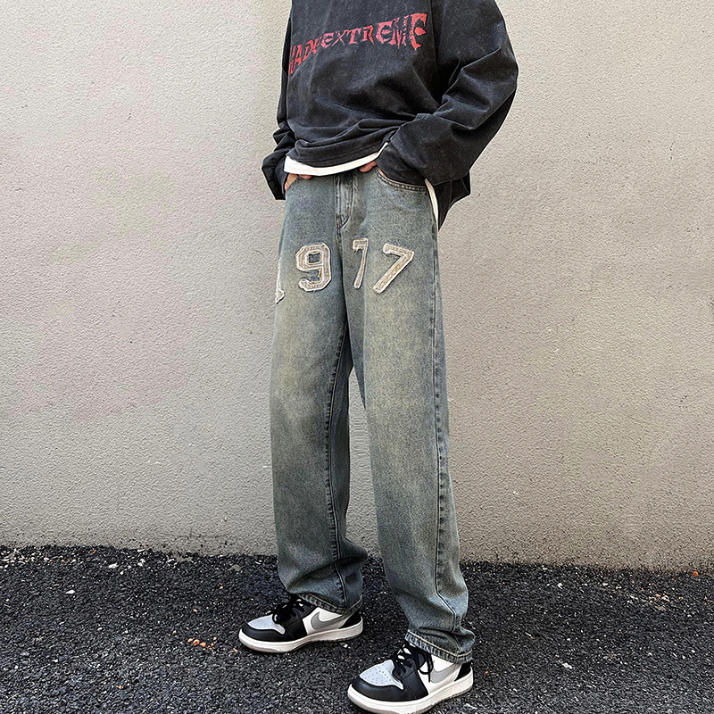 유럽과 미국의 스타일 바이브 스타일 팬츠, 하이 스트리트 트렌디 브랜드 미국 스타일 빈티지 1977 자수 청바지 남성용 슬림 핏 스트레이트 바지
