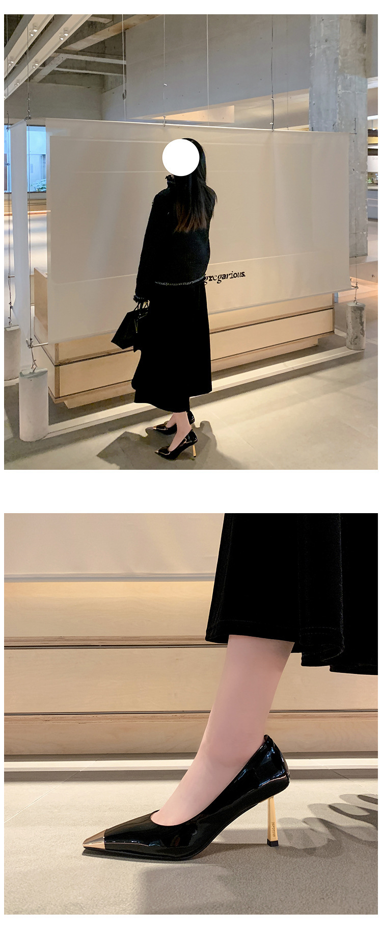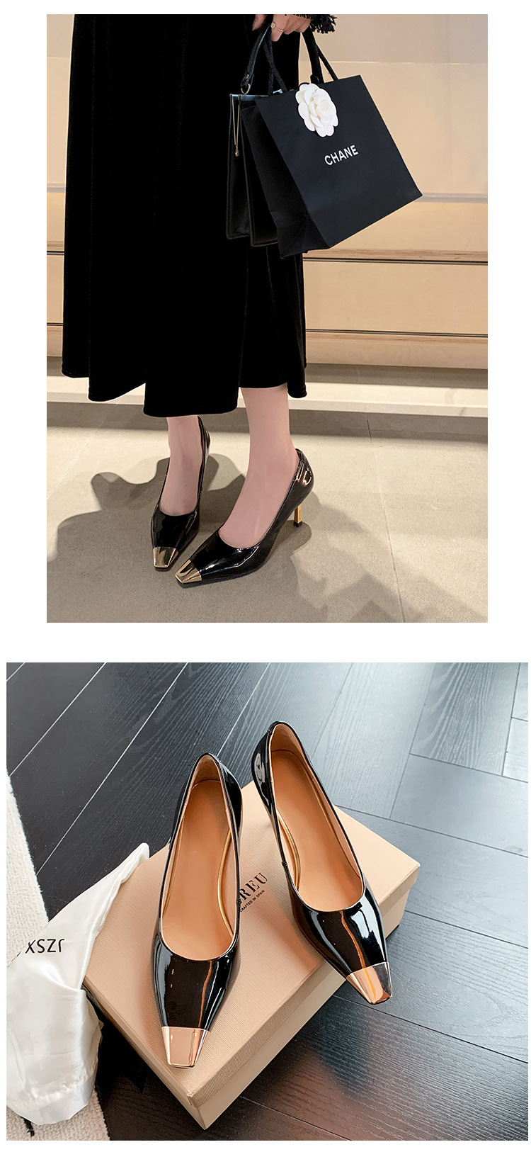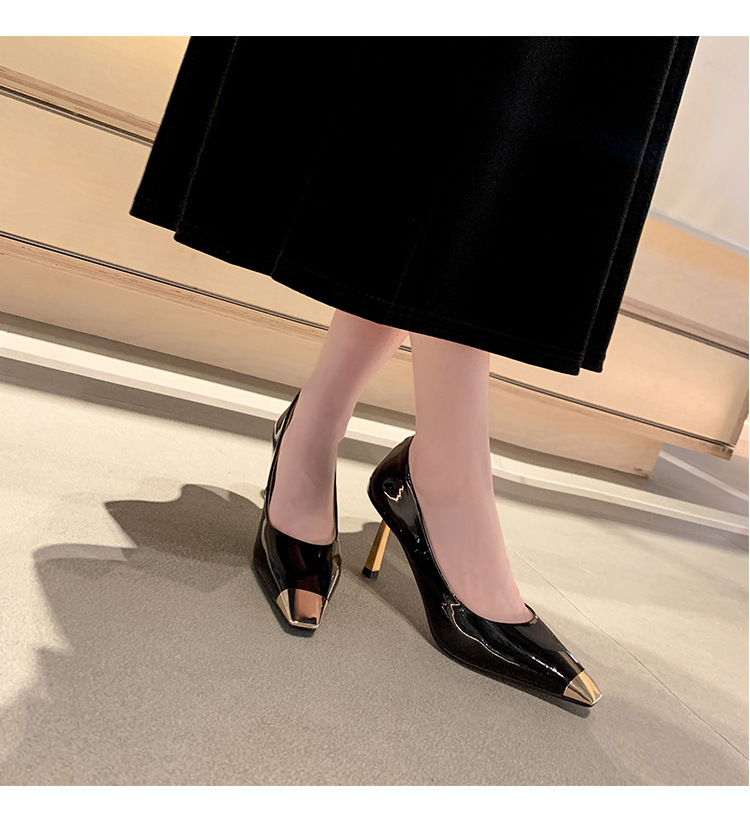 Pu Caiying 로즈 같은 스타일의 하이힐 여성 새로운 섹시한 가죽 금속 발가락 사각 발가락 스틸레토 슈즈스토어 가기