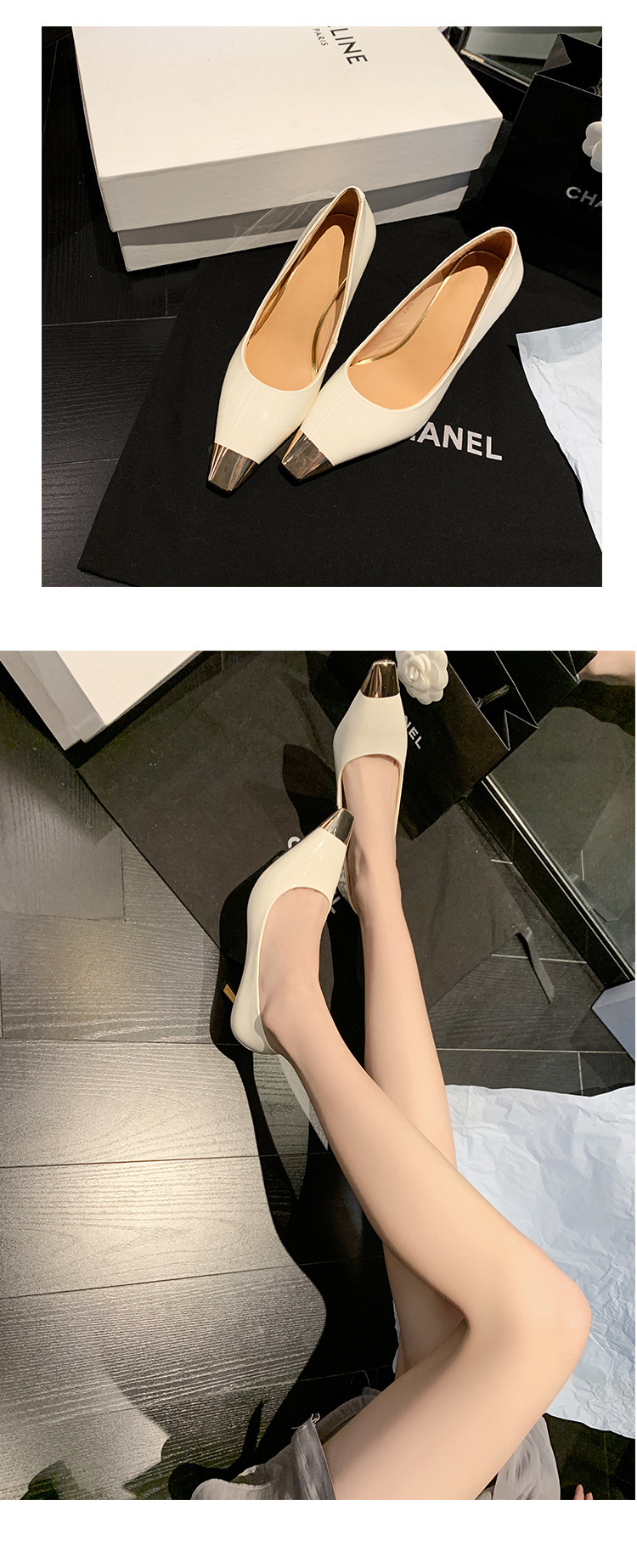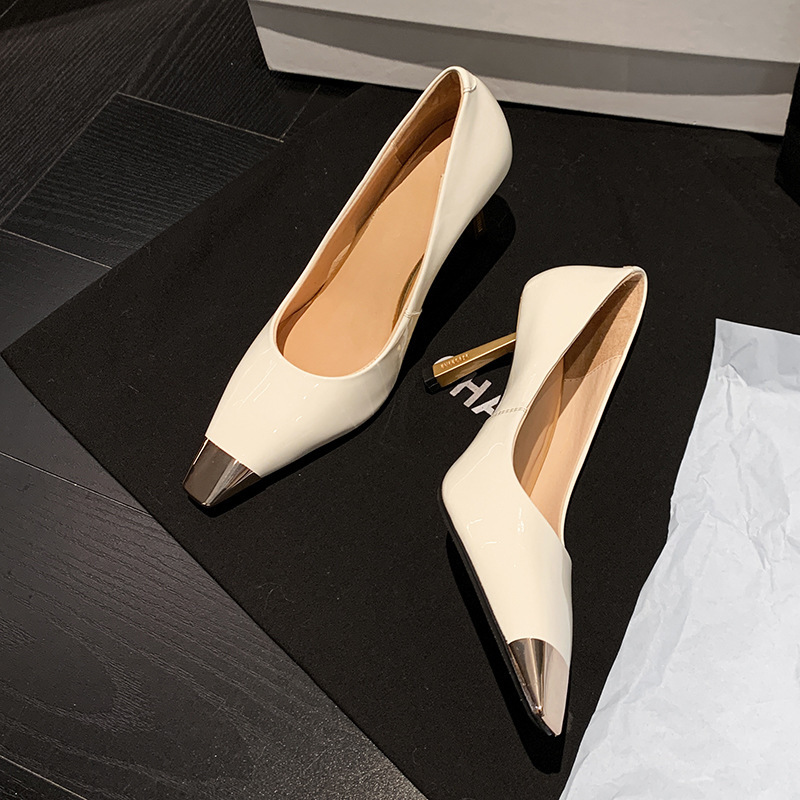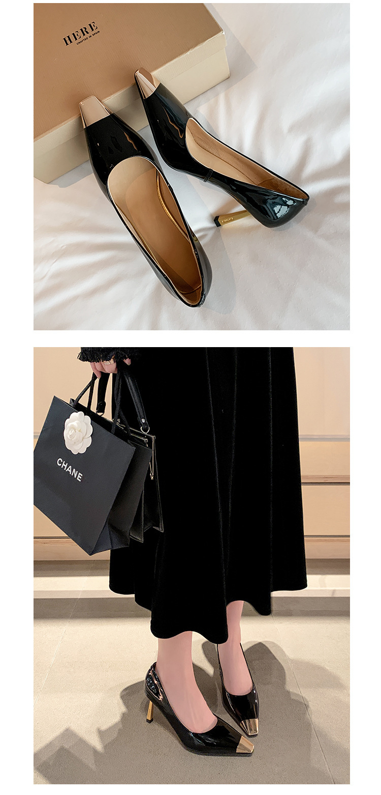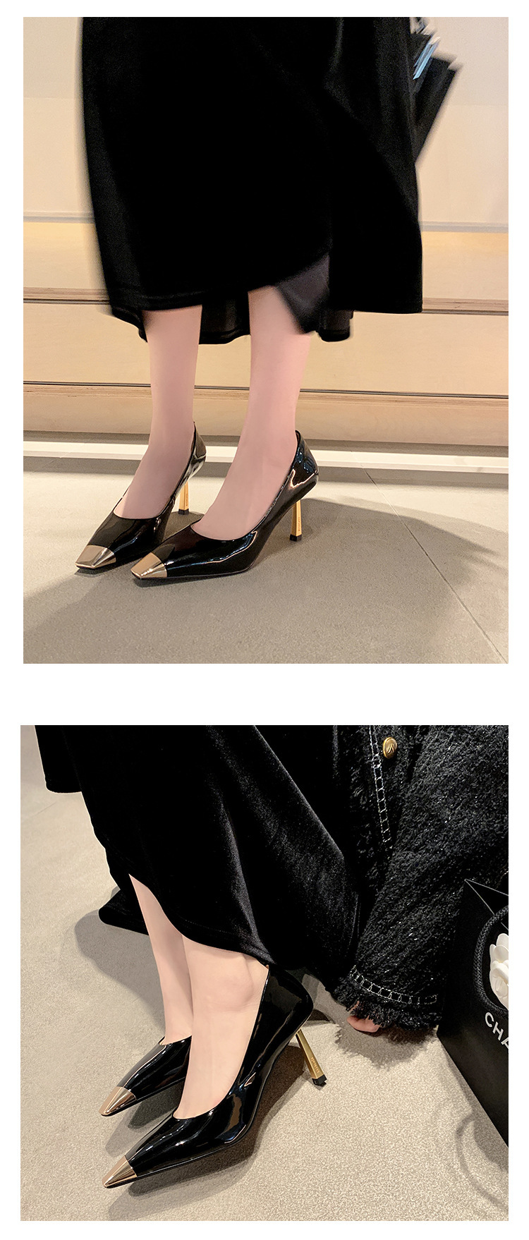 Pu Caiying 로즈 같은 스타일의 하이힐 여성 새로운 섹시한 가죽 금속 발가락 사각 발가락 스틸레토 슈즈스토어 가기