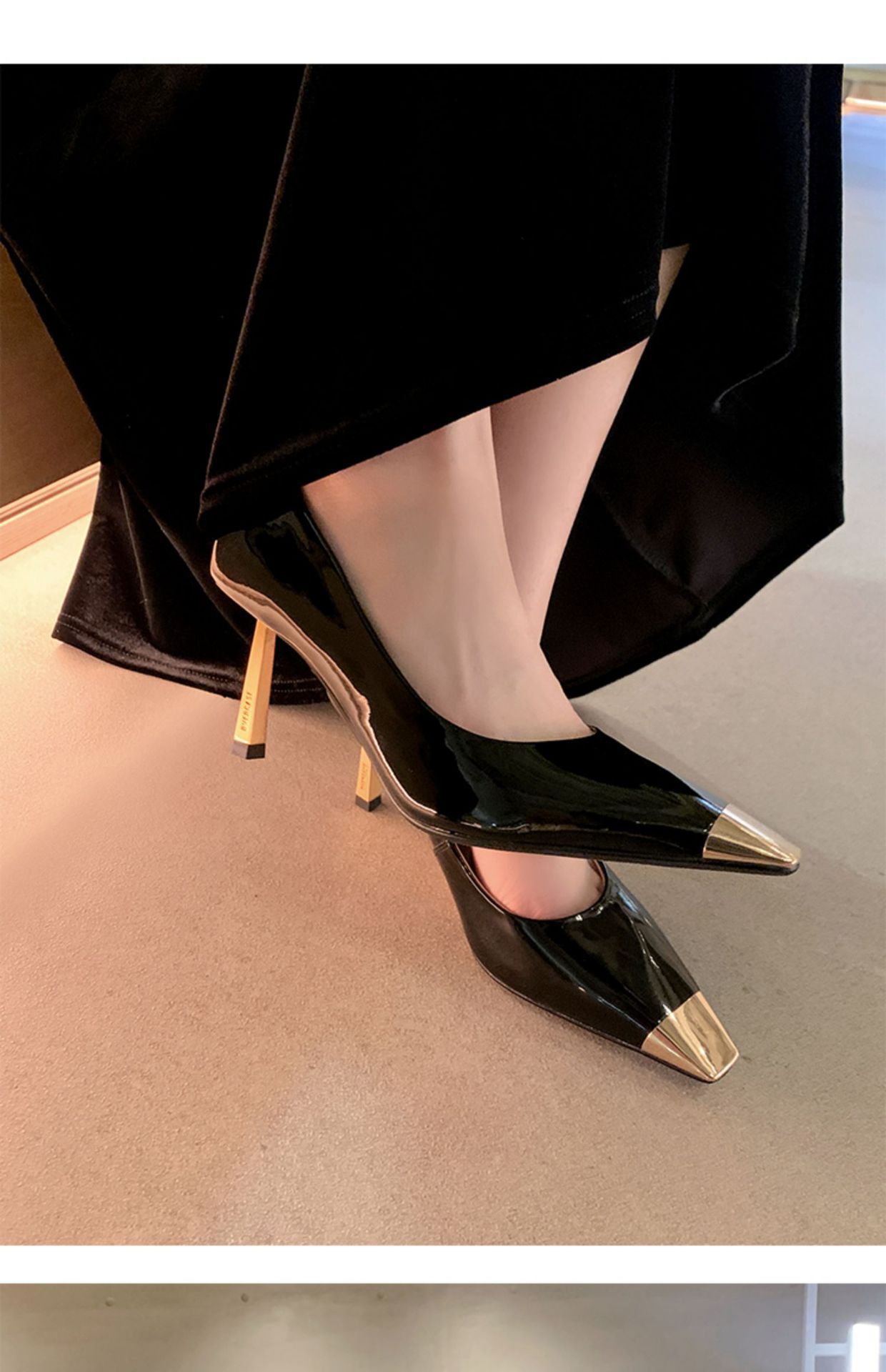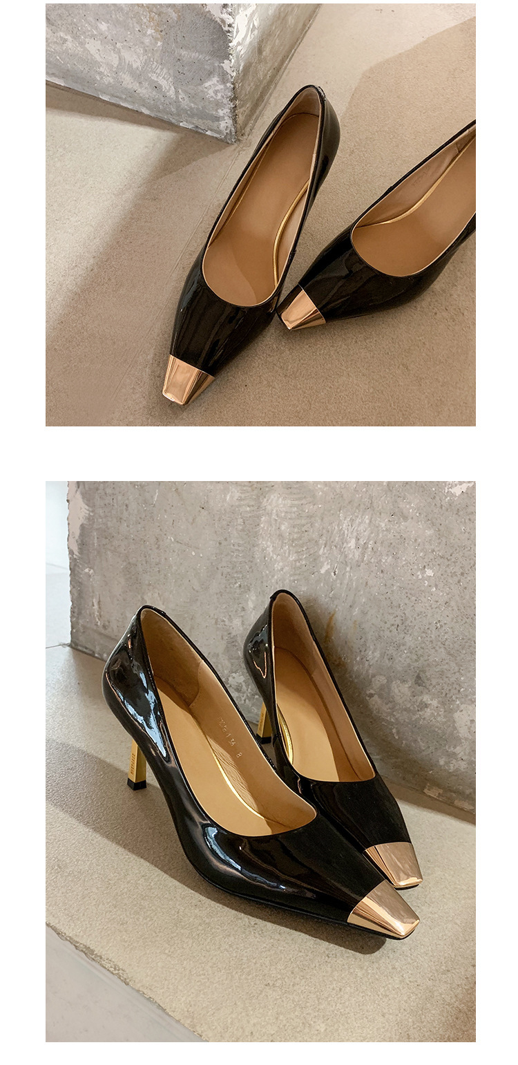 Pu Caiying 로즈 같은 스타일의 하이힐 여성 새로운 섹시한 가죽 금속 발가락 사각 발가락 스틸레토 슈즈