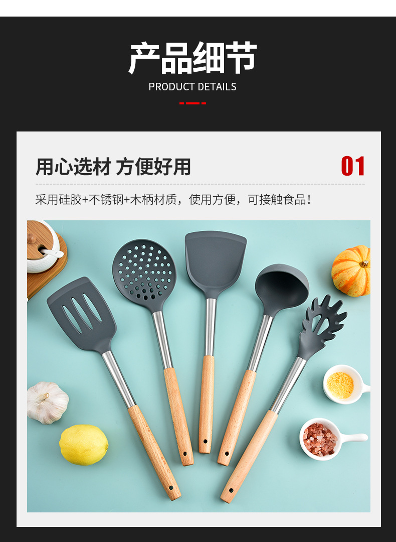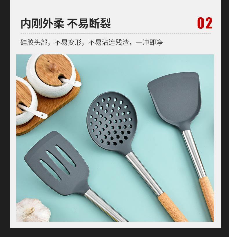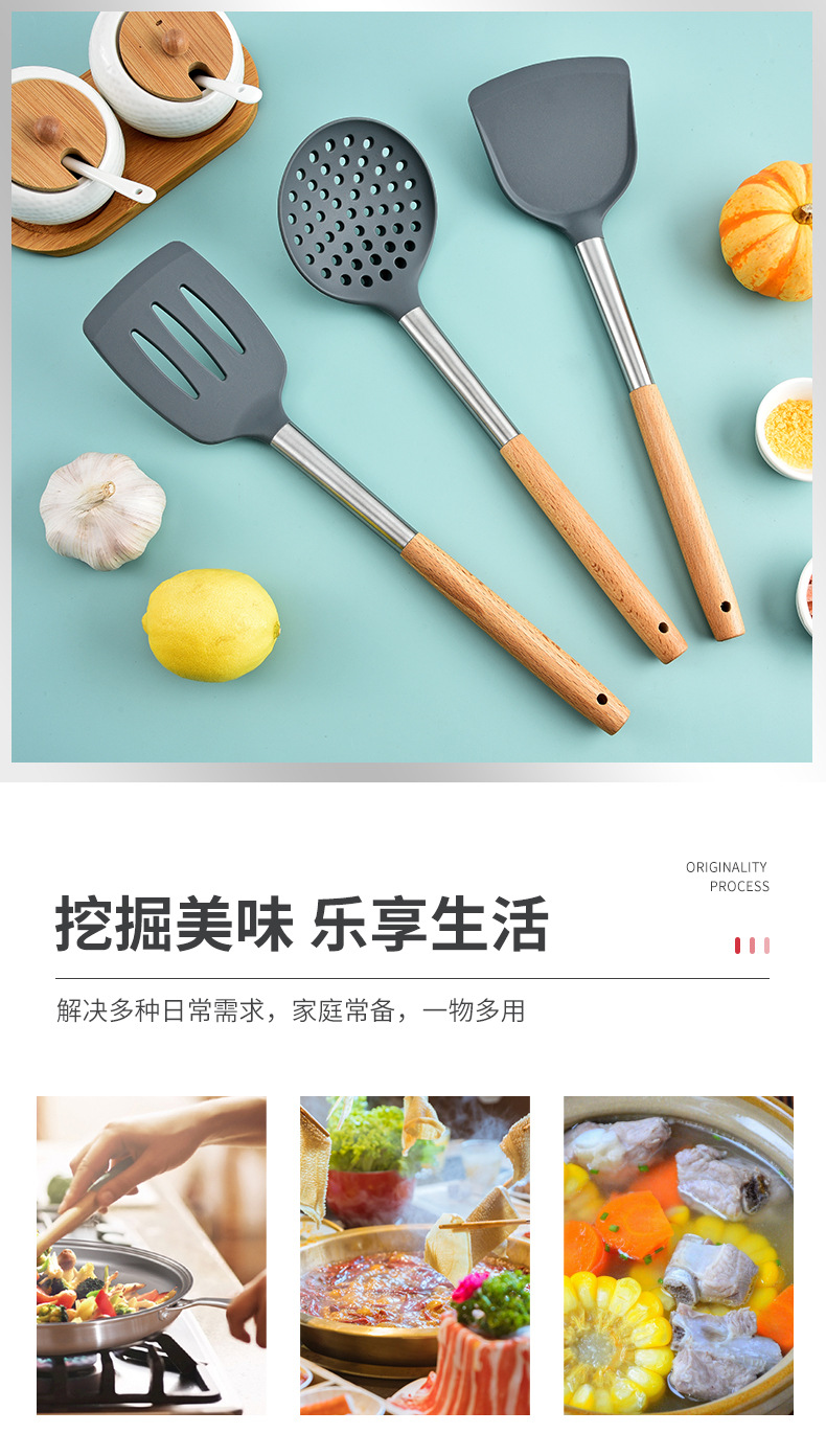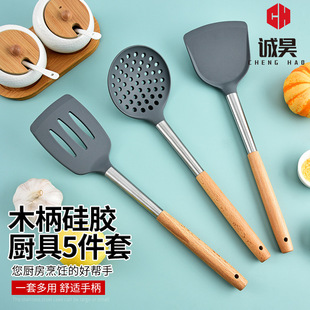 실리콘 주방 용품 5 피스 세트 가정용 요리 주걱 스테인리스 스틸 나무 손잡이 요리 주걱 수프 숟가락 여과기 주방 도구스토어 가기