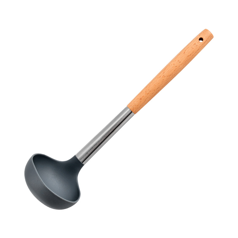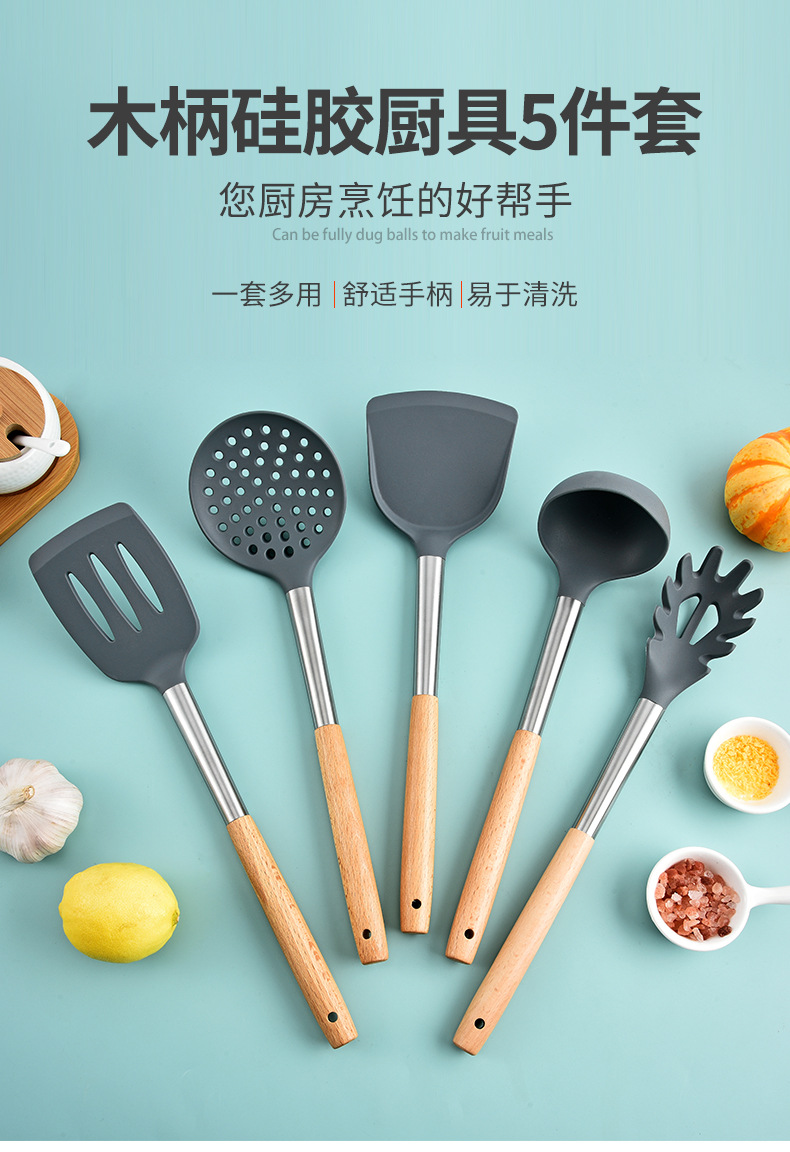 실리콘 주방 용품 5 피스 세트 가정용 요리 주걱 스테인리스 스틸 나무 손잡이 요리 주걱 수프 숟가락 여과기 주방 도구