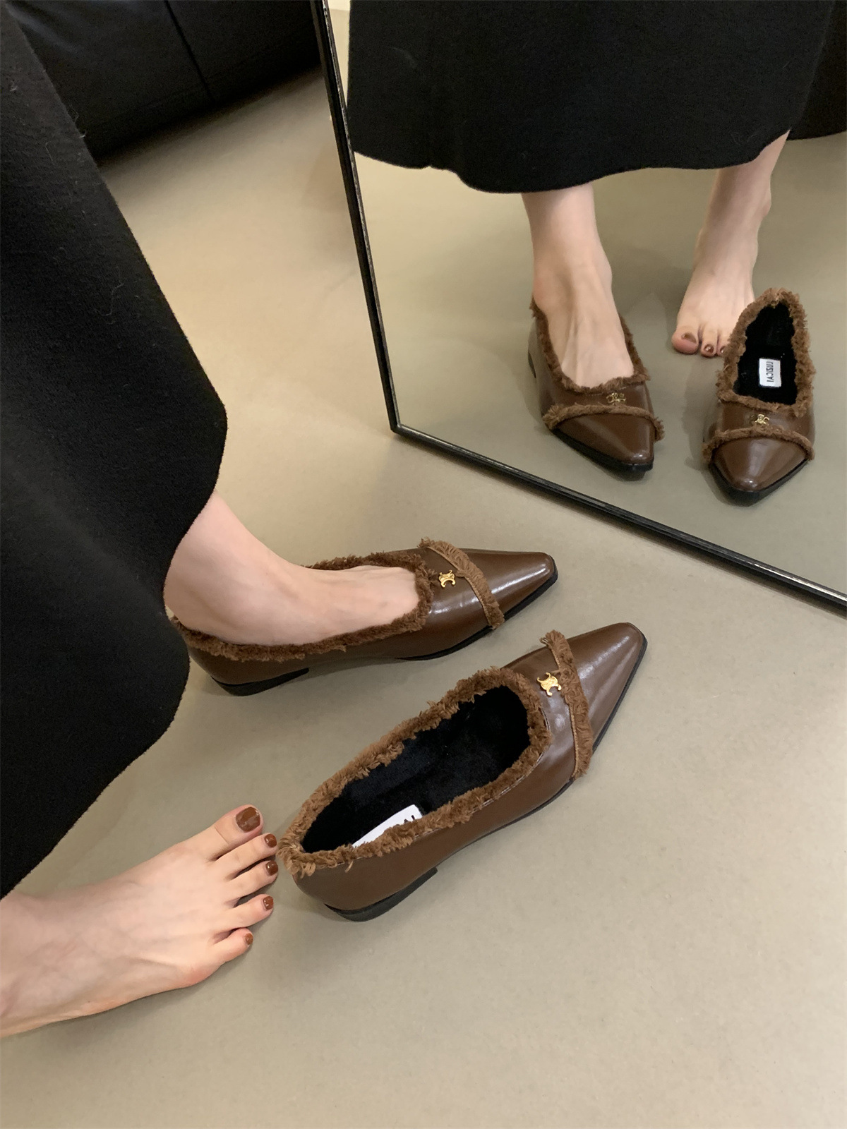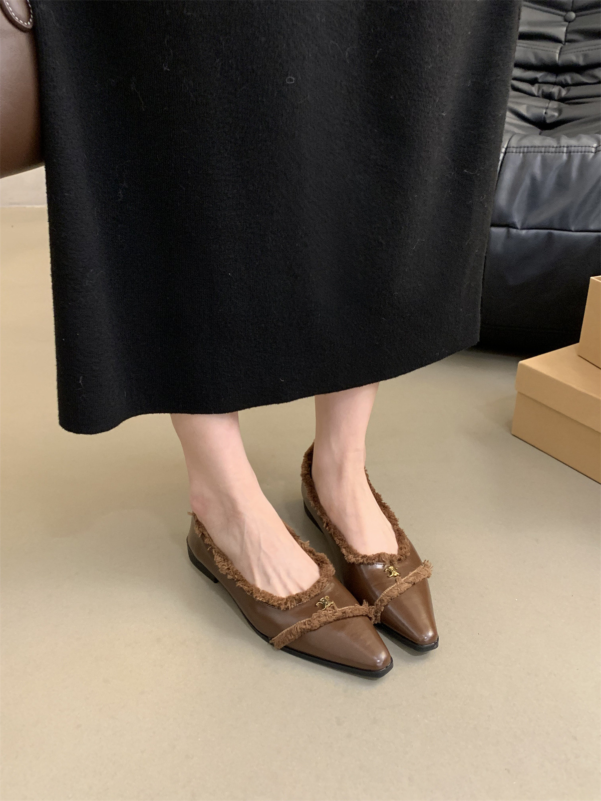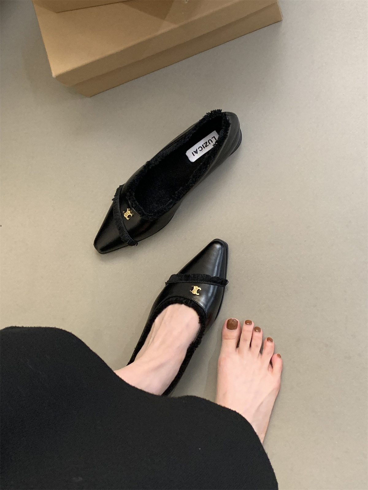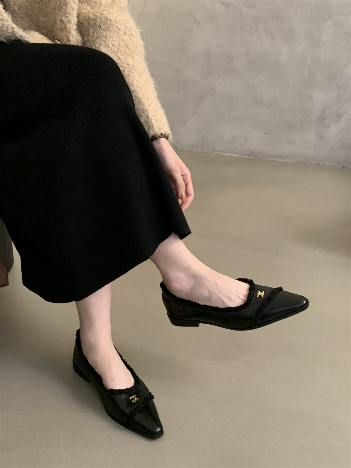 프랑스 스타일의 우아한 뾰족한 발가락 얕은 입 싱글 레이어 신발 여성을위한 기모 2023 새로운 한국식 복고풍 여성용 플랫 슬립 온