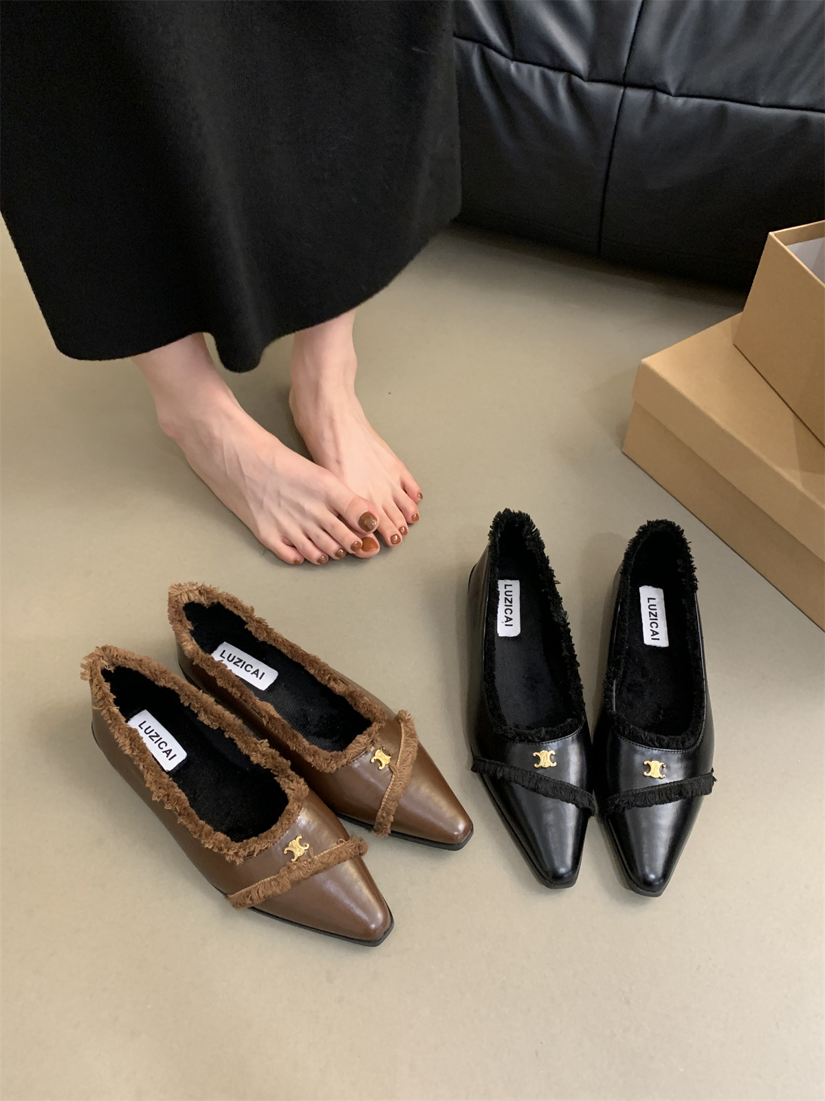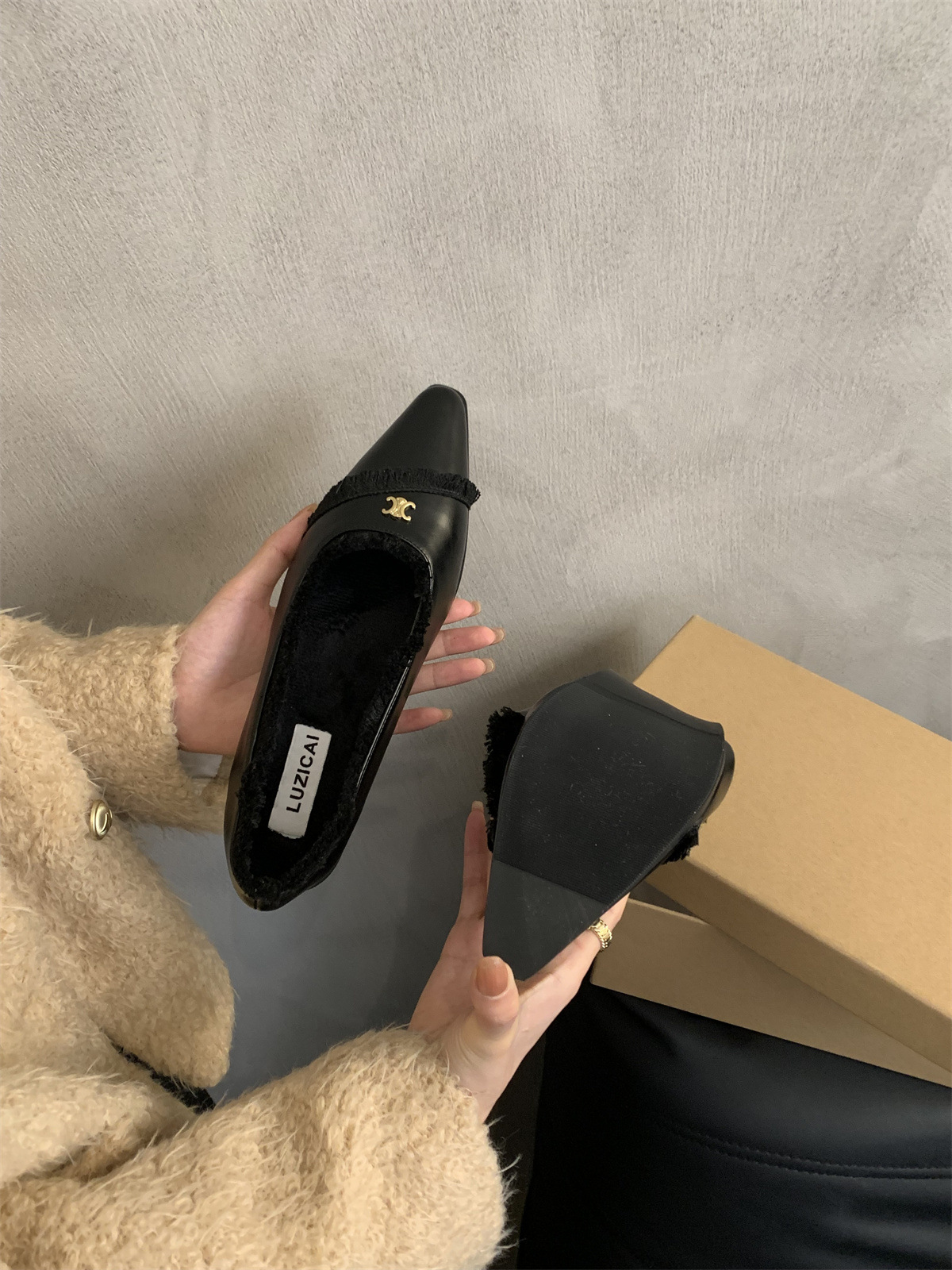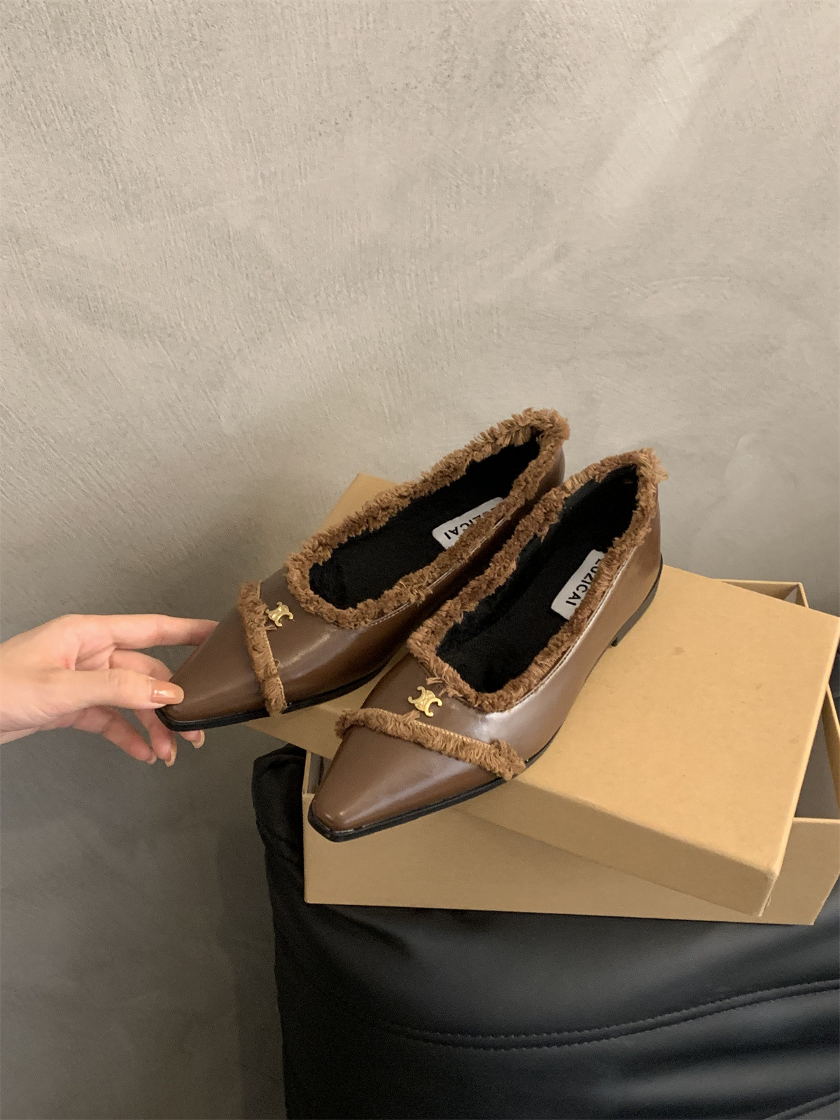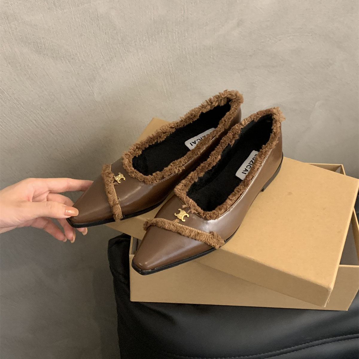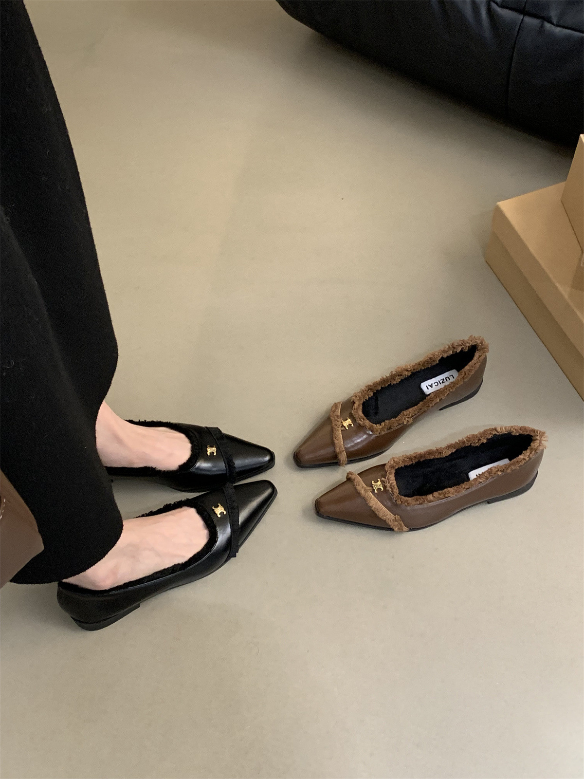 프랑스 스타일의 우아한 뾰족한 발가락 얕은 입 싱글 레이어 신발 여성을위한 기모 2023 새로운 한국식 복고풍 여성용 플랫 슬립 온