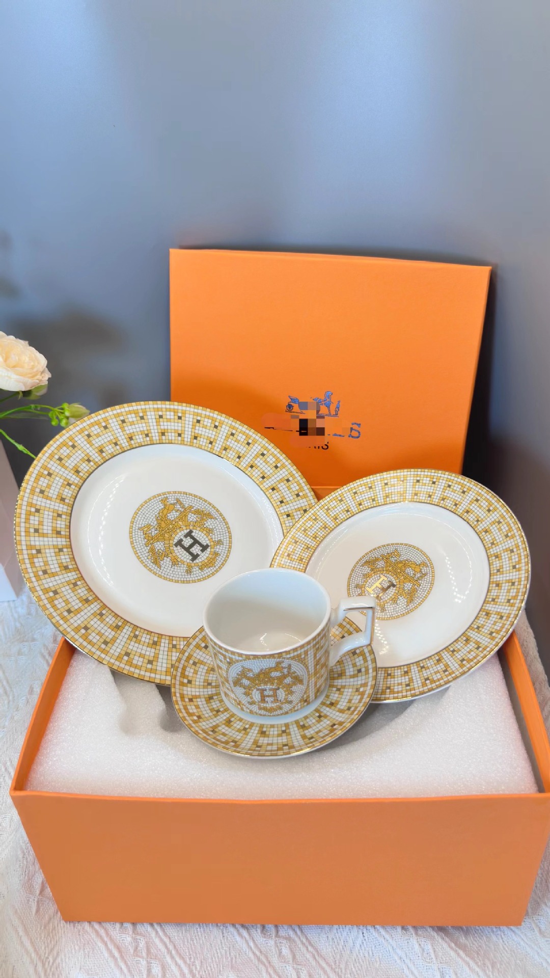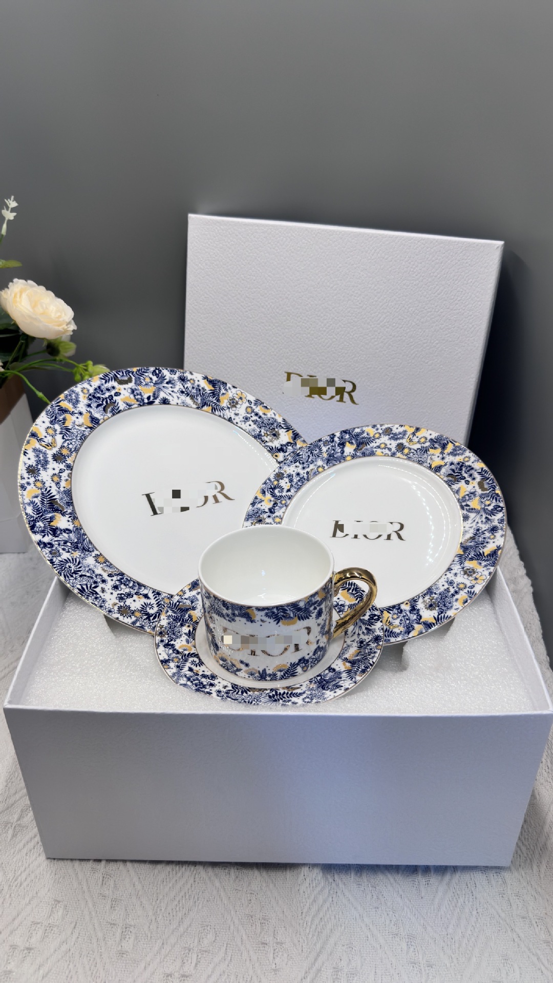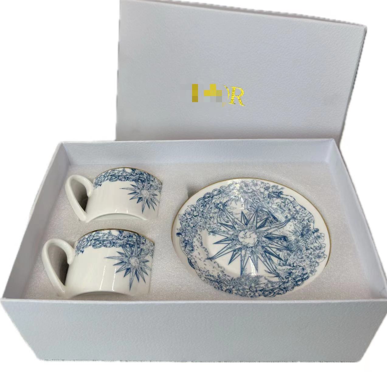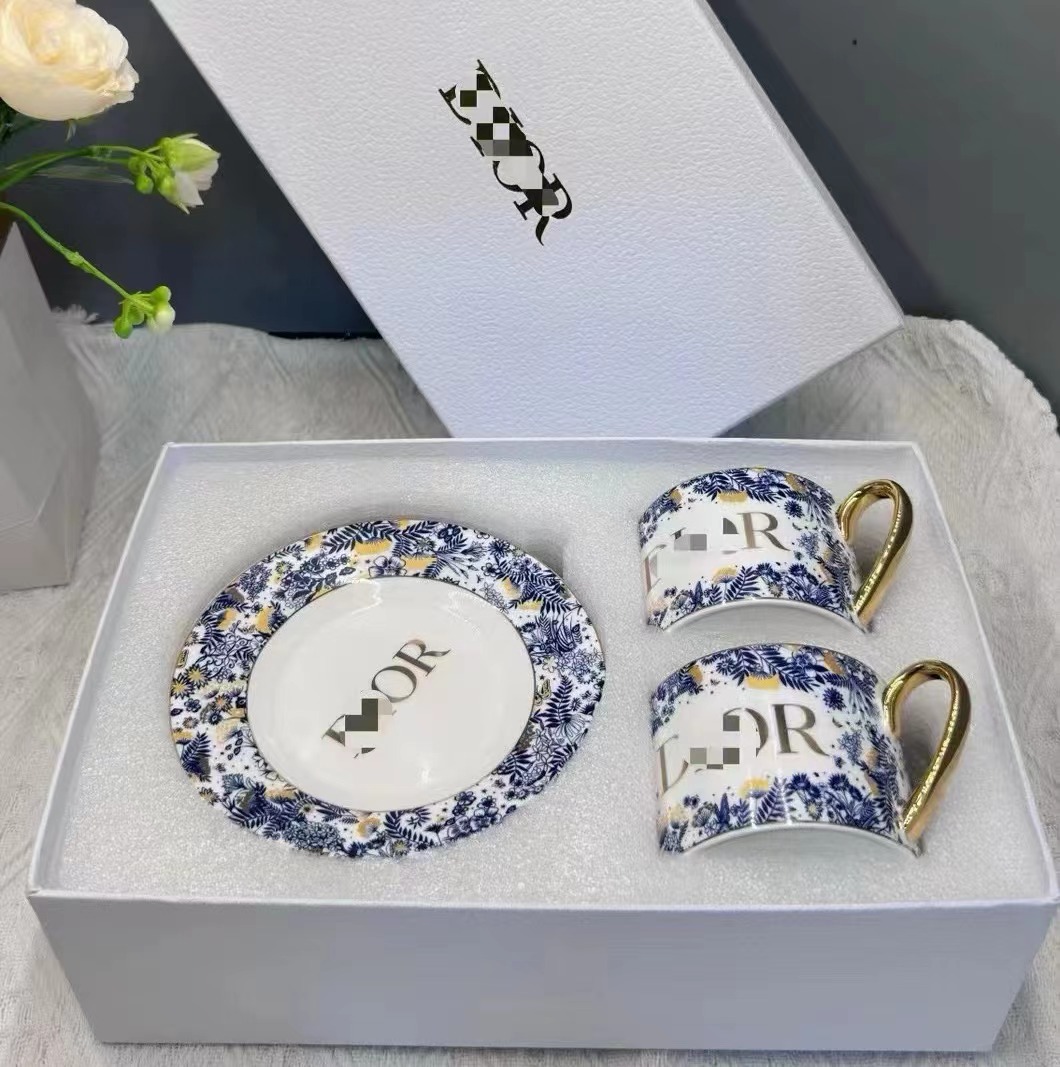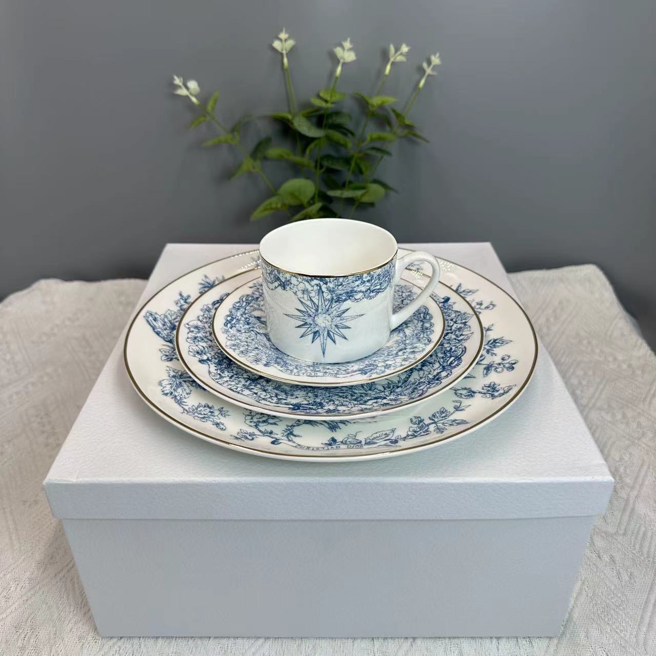 • 파란색과 꽃 더블 컵과 접시