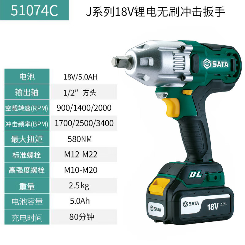SATA J 시리즈 18V 리튬 브러시리스 충격 렌치 51073C 220Nm 1 전원 1 충전