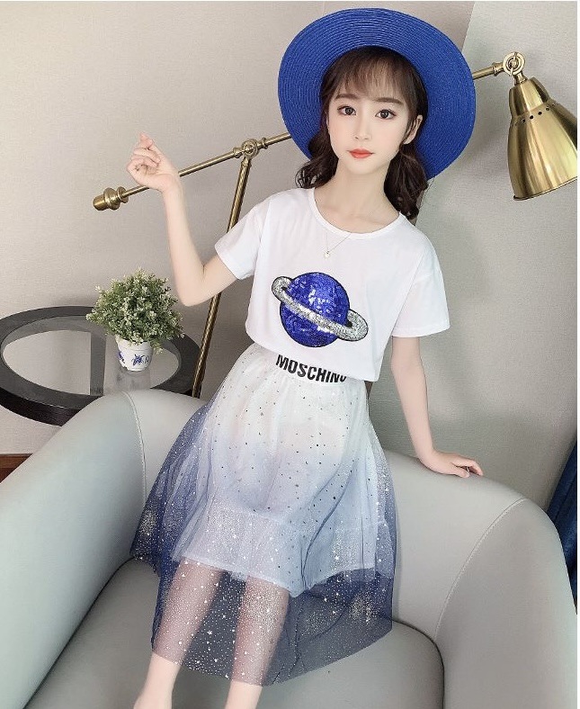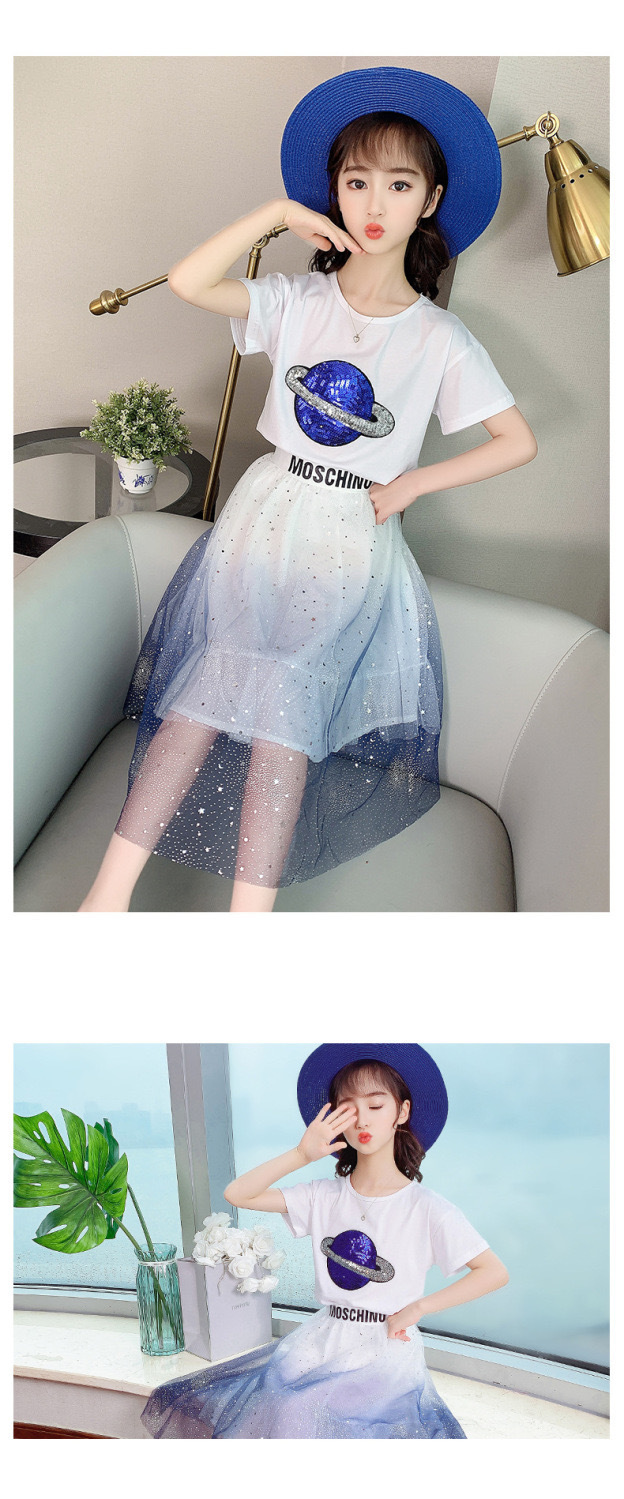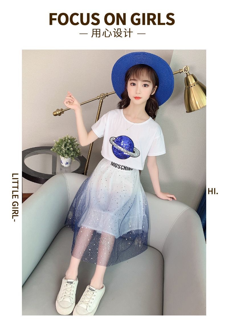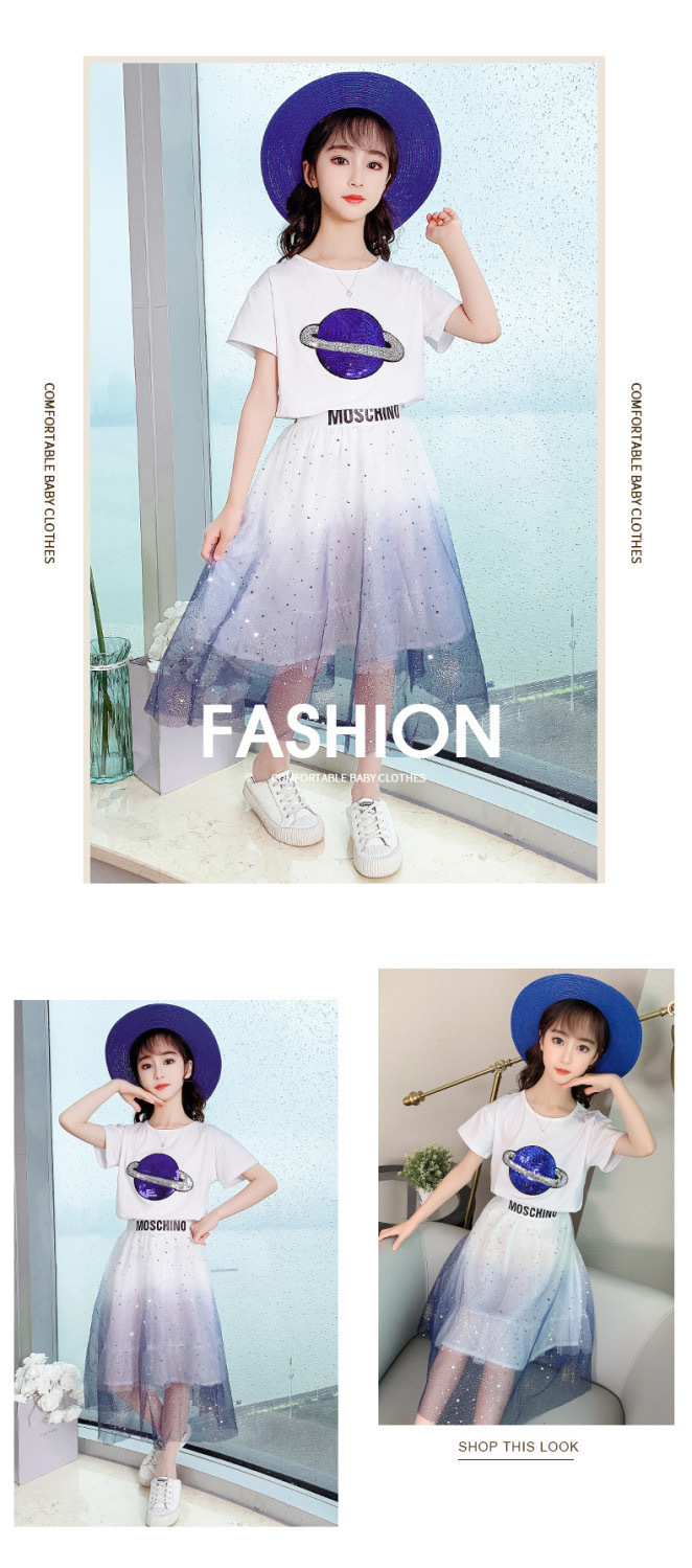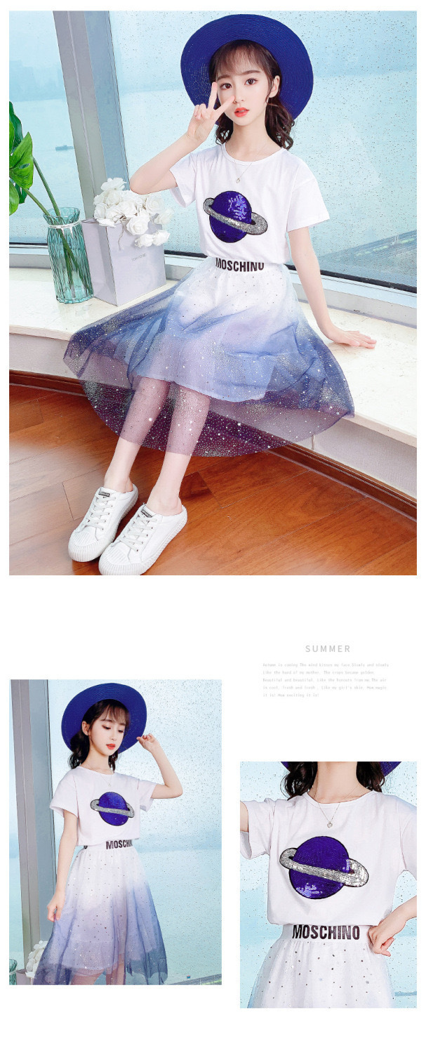 소녀 스커트 세트 2024 반팔 거즈 스커트 유행 별이 빛나는 하늘 빛나는 색상 변경 스커트 서양식 투피스 얇은스토어 가기