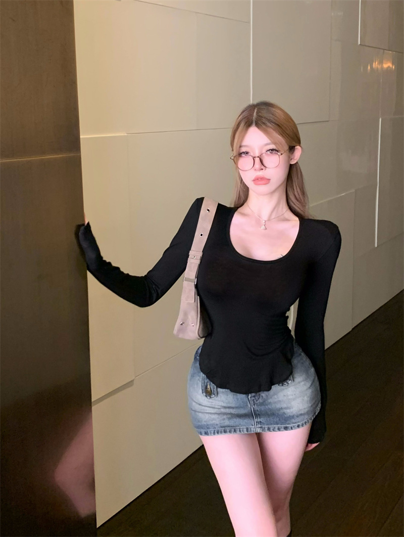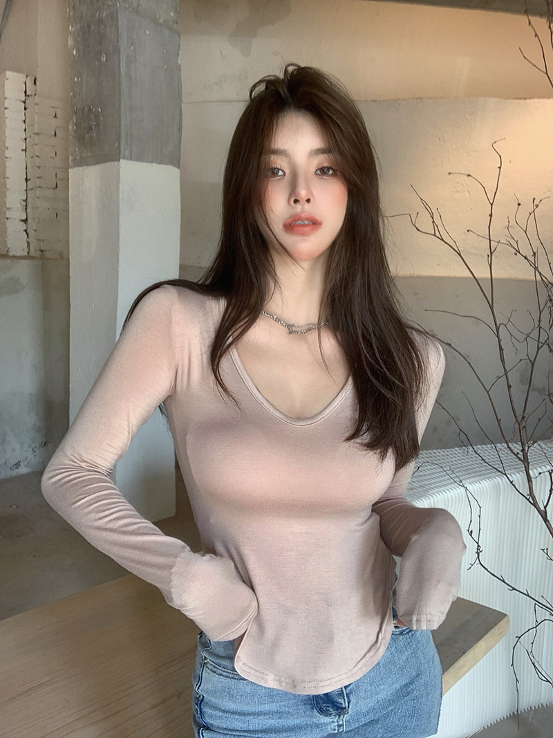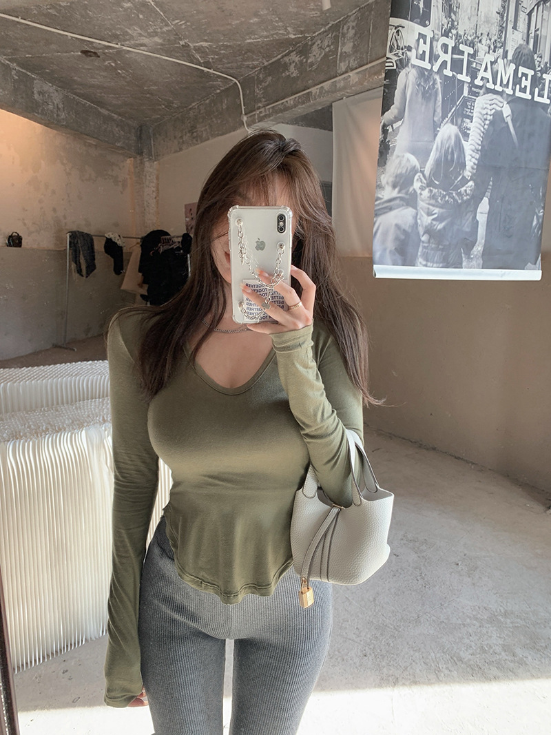 섹시한 퓨어 스파이스 걸 U 칼라 불규칙한 티셔츠 여성용 봄과 가을 슬림핏 긴 소매 내베이스 셔츠 탑 도매스토어 가기