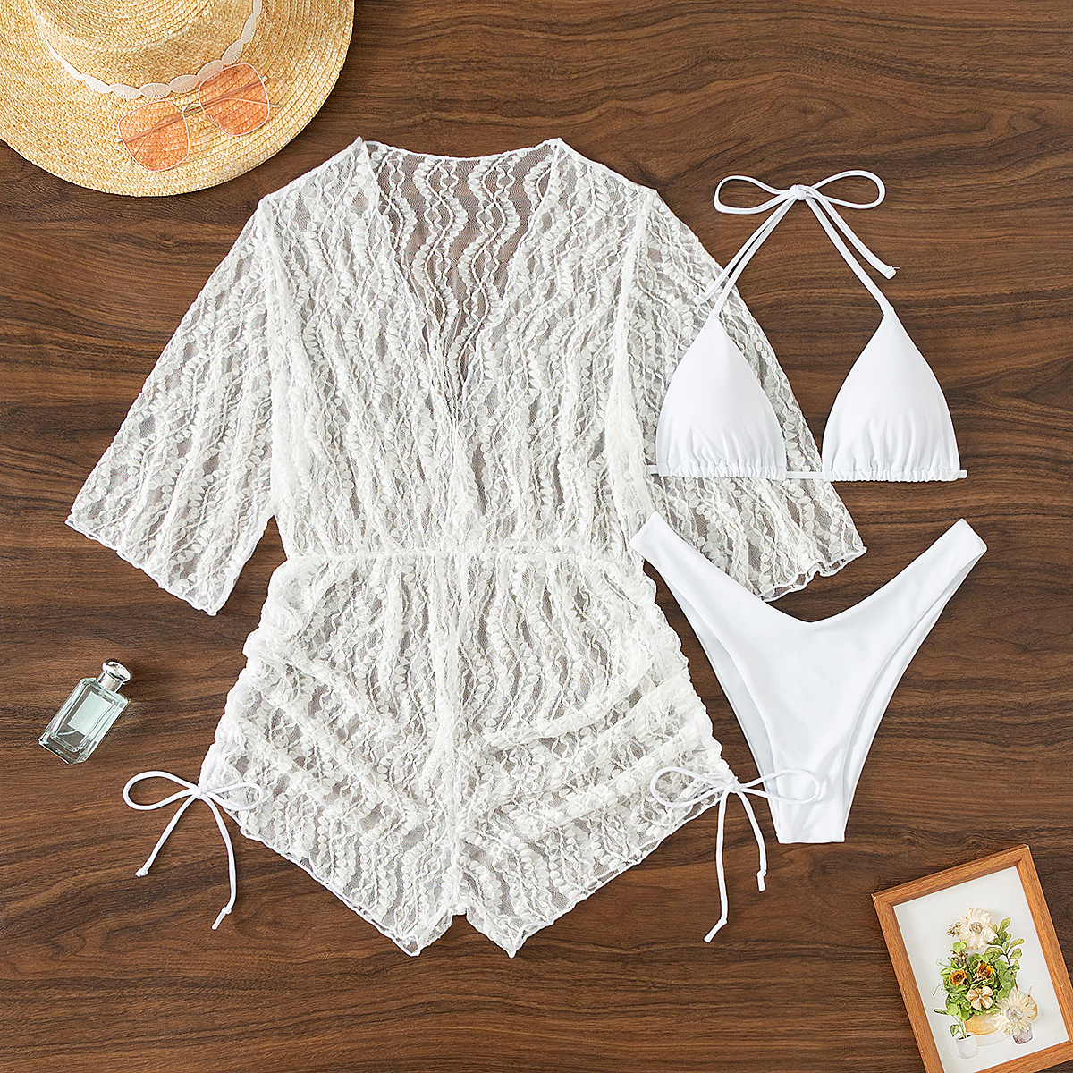 국경을 넘는 새로운 유럽과 미국의 수영복 레이스 비키니 메쉬 3 피스 세트 섹시한 등이없는 분할 비키니 수영복스토어 가기