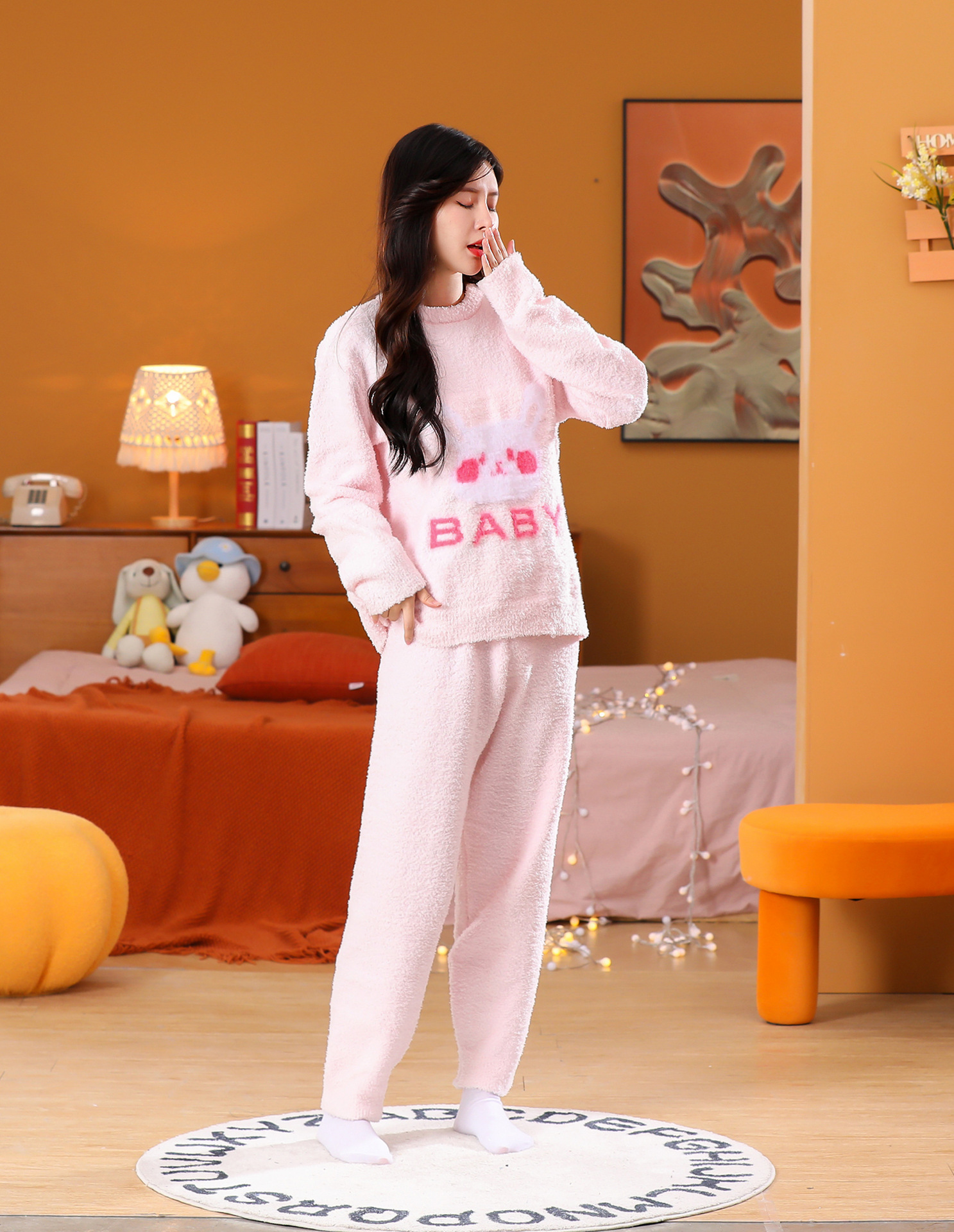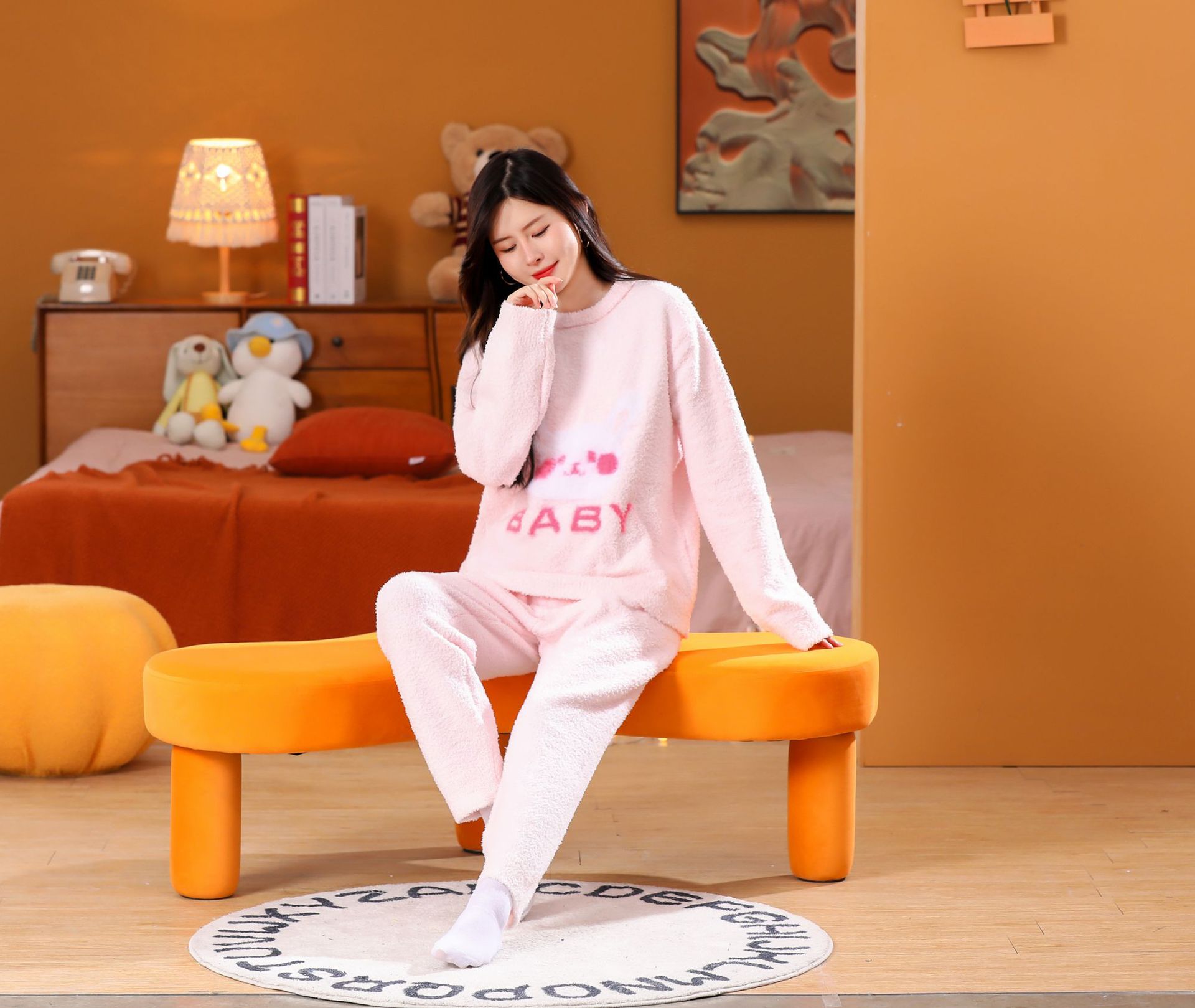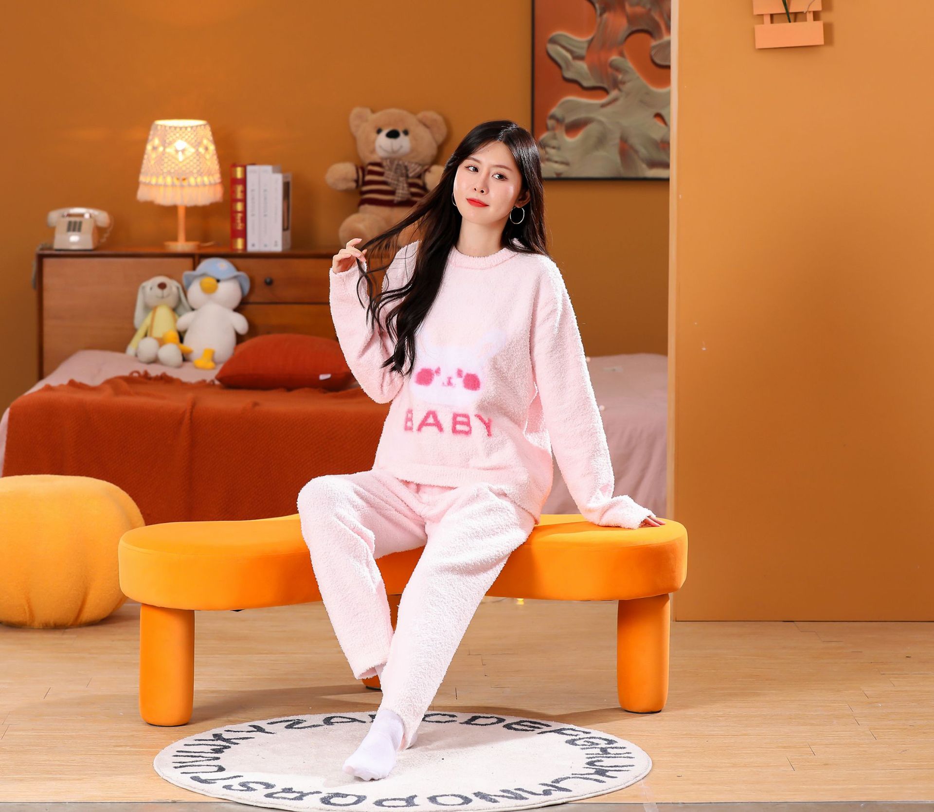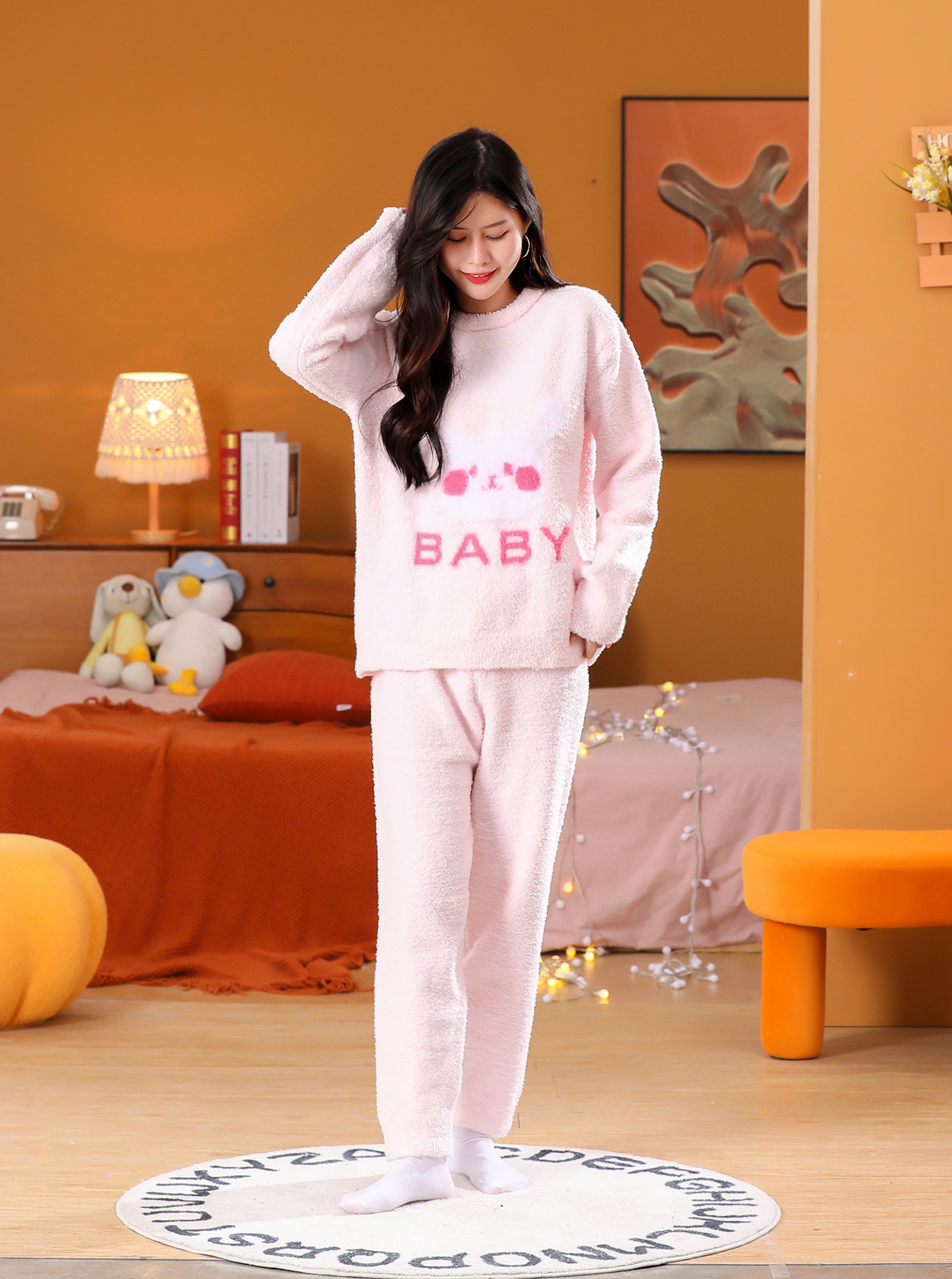 가을과 겨울 산호 양털 핑크 잠옷 긴팔 홈웨어 여성의 귀여운 토끼 따뜻한 반 벨벳 세트스토어 가기