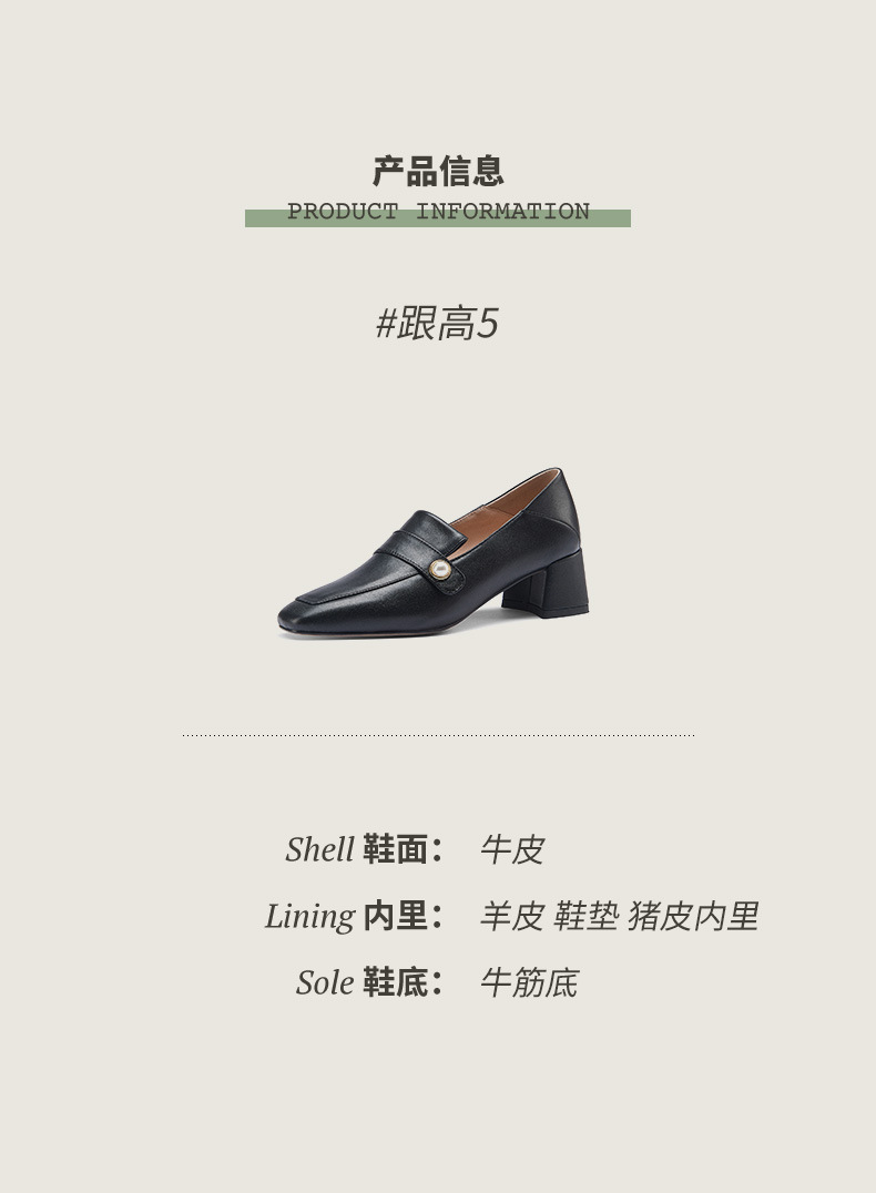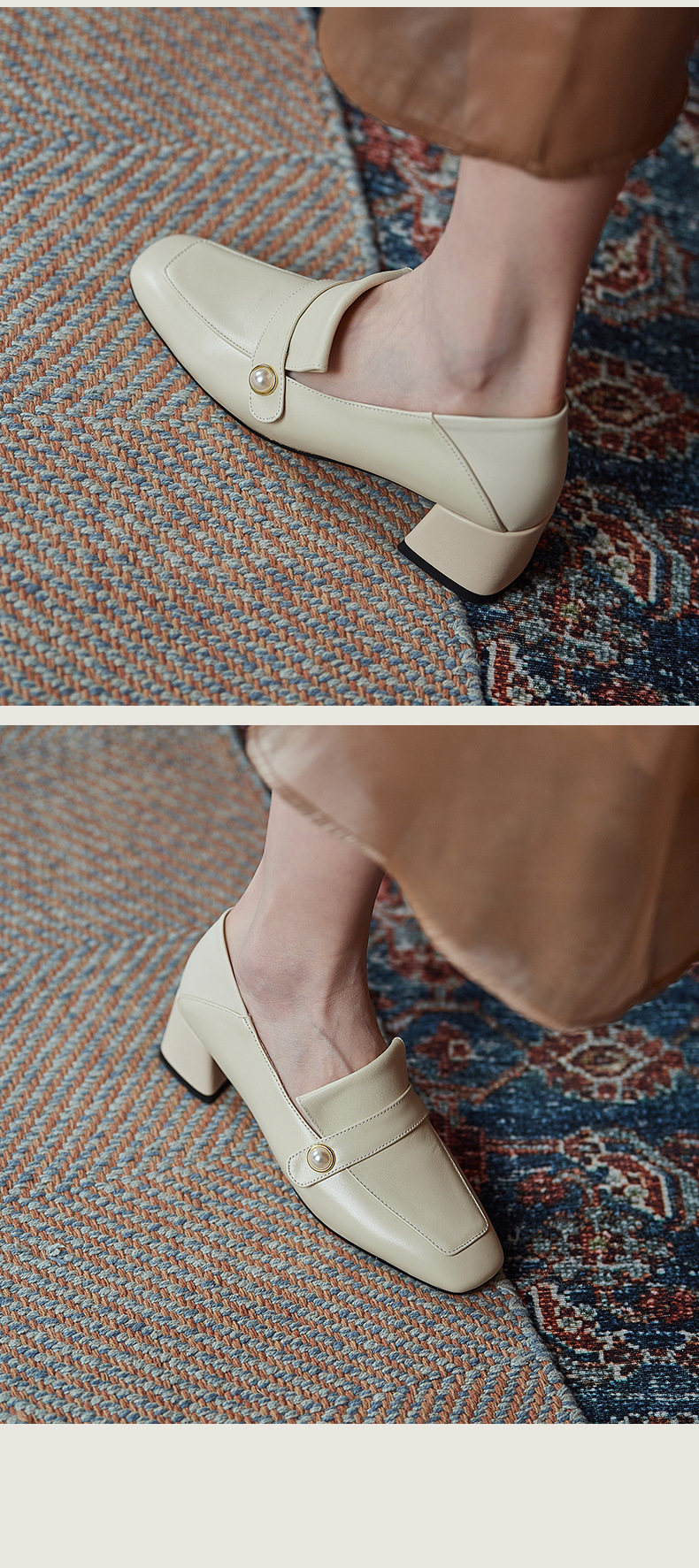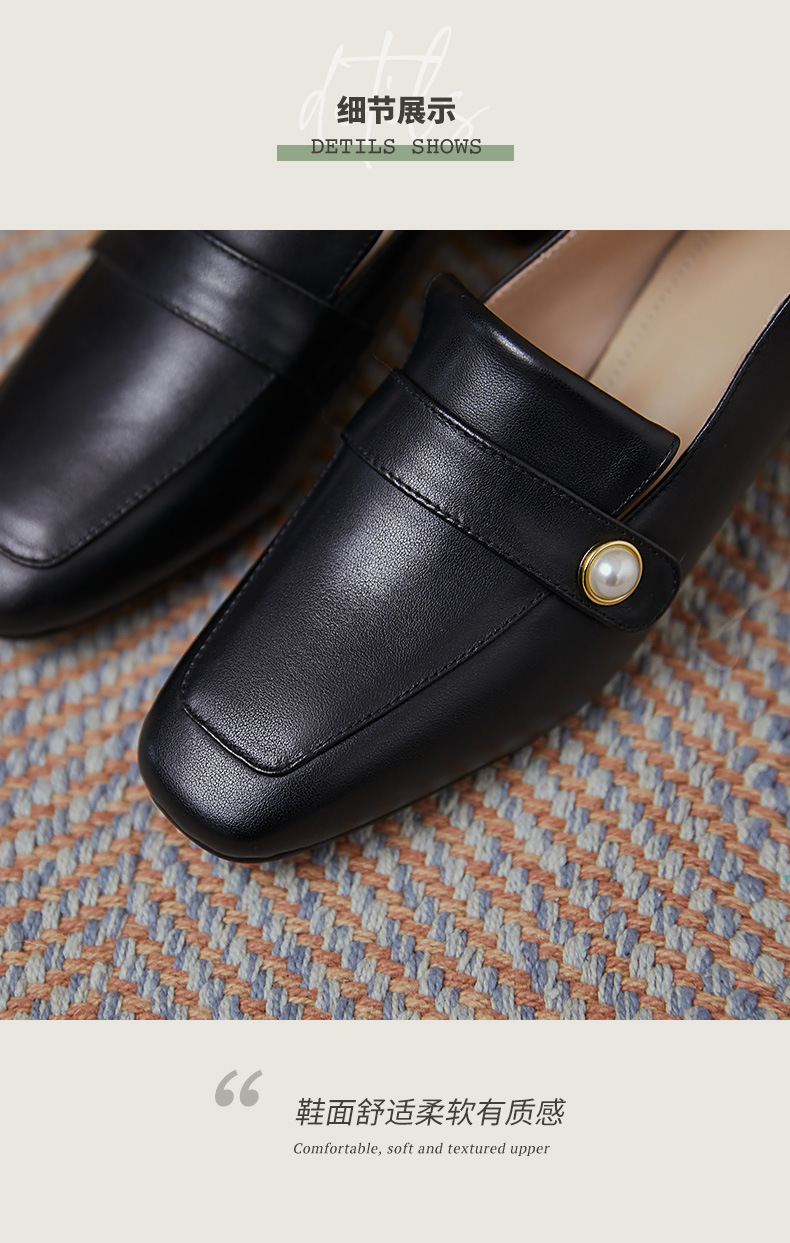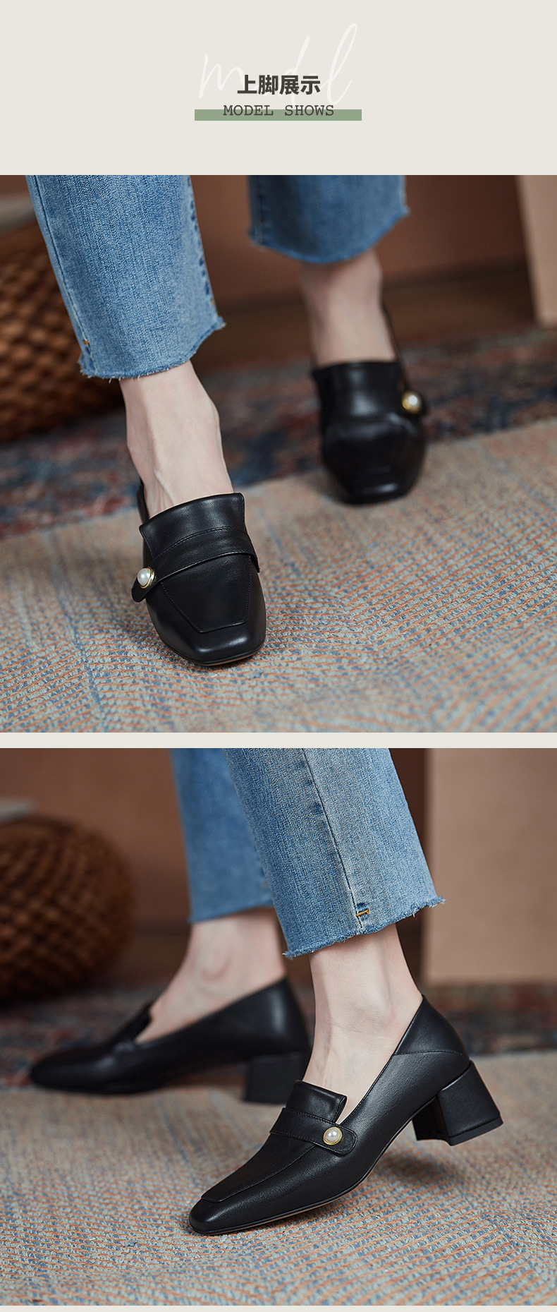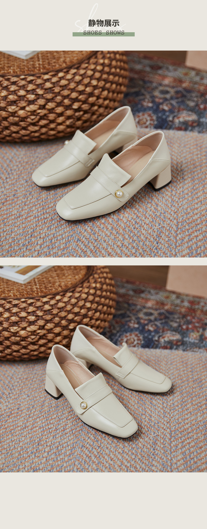 프랑스 캐주얼 스퀘어 토 깊은 입 가죽 신발 여성 봄과 여름 새로운 정품 가죽 스텝 힐 통근 청키 힐 미드 하이힐 신발