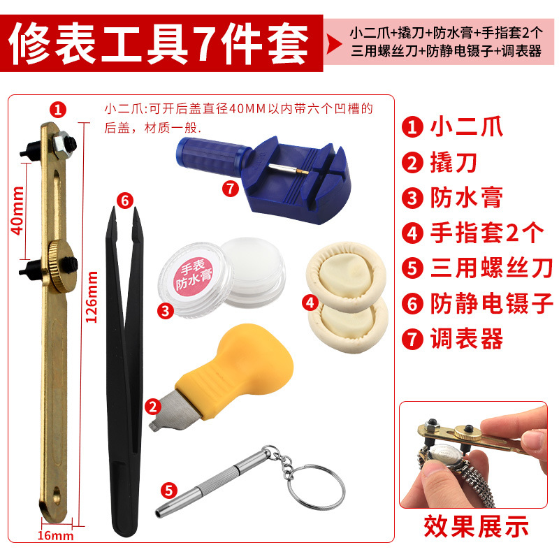 • Pry 나이프 + 방수 크림 + 핑거 슬리브 2 + 3 목적 스크루 드라이버 + 플라스틱 핀셋 + 시계 조절기