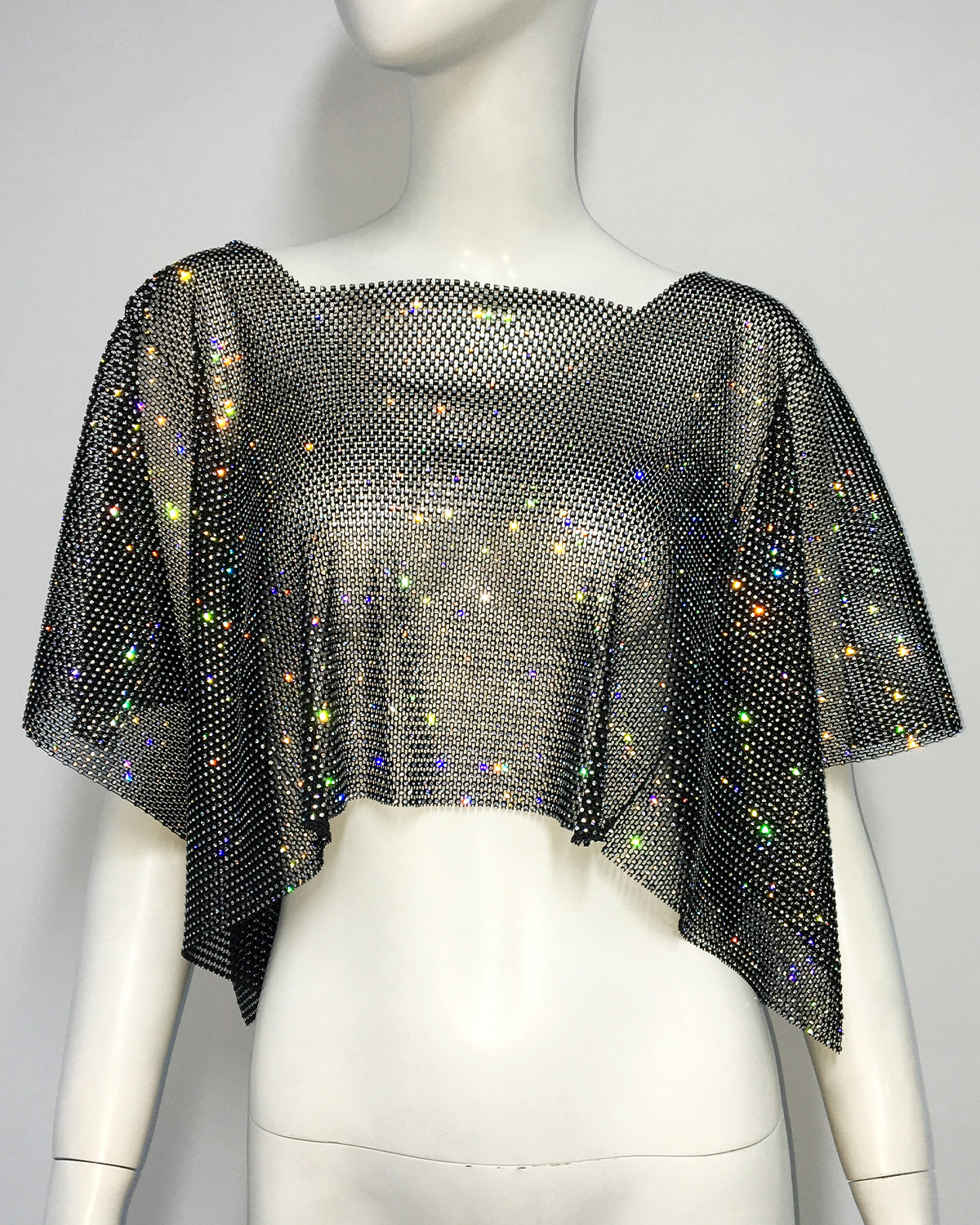 2024 유럽과 미국의 봄 여성의 새로운 티셔츠 패션 모조 다이아몬드 드롭 숄더 짧은 소매 스퀘어 칼라 티셔츠 고급 핫 걸 탑