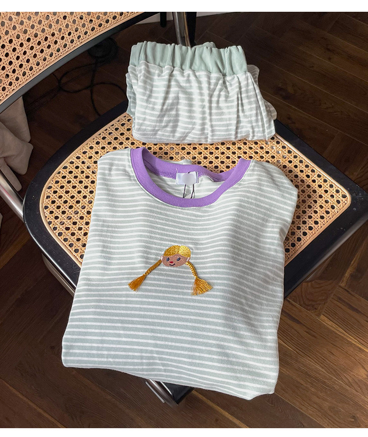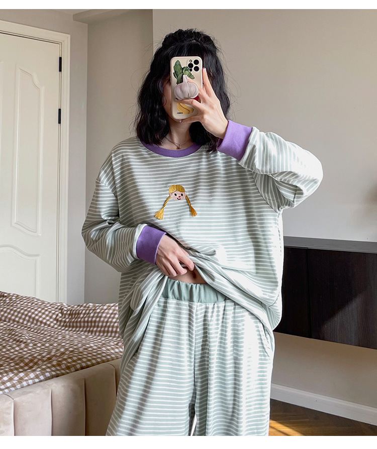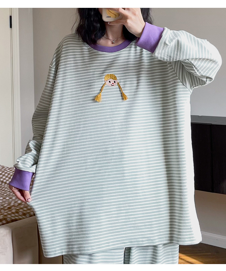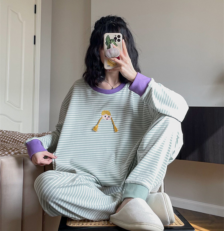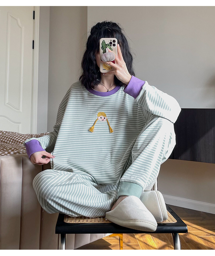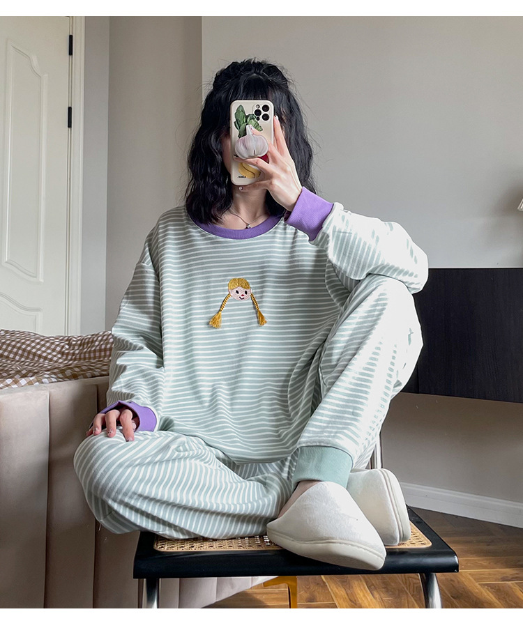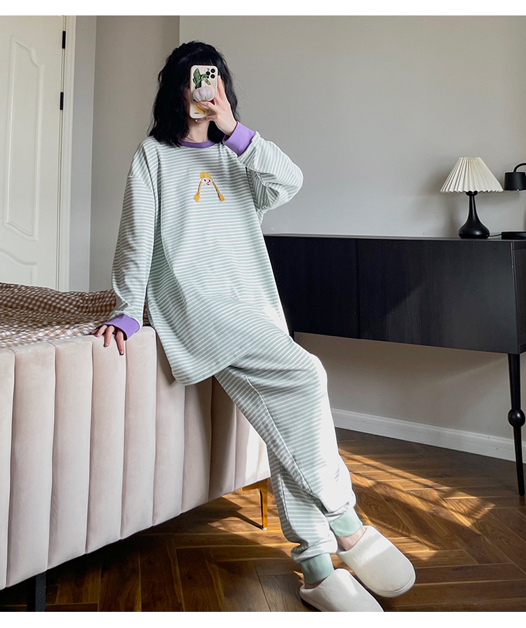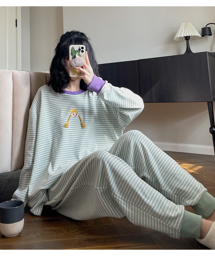 머리띠 소녀 줄무늬 잠옷 여성의 봄과 가을 긴팔 코튼 캐주얼 귀여운 홈웨어 플러스 사이즈 세트스토어 가기