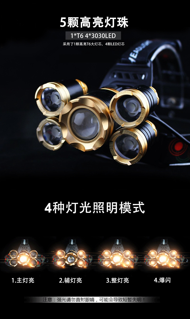 • BZM254 삼성 홀 충전 스트레치 줌 유도 전체 플라스틱 헤드 램프 2 1200MAH18650 리튬 배터리 (금)