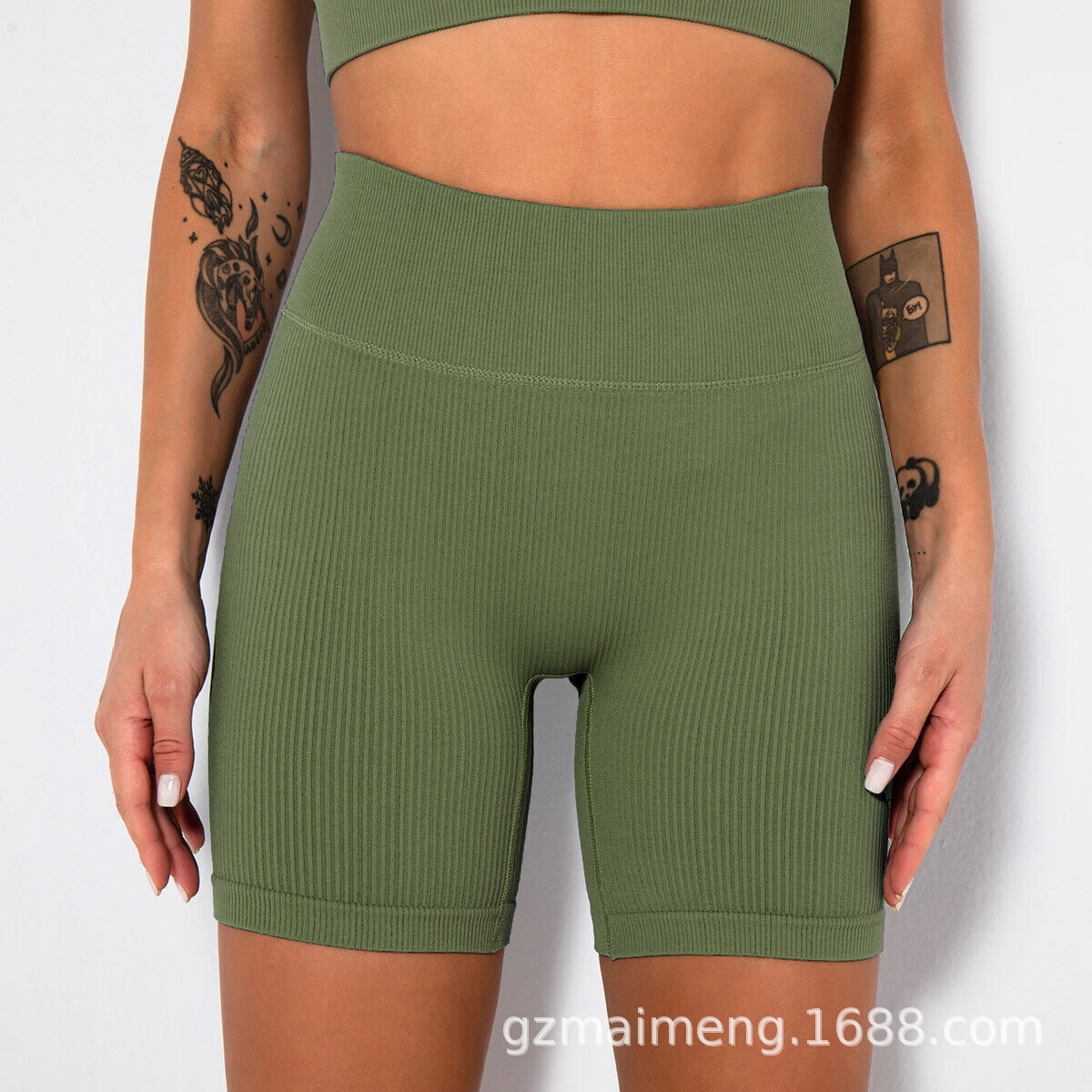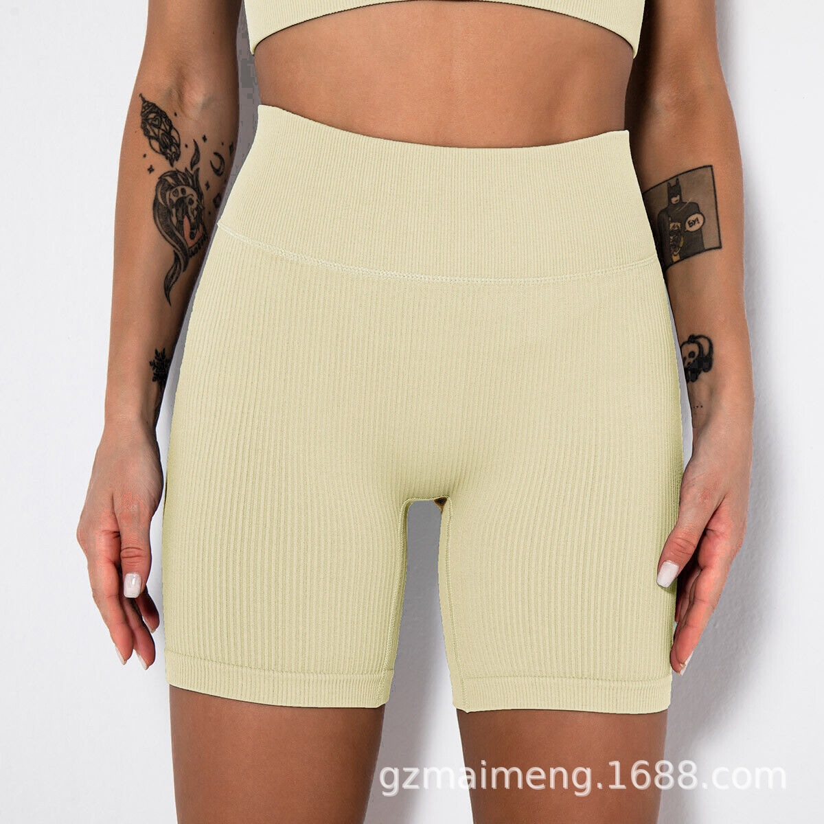 유럽과 미국의 새로운 단색 갈비 요가 반바지 여성을위한 높은 허리 엉덩이 단단한 탄성 통기성 원활한 스포츠 피트니스 바지스토어 가기