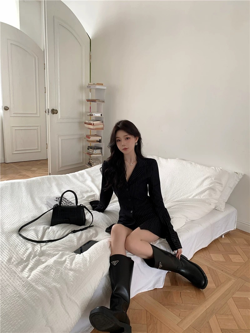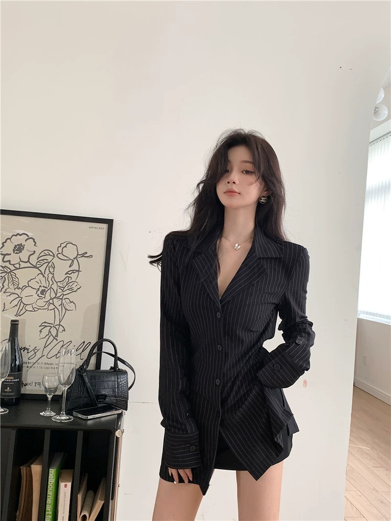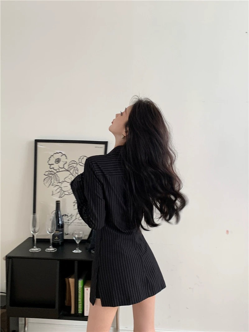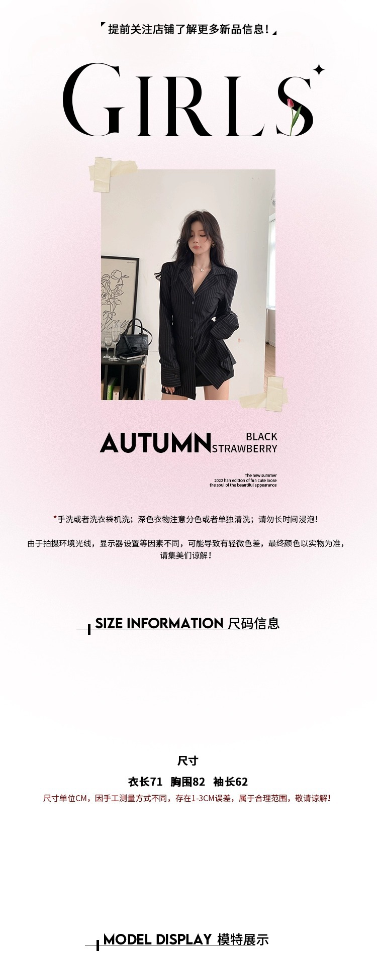 블랙 스트라이프 긴팔 셔츠 여성용 가을 2025 신상 스타일리시하고 다재다능한 슬림핏 허리라인 강조 중간 길이 상의스토어 가기