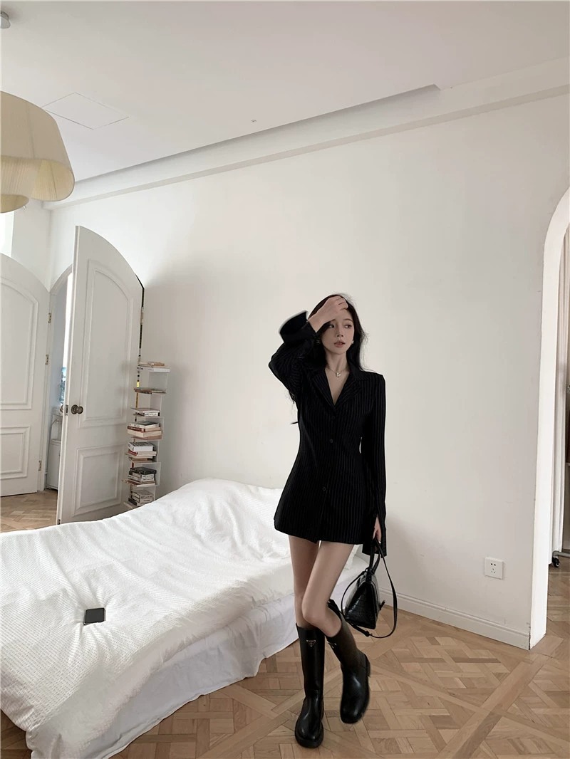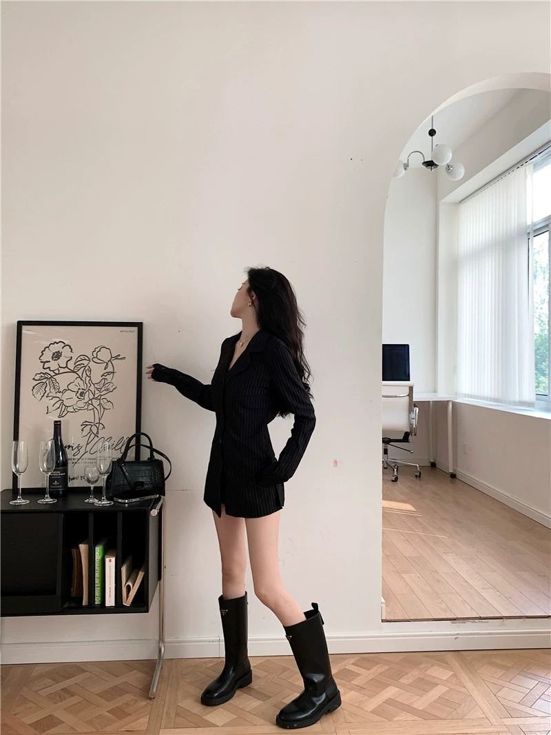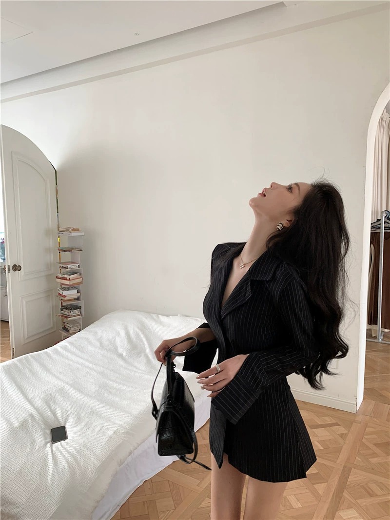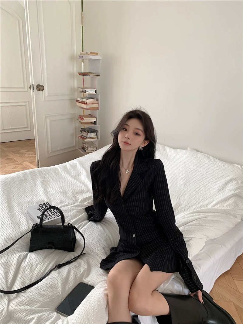 블랙 스트라이프 긴팔 셔츠 여성용 가을 2025 신상 스타일리시하고 다재다능한 슬림핏 허리라인 강조 중간 길이 상의스토어 가기