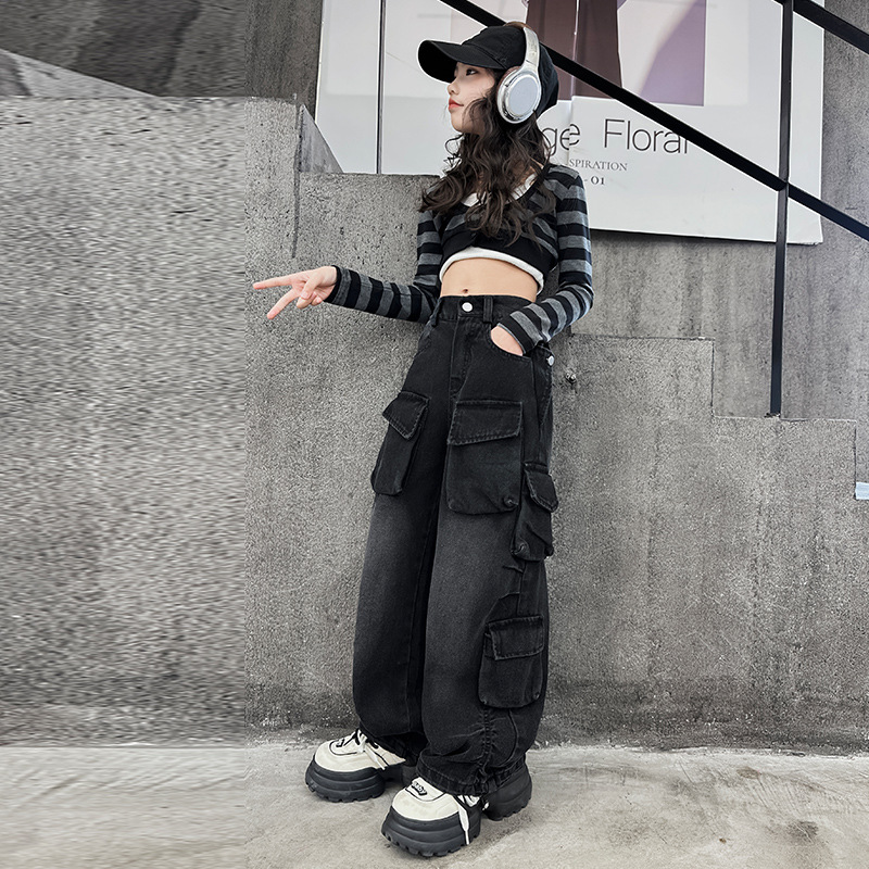 여아 2025 봄, 가을 새로운 스타일 데님 작업복 트렌디하고 멋진 스트리트 댄스 공연 의류 큰 주머니가 있는 큰 어린이를 위한 바지