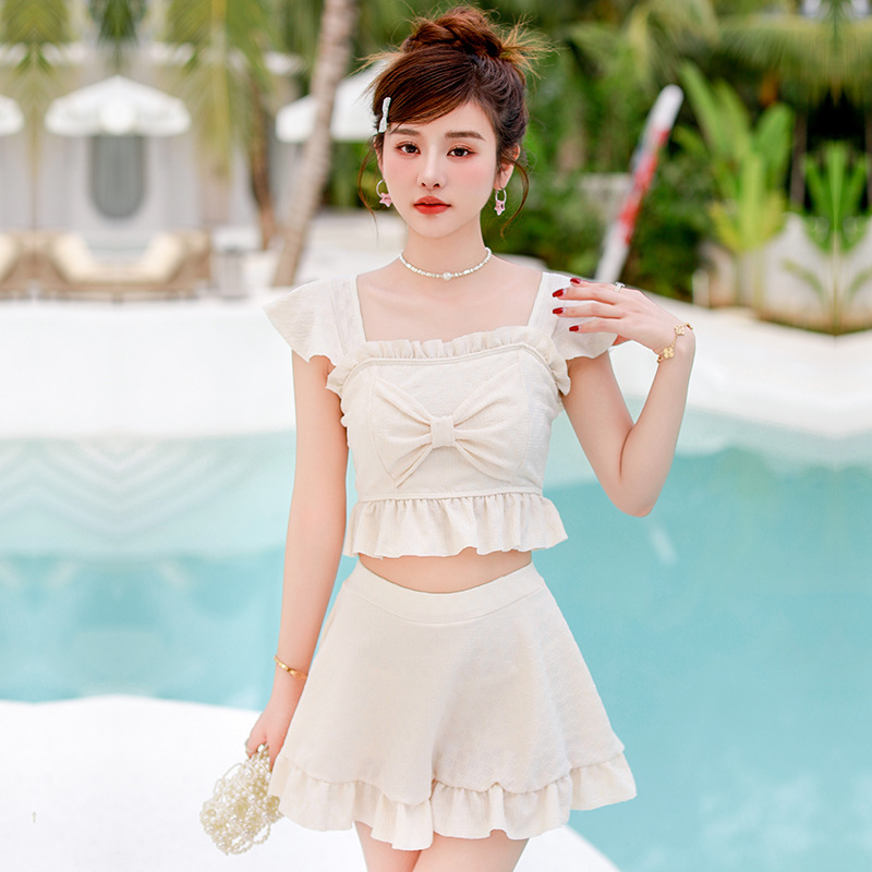 여성 투피스 수영복 새로운 한국 단색 패션 요정 스타일 보수적 인 소녀 슬리밍 작은 가슴 푸시 업 온천 수영복