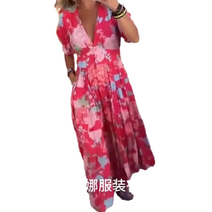 2024 새로운 플러스 사이즈 슈퍼 페어리 높은 탄성 V 넥 꽃 원피스 해변 휴가 해변 원피스 느슨한 긴 원피스스토어 가기