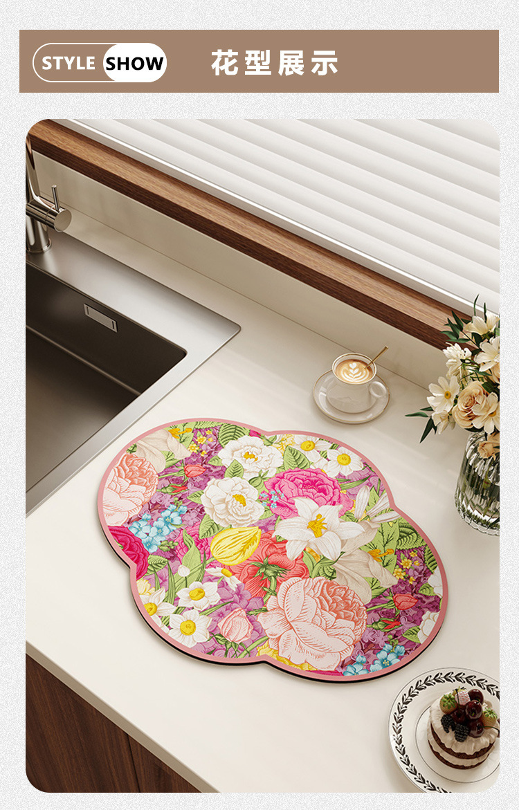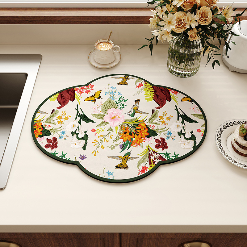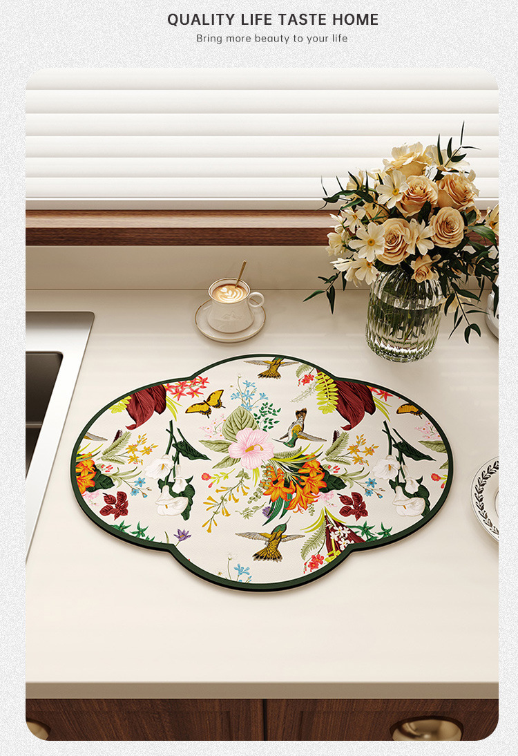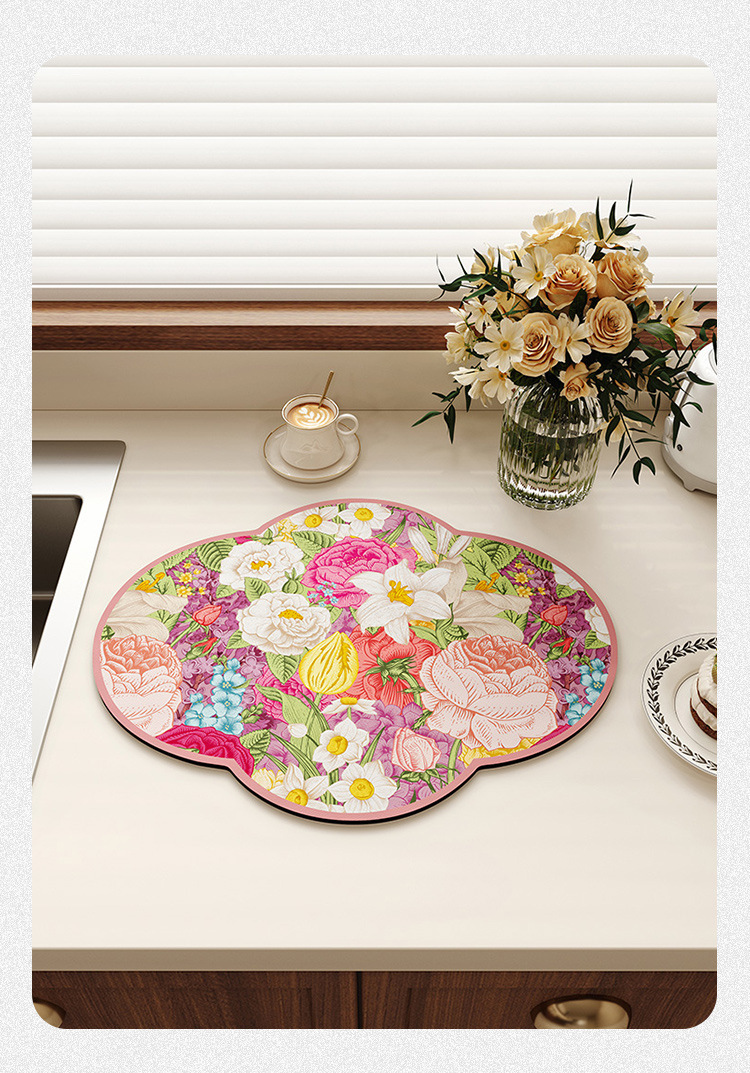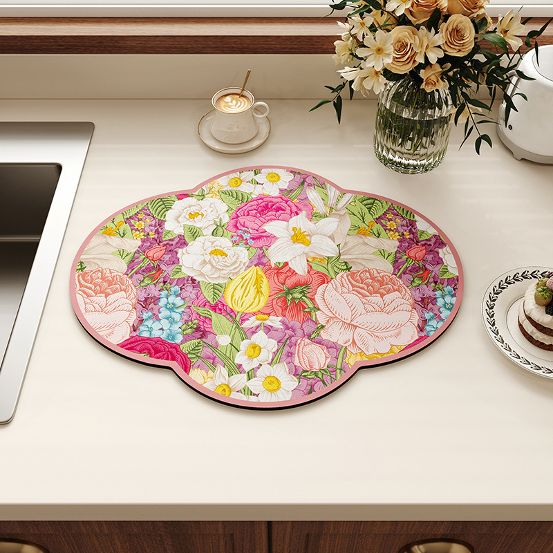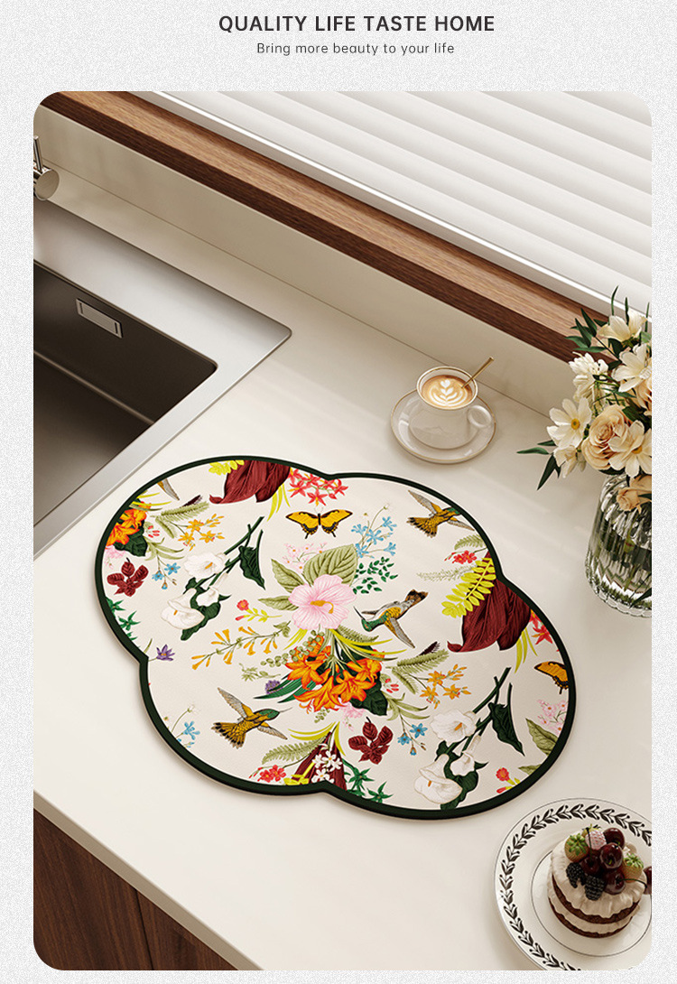 새로운 중국 스타일의 꽃 모양의 주방 플레이스 매트 흡수성 미끄럼 방지 배수 매트 가정용 diatom 진흙 테이블 매트 그릇 매트