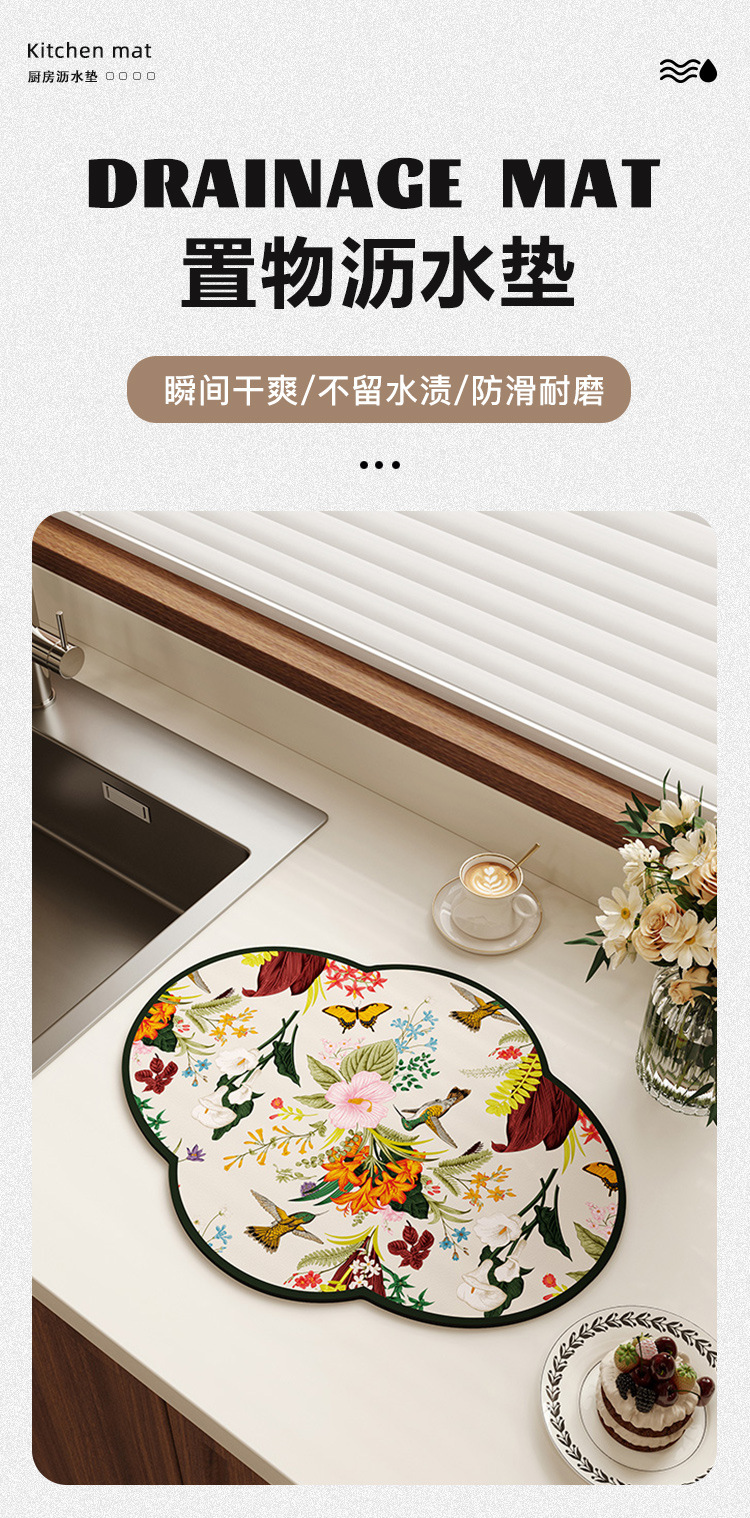 새로운 중국 스타일의 꽃 모양의 주방 플레이스 매트 흡수성 미끄럼 방지 배수 매트 가정용 diatom 진흙 테이블 매트 그릇 매트스토어 가기