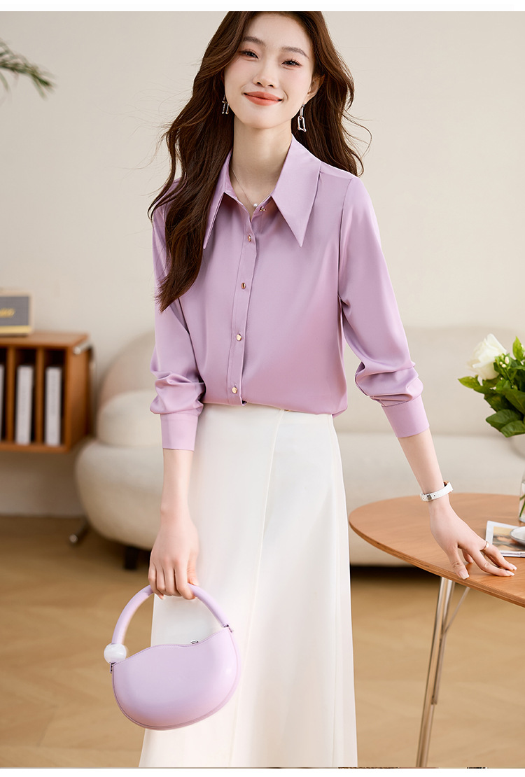 초봄 유행 서양식 OL 통근 슬리밍 간단한 광택 셔츠를 2024 여성을위한 보라색 아세테이트 새틴 긴팔 셔츠