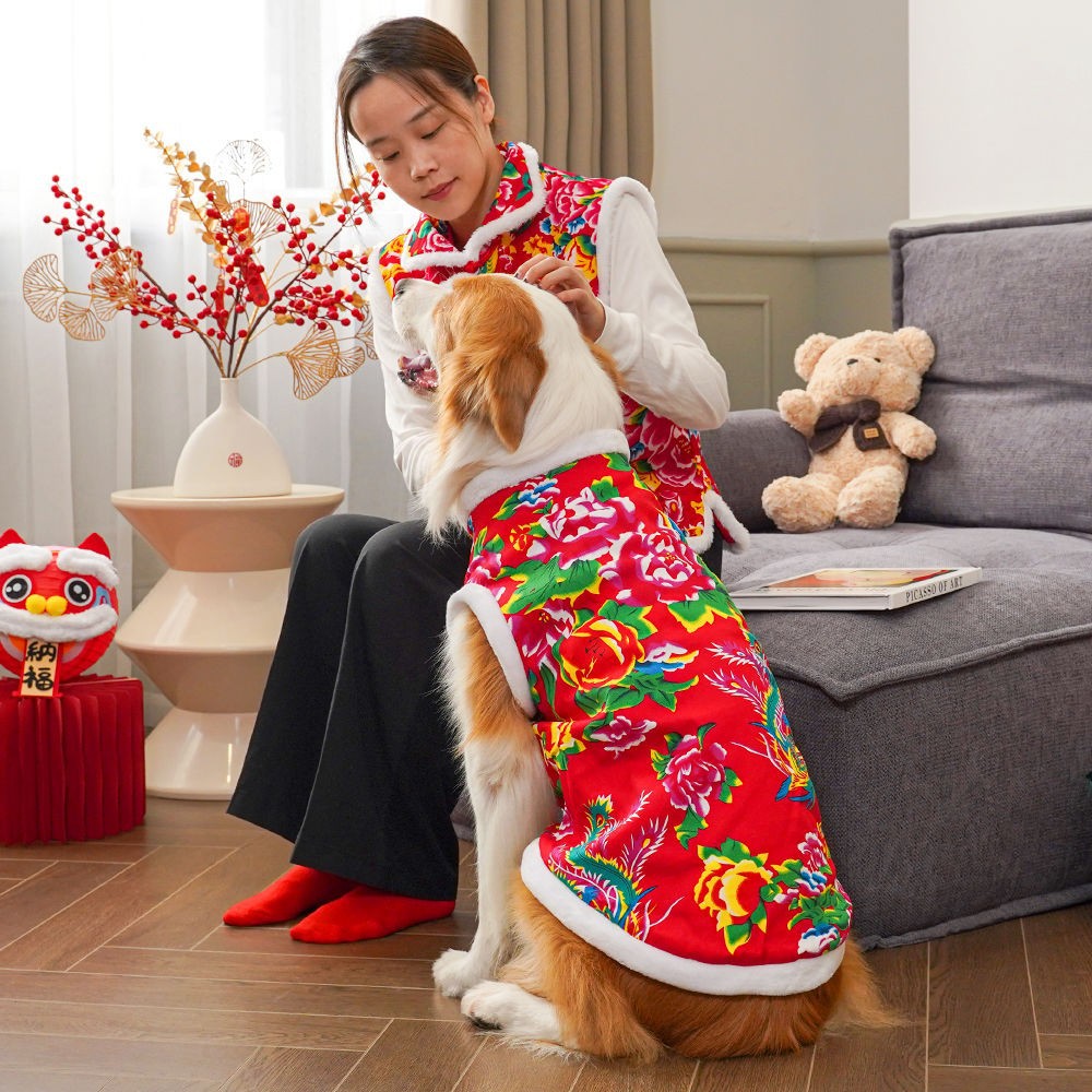 강아지 가을 겨울 신년 조끼 모자 동북풍 대형 꽃무늬 자켓 두꺼운 면 테디 프렌치불독 애완동물 의류 용품 도매