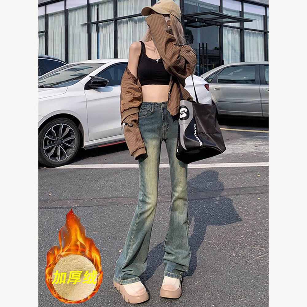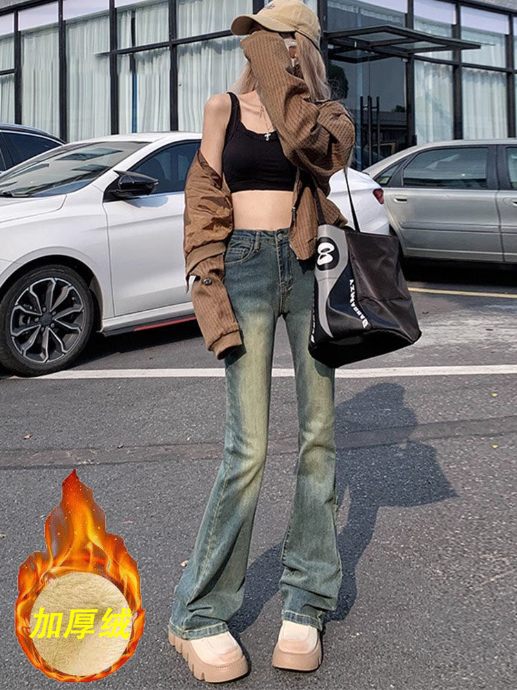 틈새 미국 복고풍 기모 두꺼운 청바지 여성의 겨울 새로운 슬림 핏 슬리밍 디자인 센스 걸레 바지