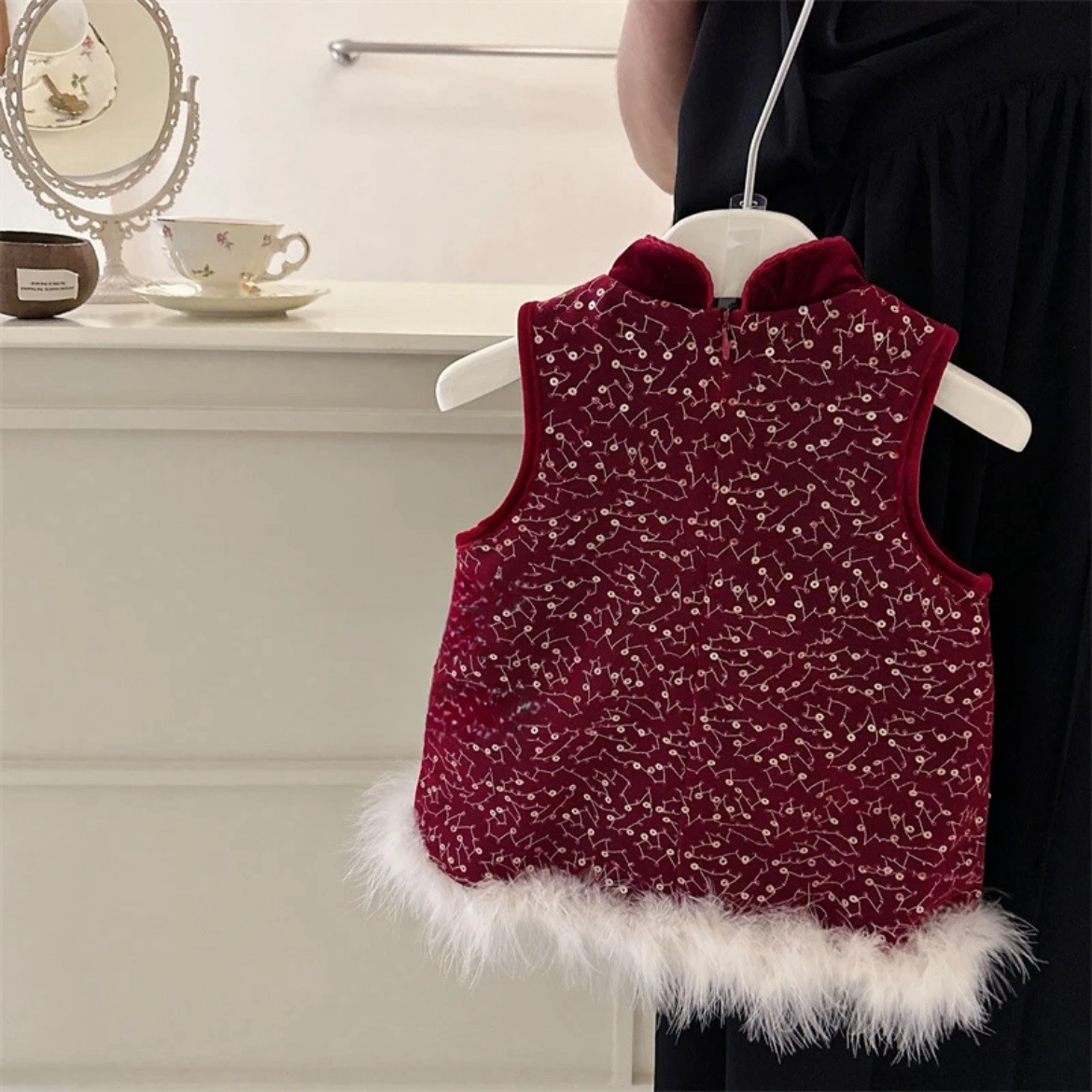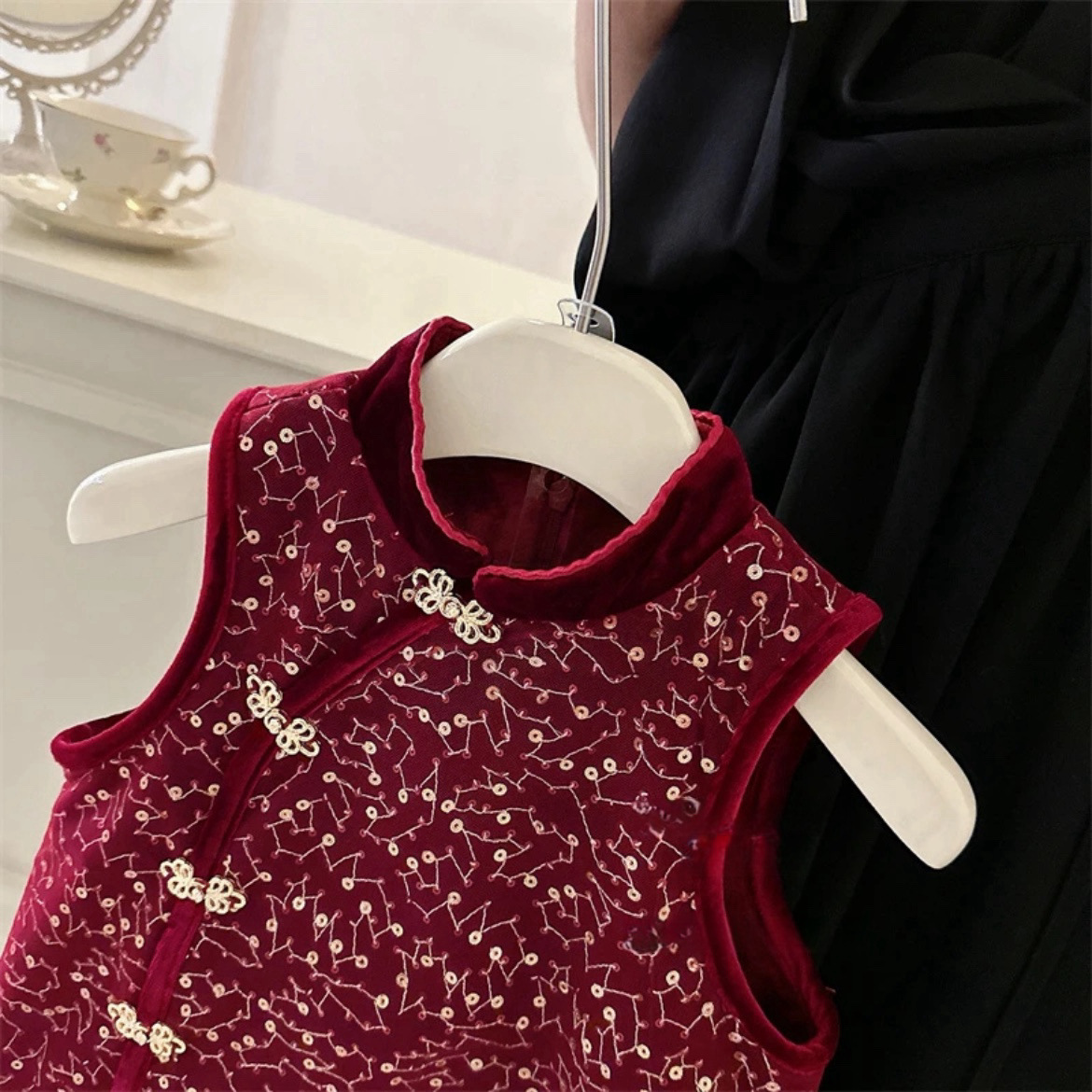 女童旗袍连衣裙加绒2023新款洋气冬装宝宝周岁礼服儿童红色拜年服