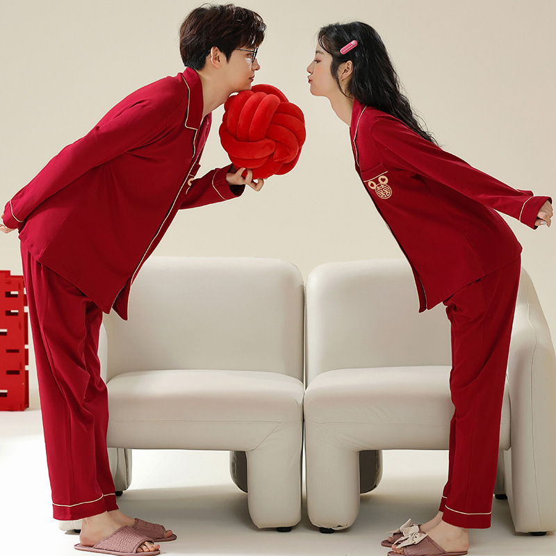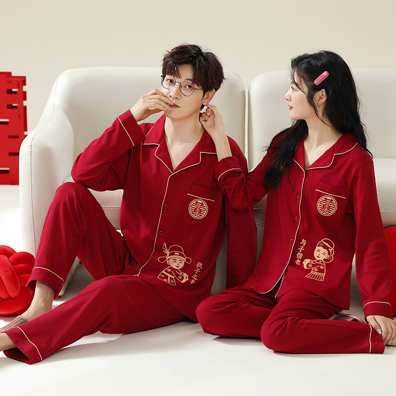 가을과 겨울 커플 잠옷 옷깃 긴 소매 양면면 커플 축제 결혼식 빨간 가정복 잠옷 세트스토어 가기
