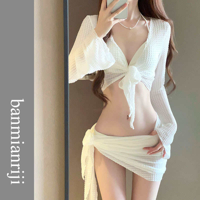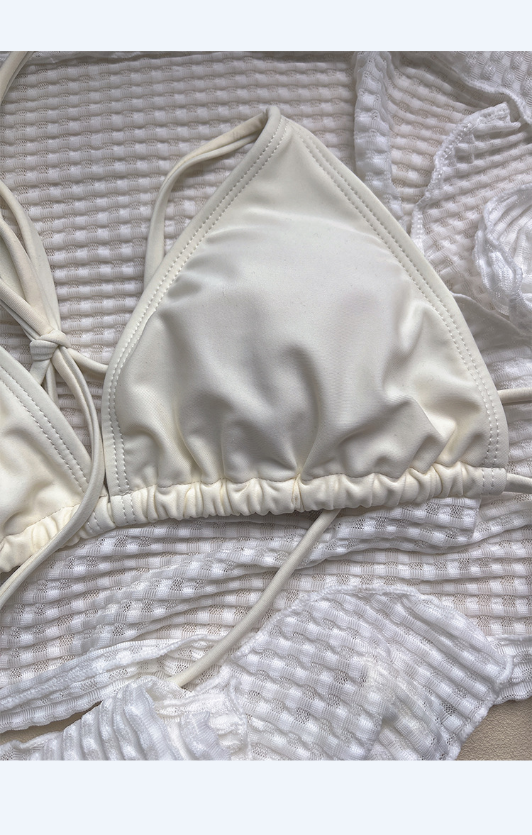 비키니 4 피스 스플릿 화이트 페어리 스타일 2023 새로운 수영복 여성 레이스 업 할로우 해변 온천 휴가