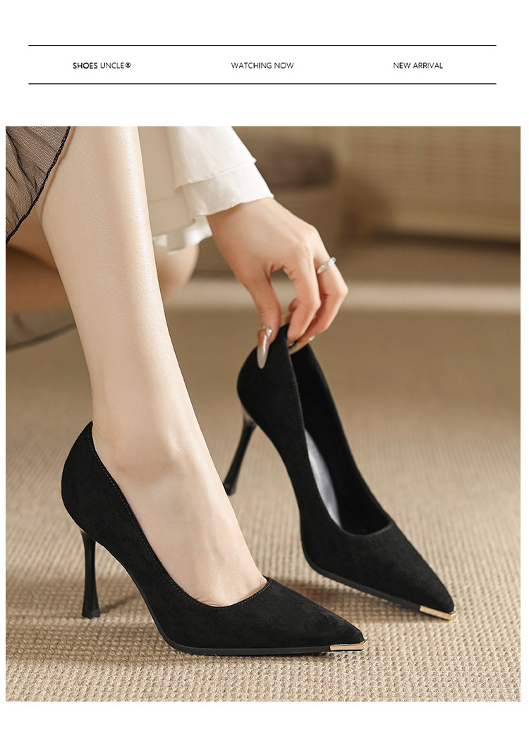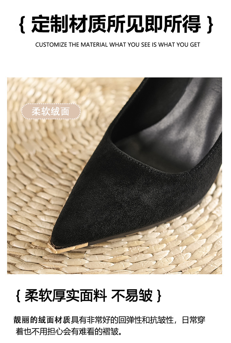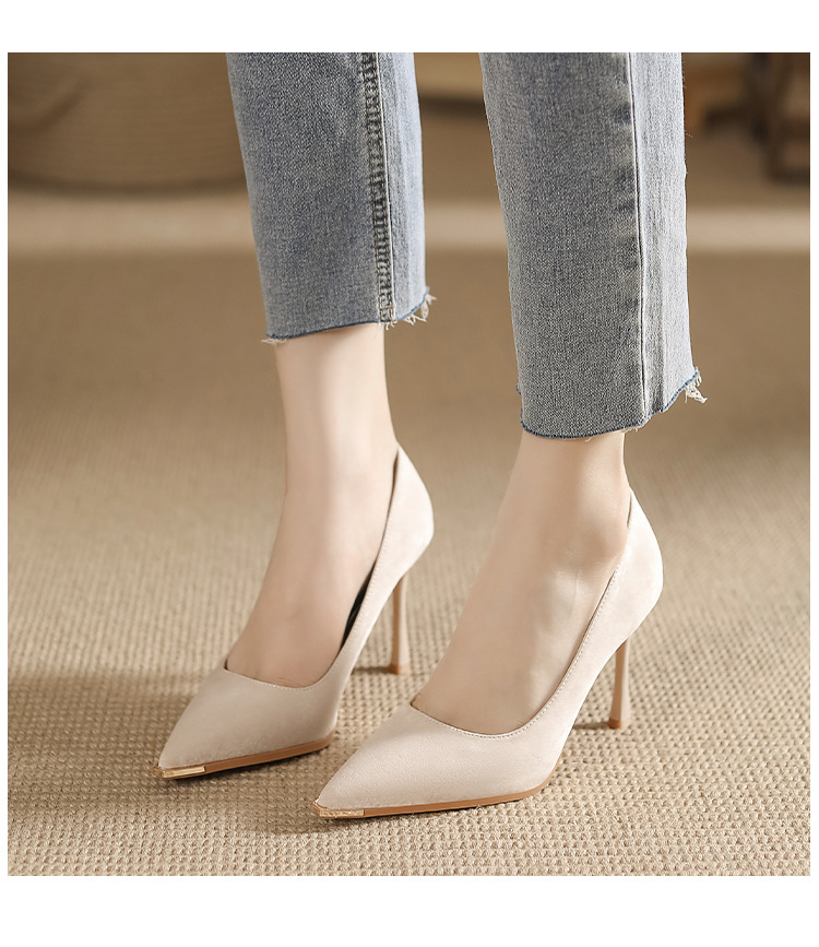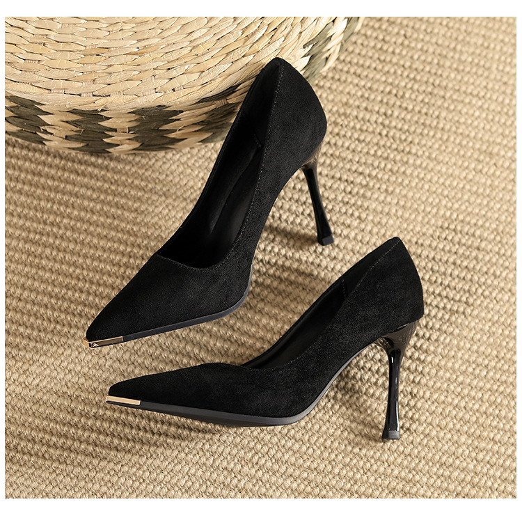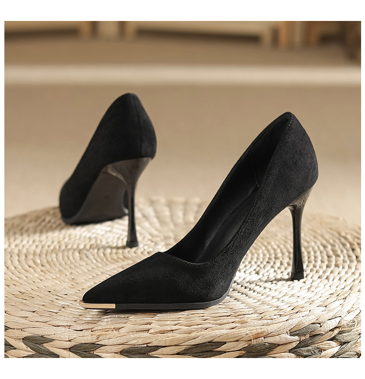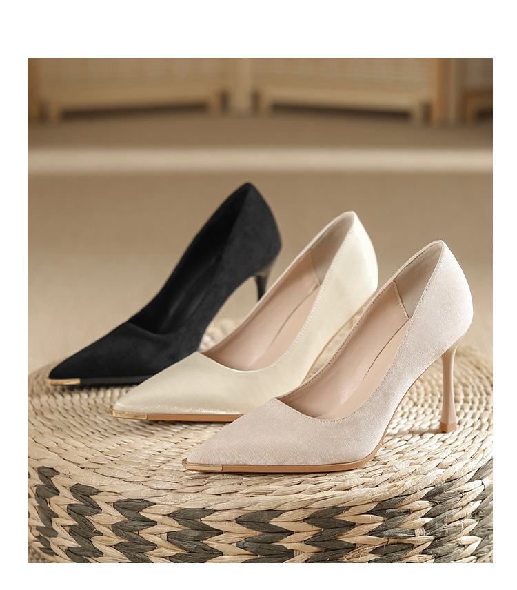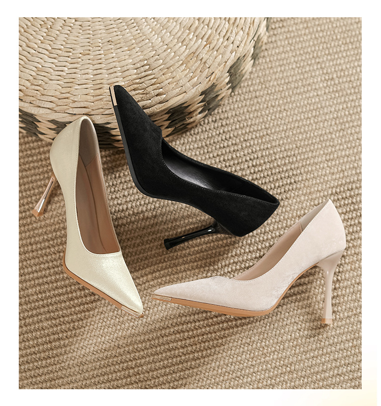 금속 발가락 안티 킥 뾰족한 스틸레토 스웨이드 새틴 하이힐 여성의 단색 통근 플랫폼 작업 뒤꿈치 신발스토어 가기
