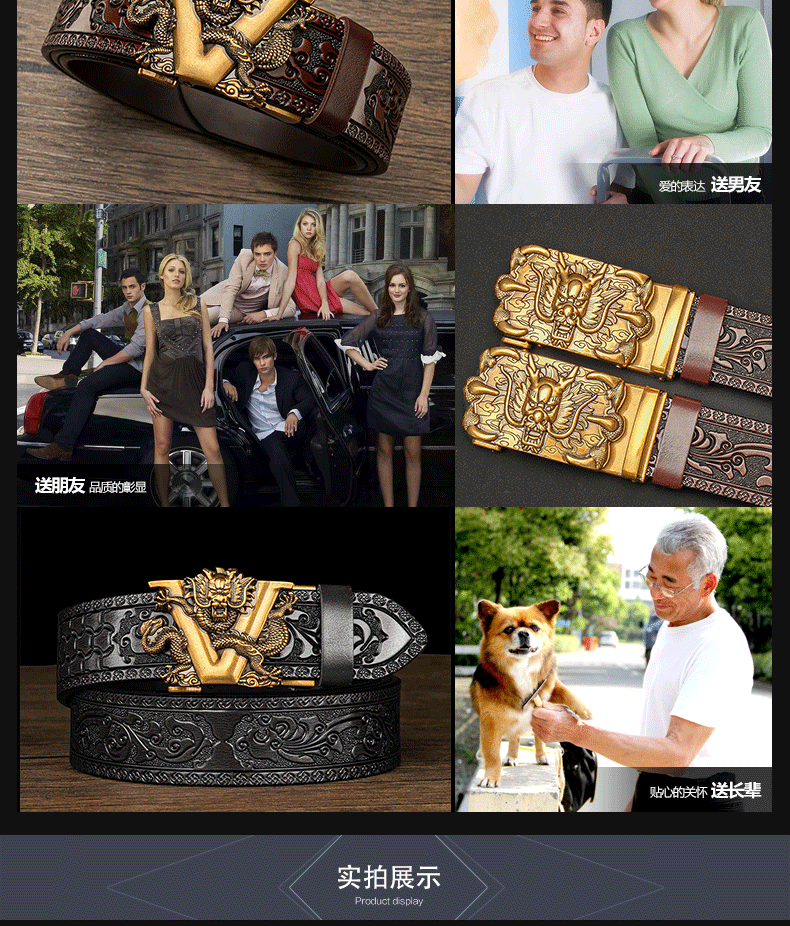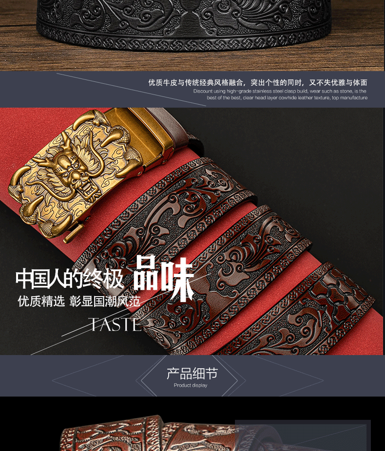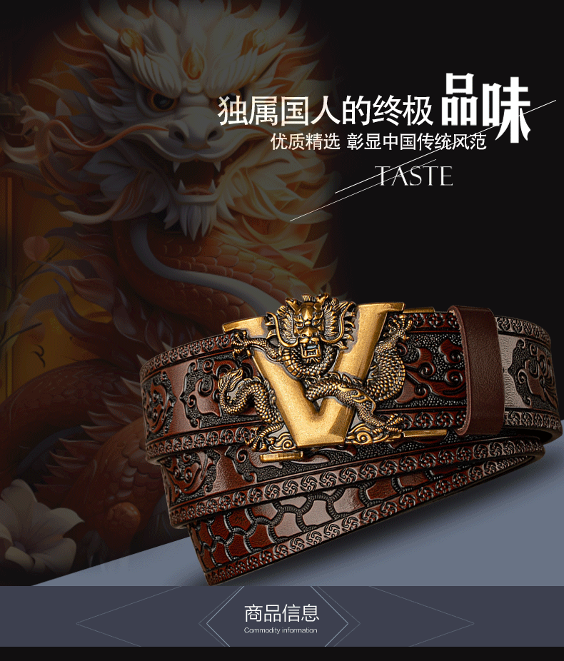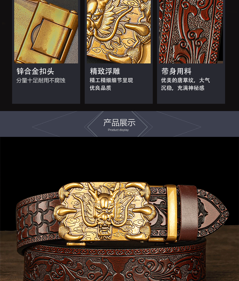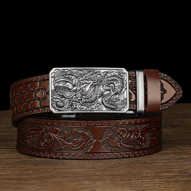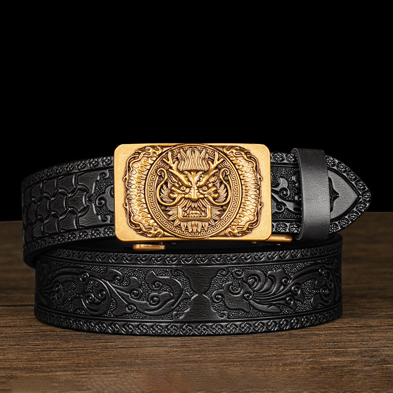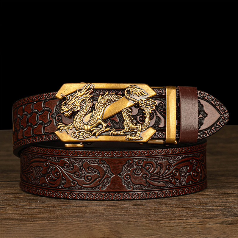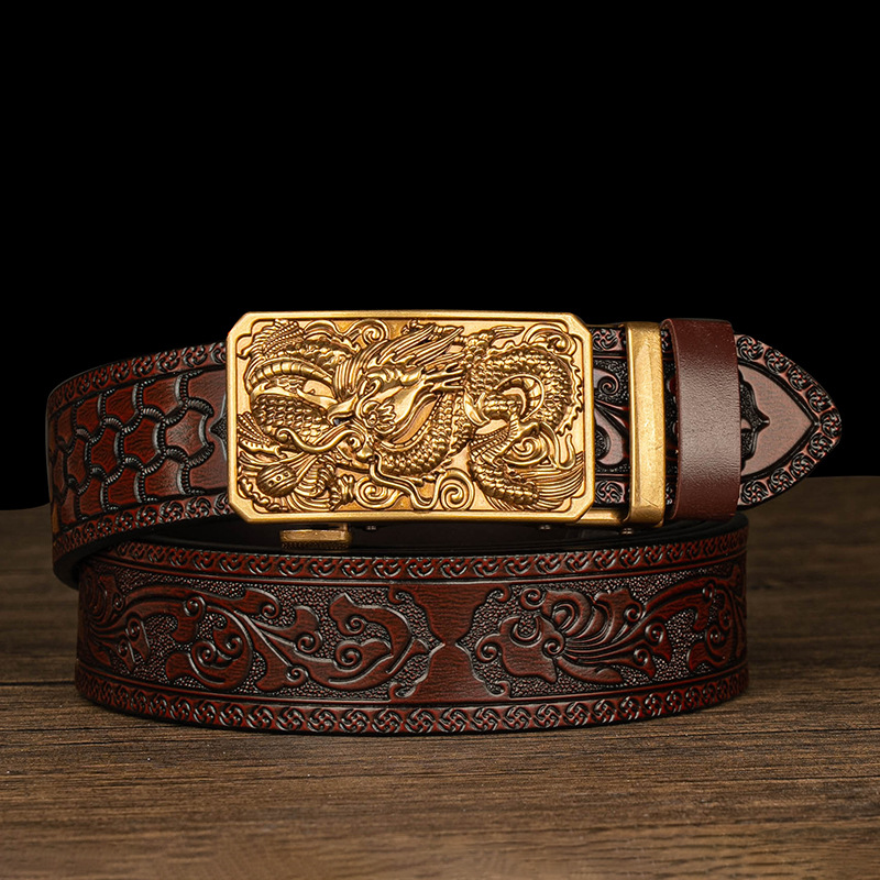 공격적인 탕 잔디 패턴 새겨진 남성 자동 모방 구리 버클 벨트 독특한 라이브 핫 판매 6 발톱 드래곤 양각 벨트