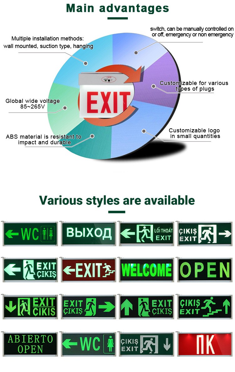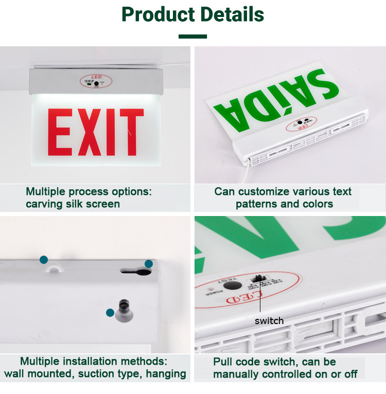 국경 간 LED 비상 표지판 천장 투명 태그 비상등 안전 출구 임베디드 상단 대피 표시기