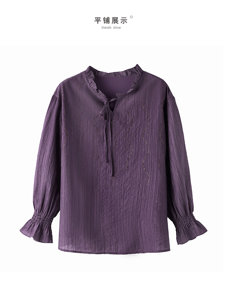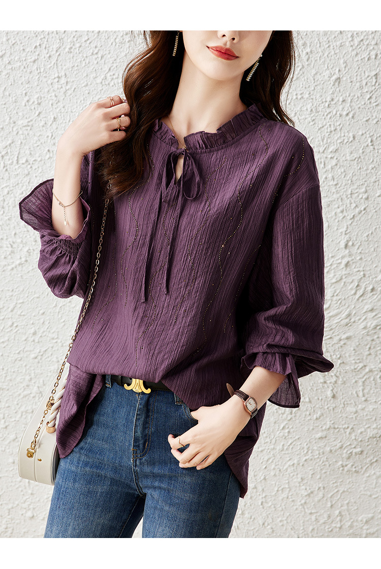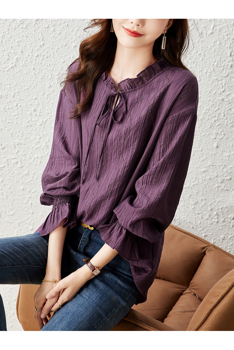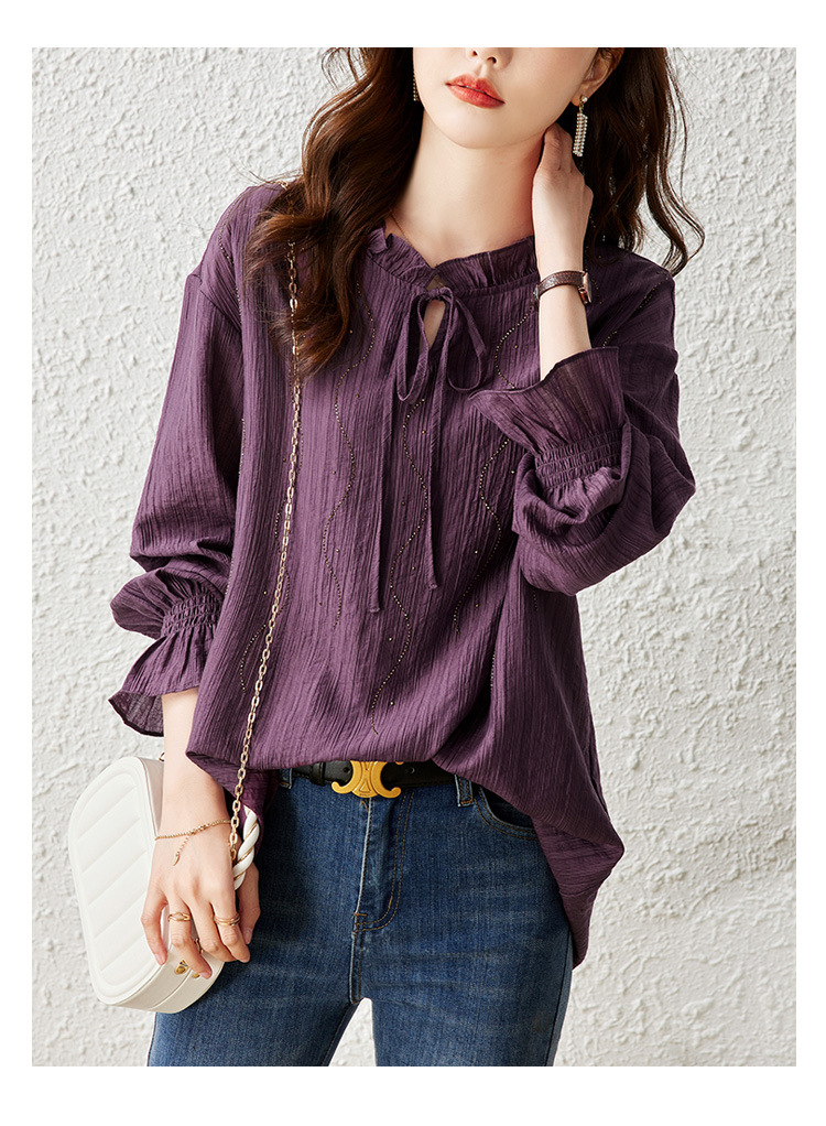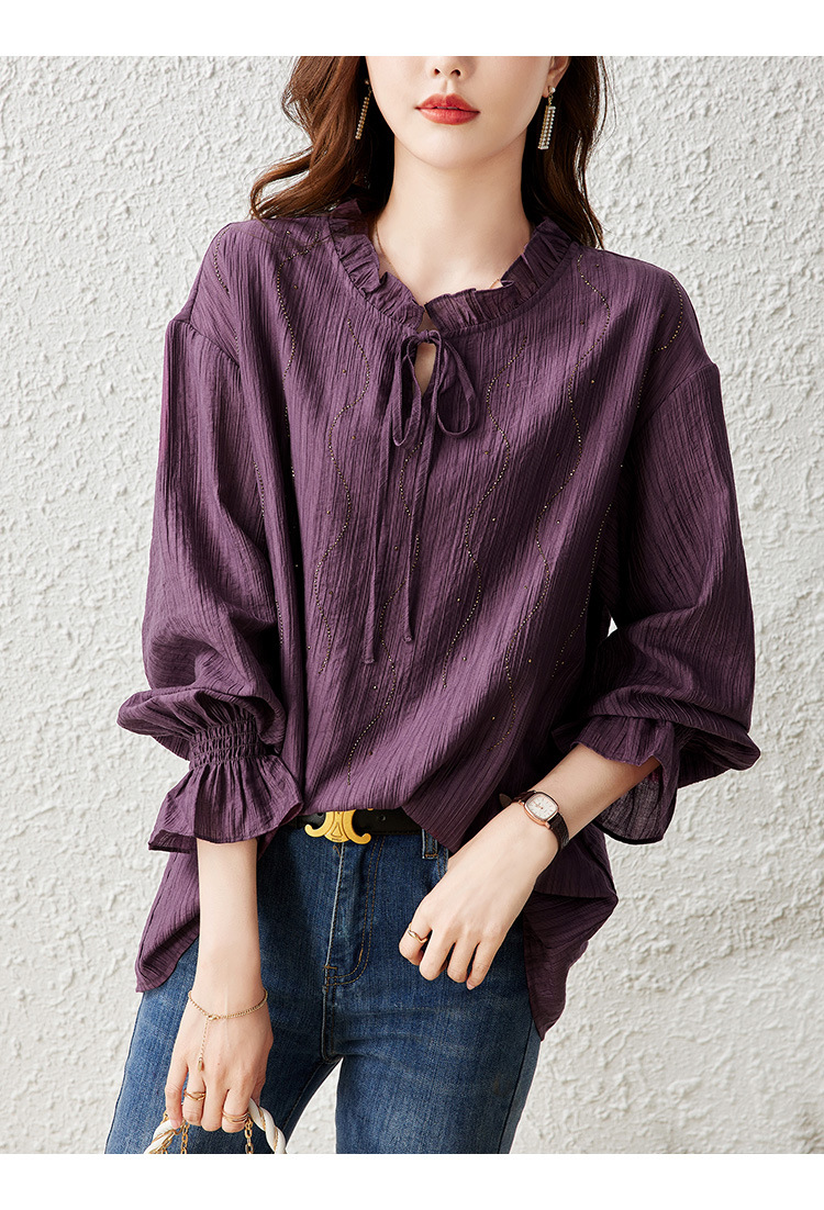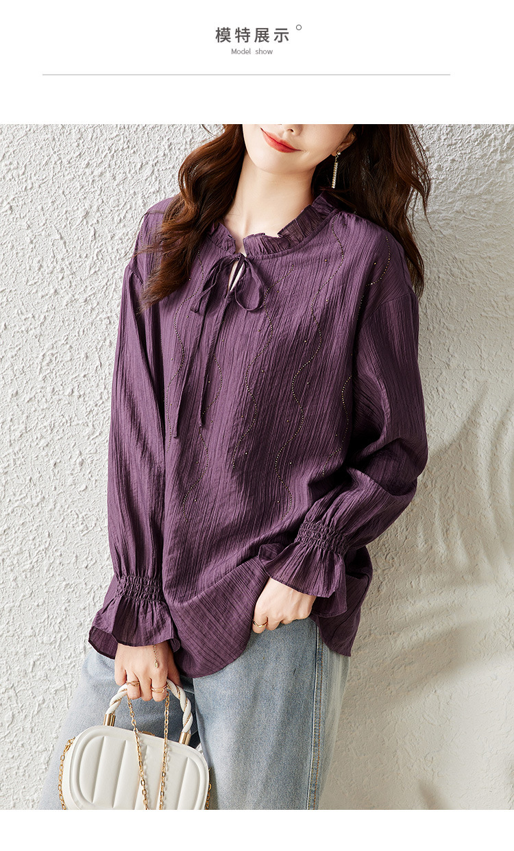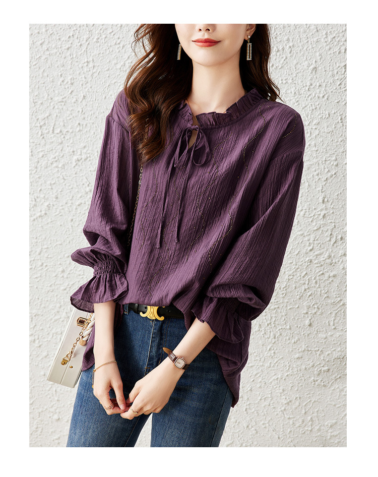 실제 사진 촬영된 러플 장식과 큐빅 장식의 쉬폰 블라우스, 루즈핏, 통통한 여성을 위한 유럽 스타일의 큰 사이즈 신상 여성복, 가을스토어 가기