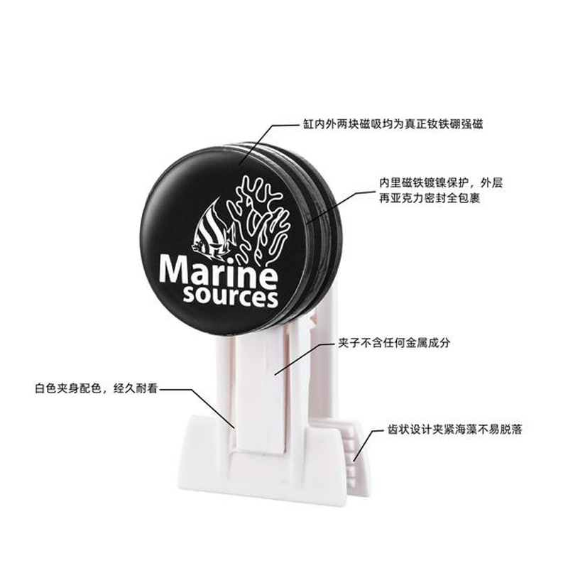 MARINE SOURCES Veggie Clip 海之源强磁版海藻紫菜夹,真正的超强磁性(不虚标),最大适用于15mm厚度的玻璃(型号:VC-M15)。海藻夹主体不含任何金属成分,磁铁全亚克力包裹不接触海水,不会对水体造成污染。强磁版本可以轻松随意移动到鱼缸内任何地方而不需要让你接触到鱼缸水体,从而避免手上油脂或污物对水体造成污染,也不必由于接触到鱼缸水体而需要频繁洗手。另外磁吸和夹子之间非锁死固定设计,夹子可随着水的流动而微微晃动,让夹着的紫菜更显动感,从而更容易激发鱼儿的食欲。
