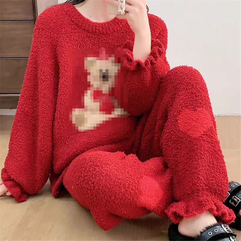 여성 홈웨어 주름 새해 붉은 곰 만화 부드러운 홈 착용 가을과 겨울 두꺼운 따뜻한 세트