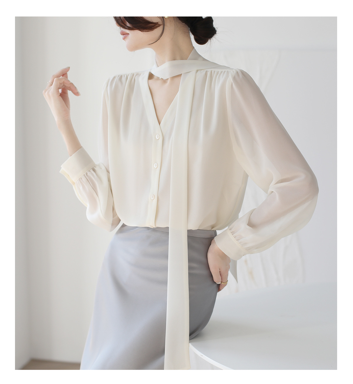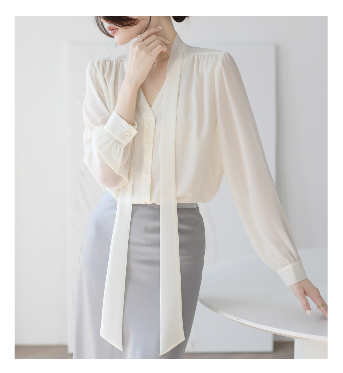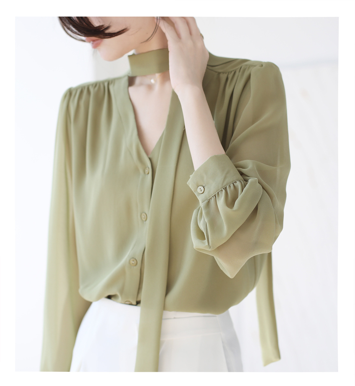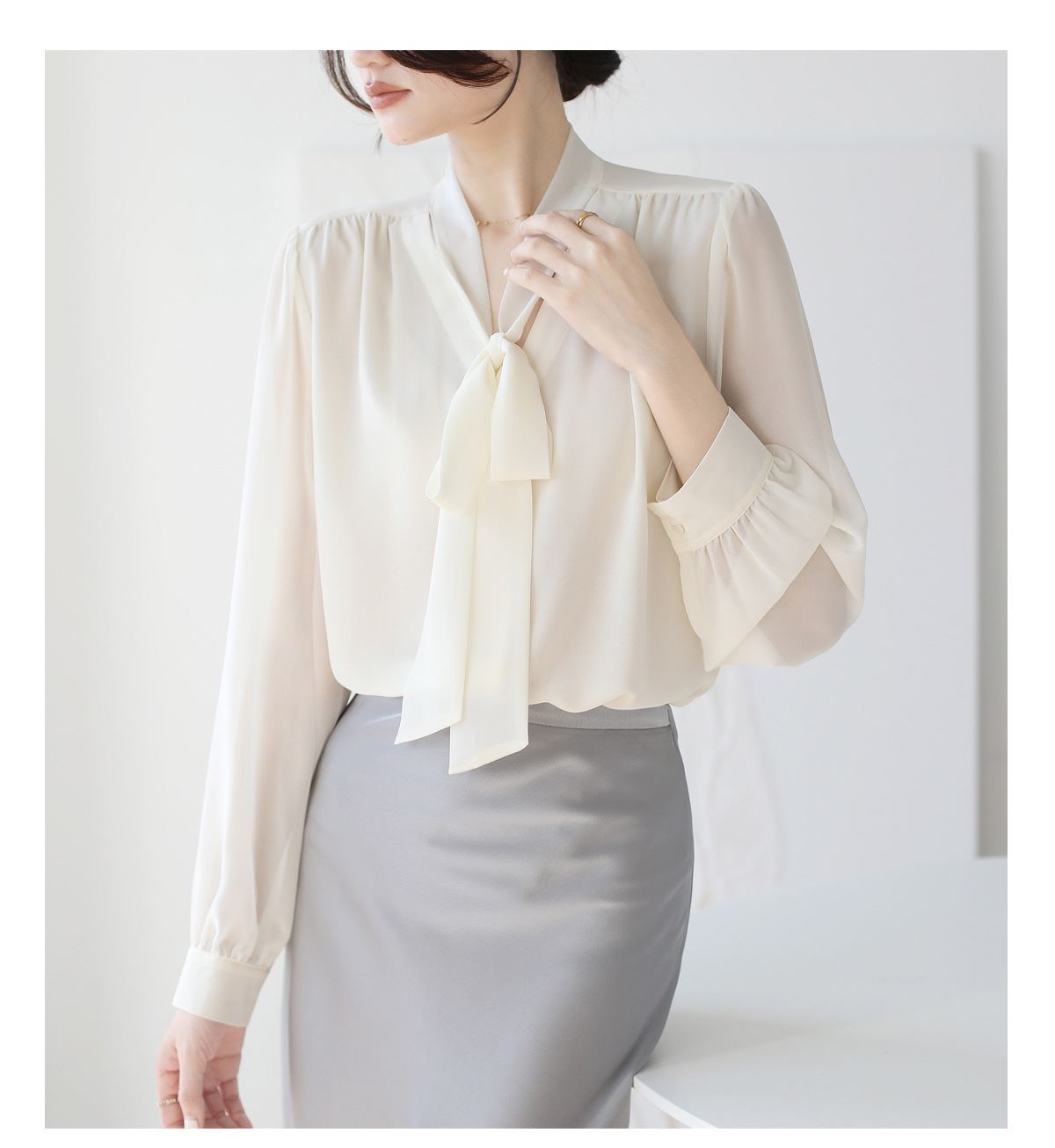 프랑스 스타일의 부드러운 리본 셔츠 여성의 2024 년 이른 봄 새로운 틈새 우아한 활 V 넥 슬림 쉬폰 탑스토어 가기
