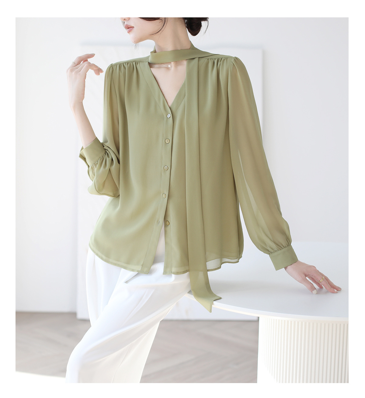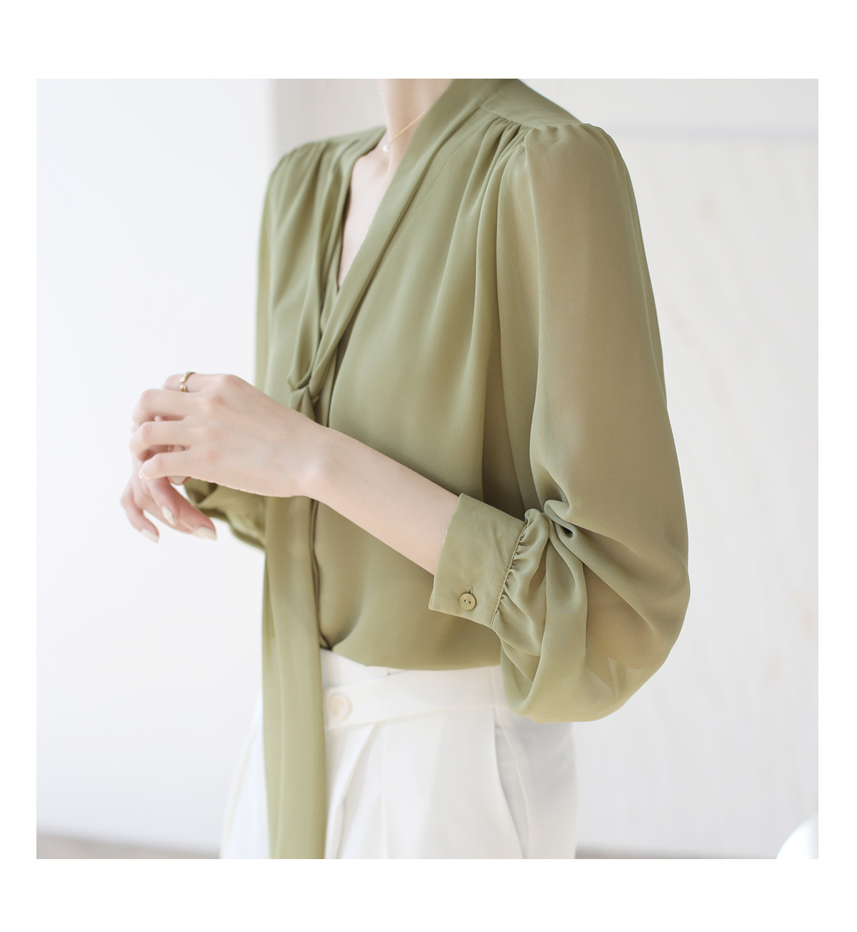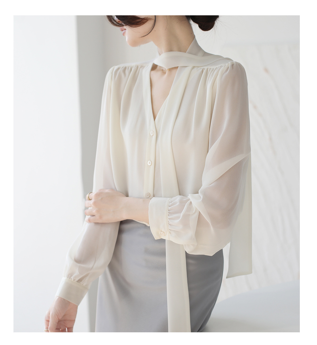 프랑스 스타일의 부드러운 리본 셔츠 여성의 2024 년 이른 봄 새로운 틈새 우아한 활 V 넥 슬림 쉬폰 탑스토어 가기