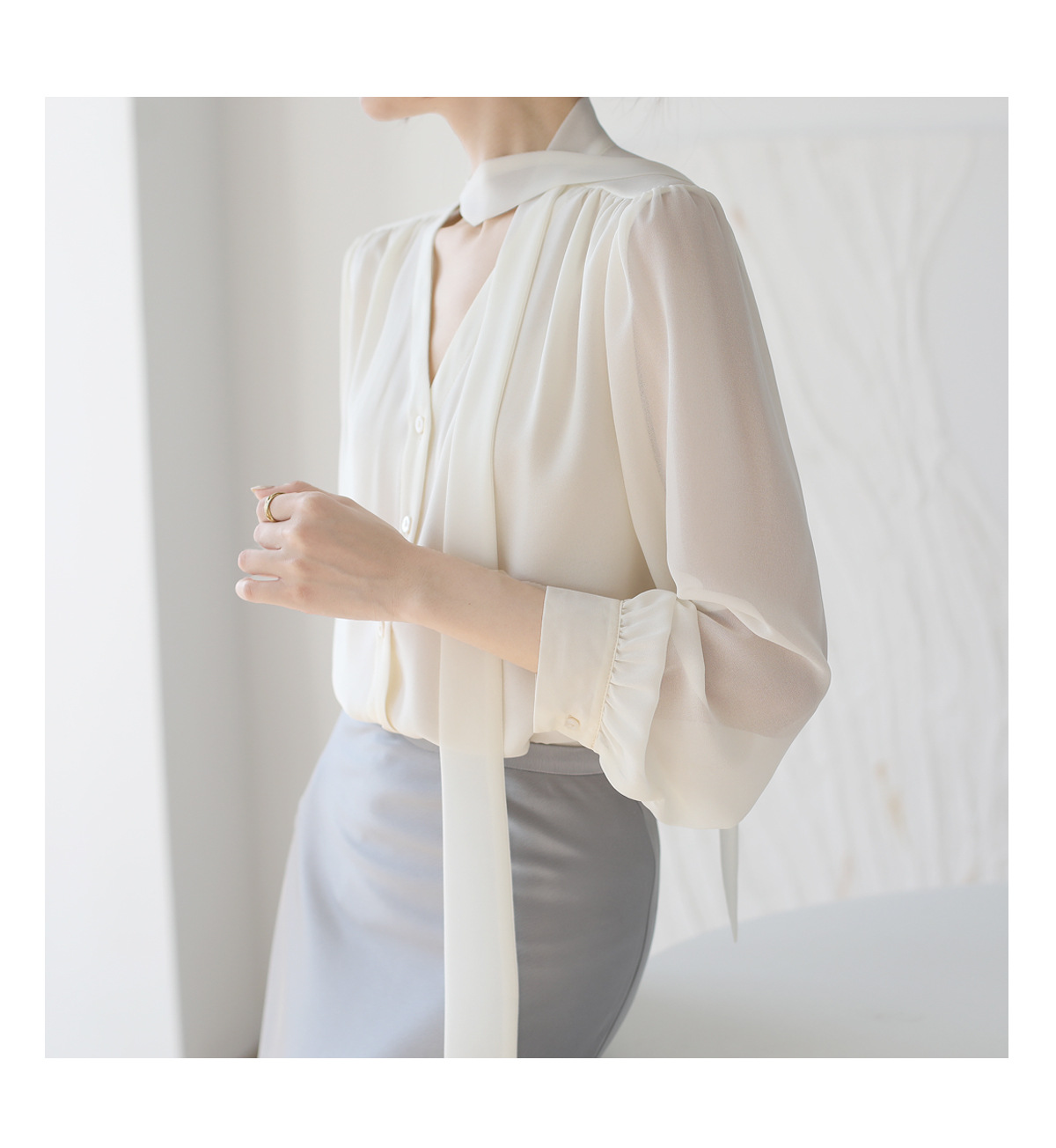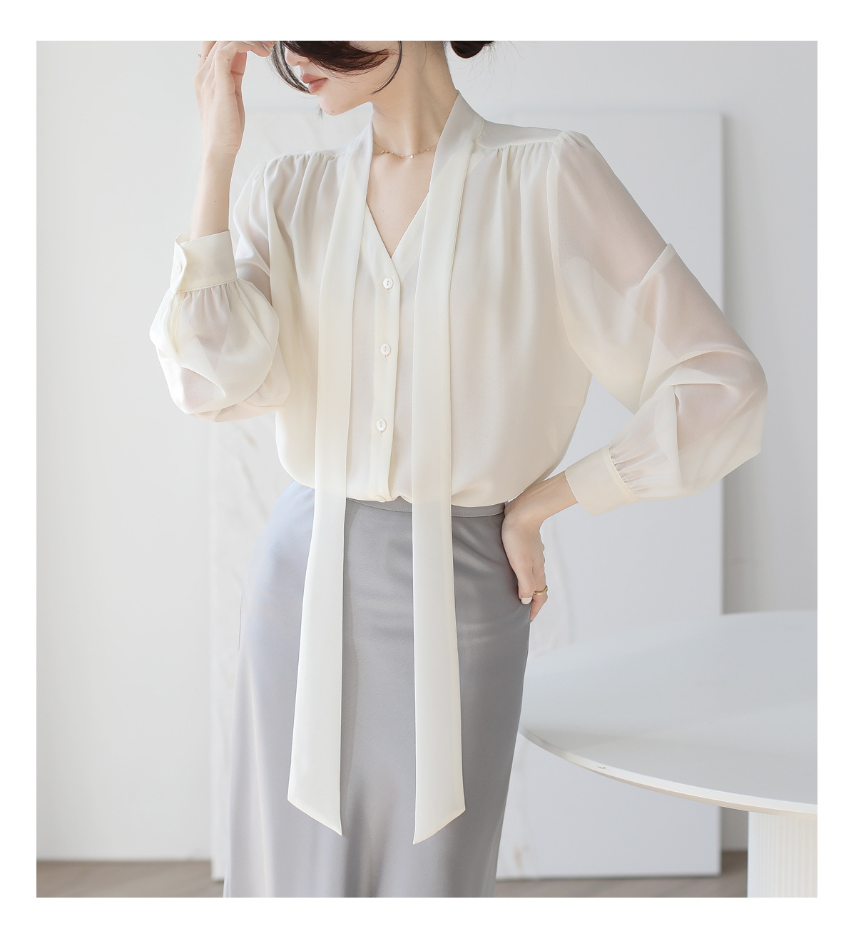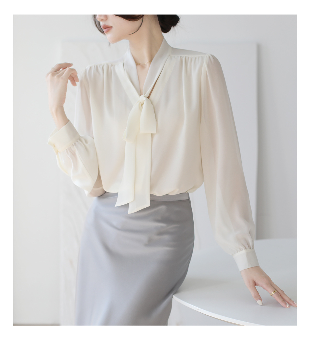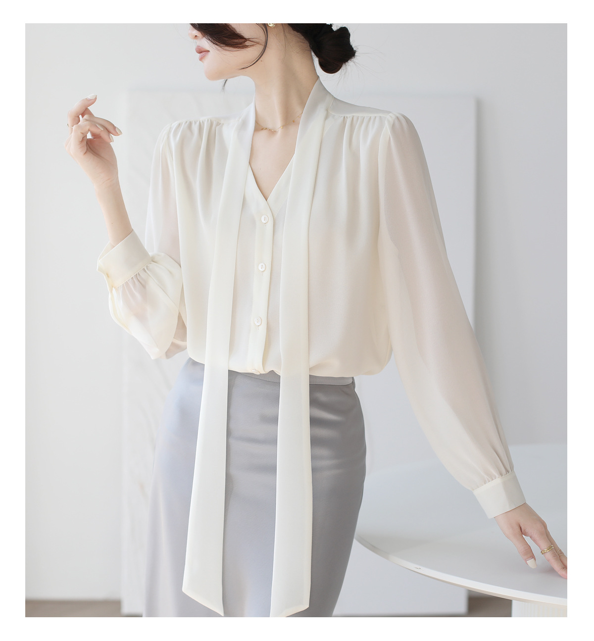 프랑스 스타일의 부드러운 리본 셔츠 여성의 2024 년 이른 봄 새로운 틈새 우아한 활 V 넥 슬림 쉬폰 탑스토어 가기