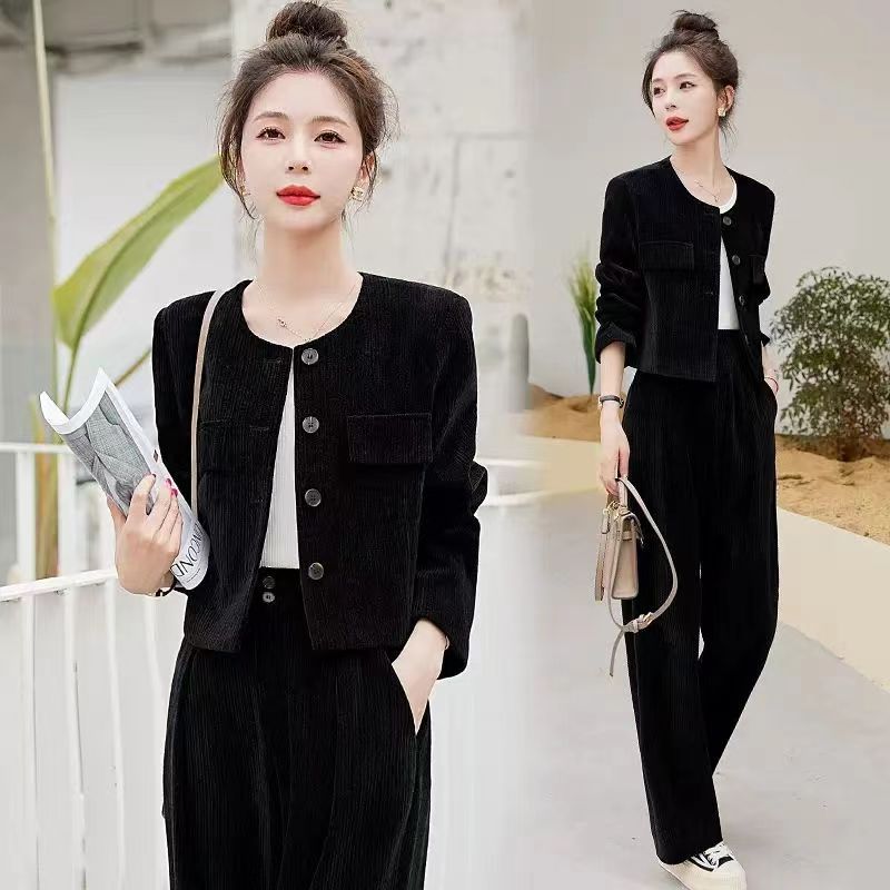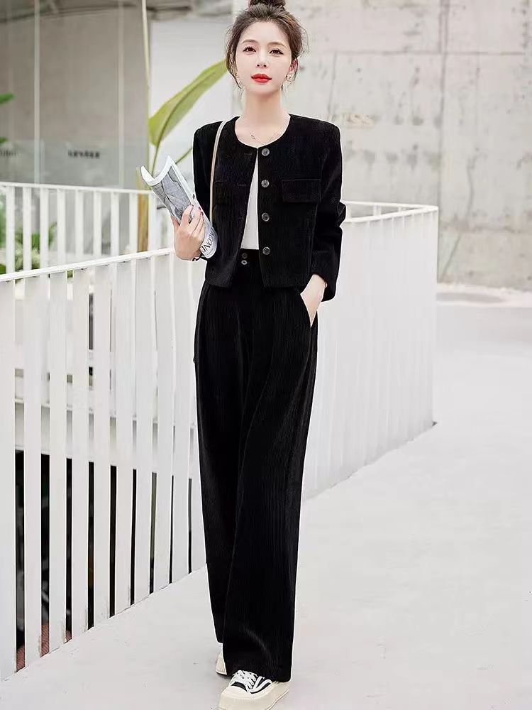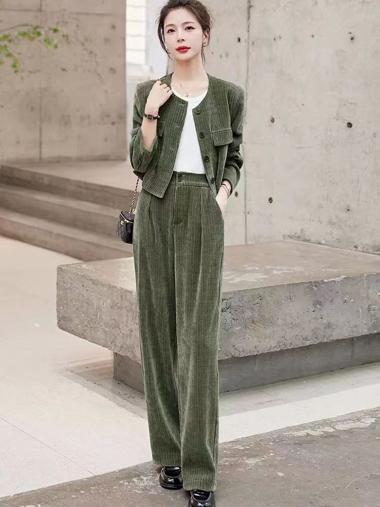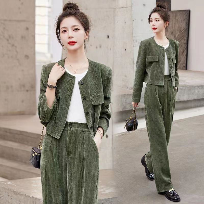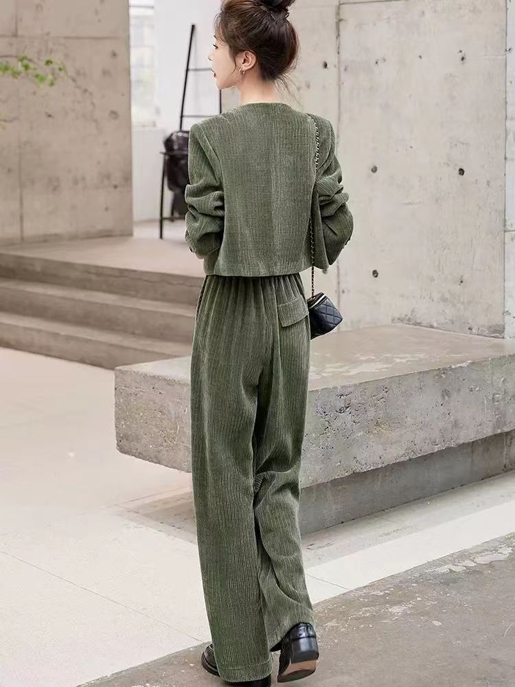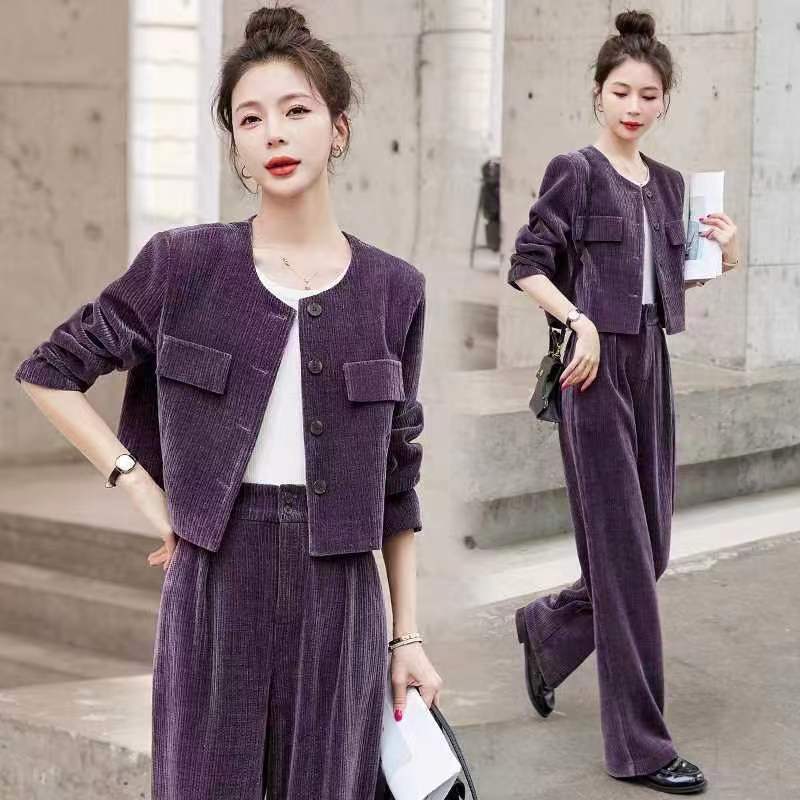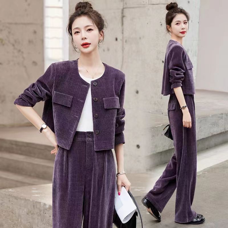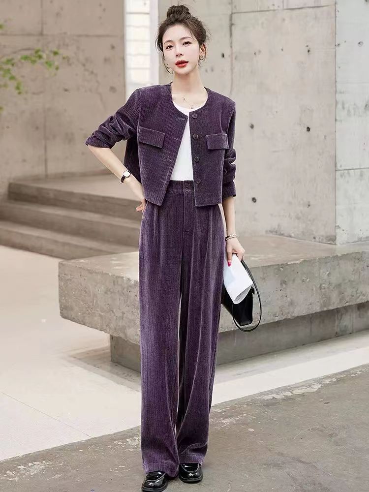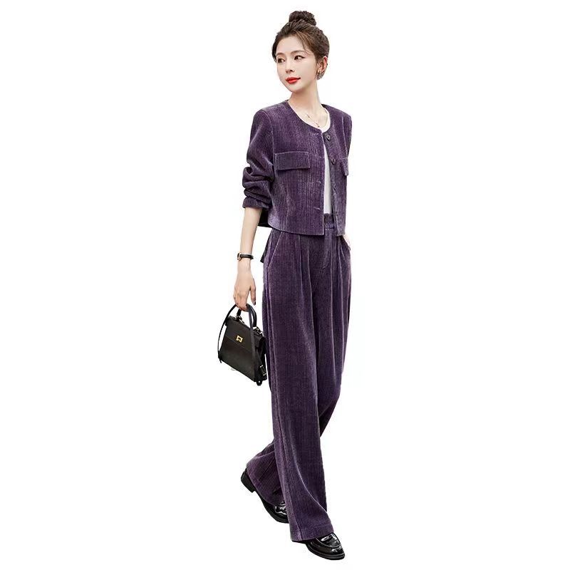 Xiaoxiangfeng Yujie 우아한 여신 스타일 세트 2024 봄 새로운 보라색 체닐 와이드 레그 바지 여성용 투피스 세트스토어 가기