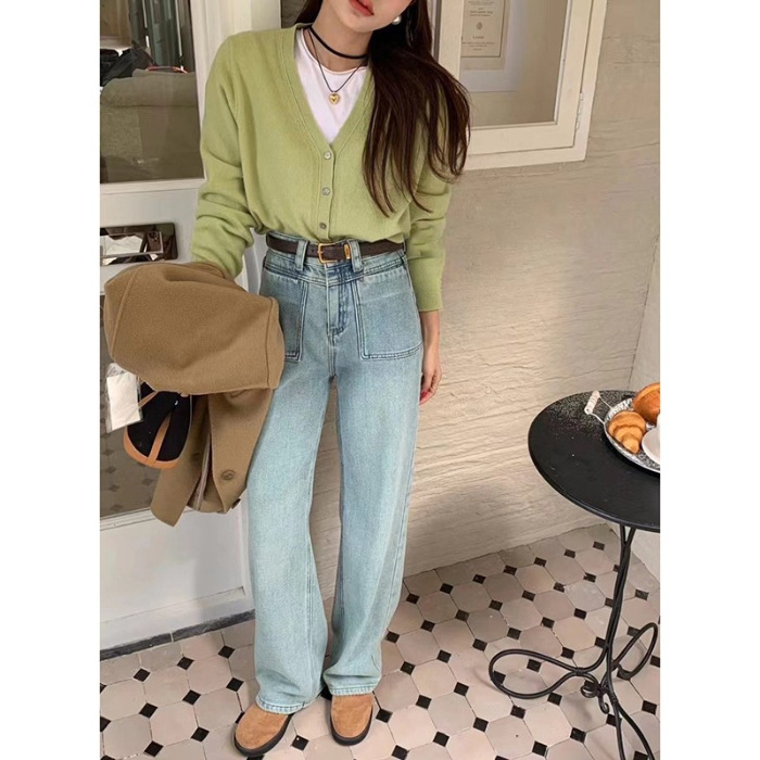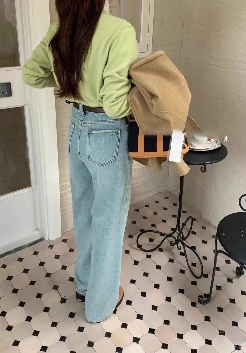 밝은 색상의 스트레치 스트레이트 청바지 여성의 높은 허리 2024 봄 새로운 느슨한 슬리밍 올 매치 와이드 다리 바지