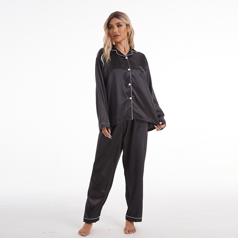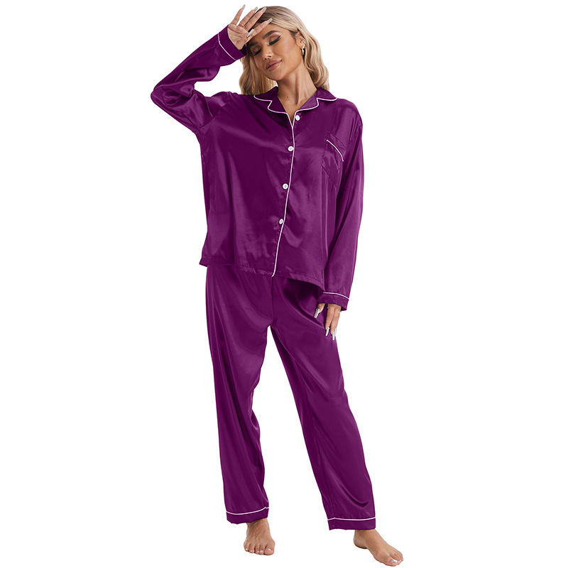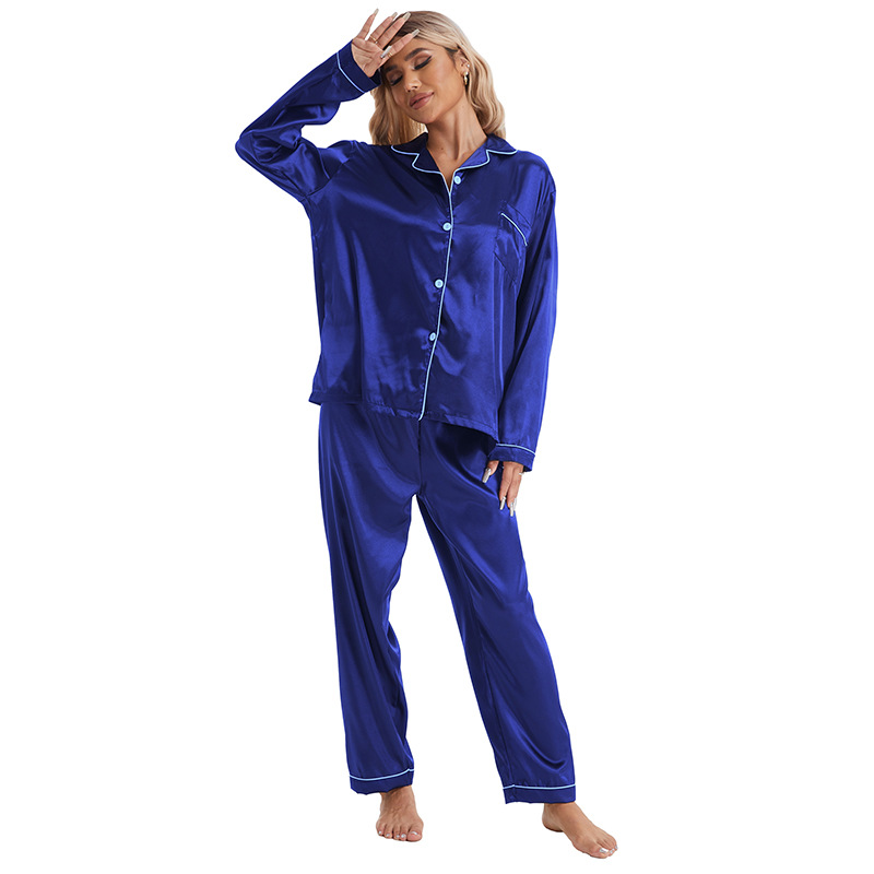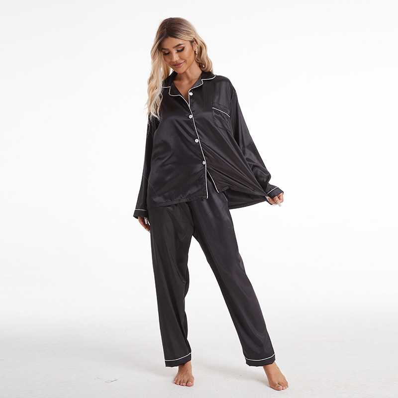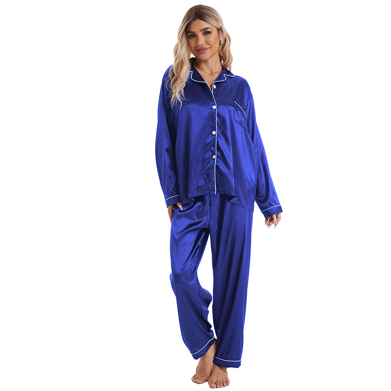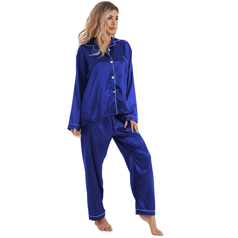 유럽과 미국의 대외 무역 홈 착용 옷깃 아이스 실크 잠옷 여성 세트 긴팔 바지 투피스 세트 플러스 사이즈 새틴 공급스토어 가기