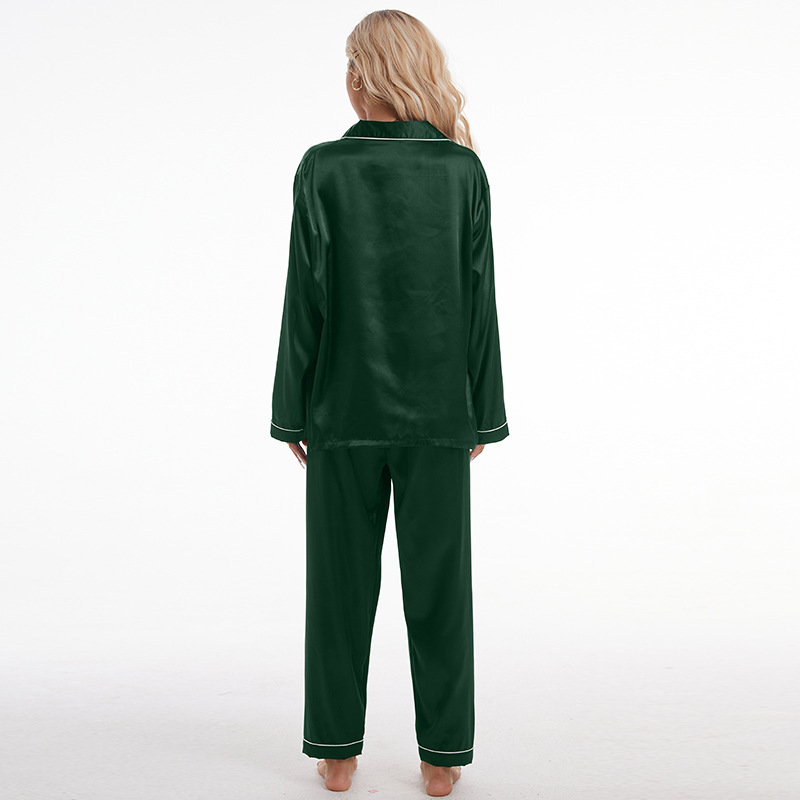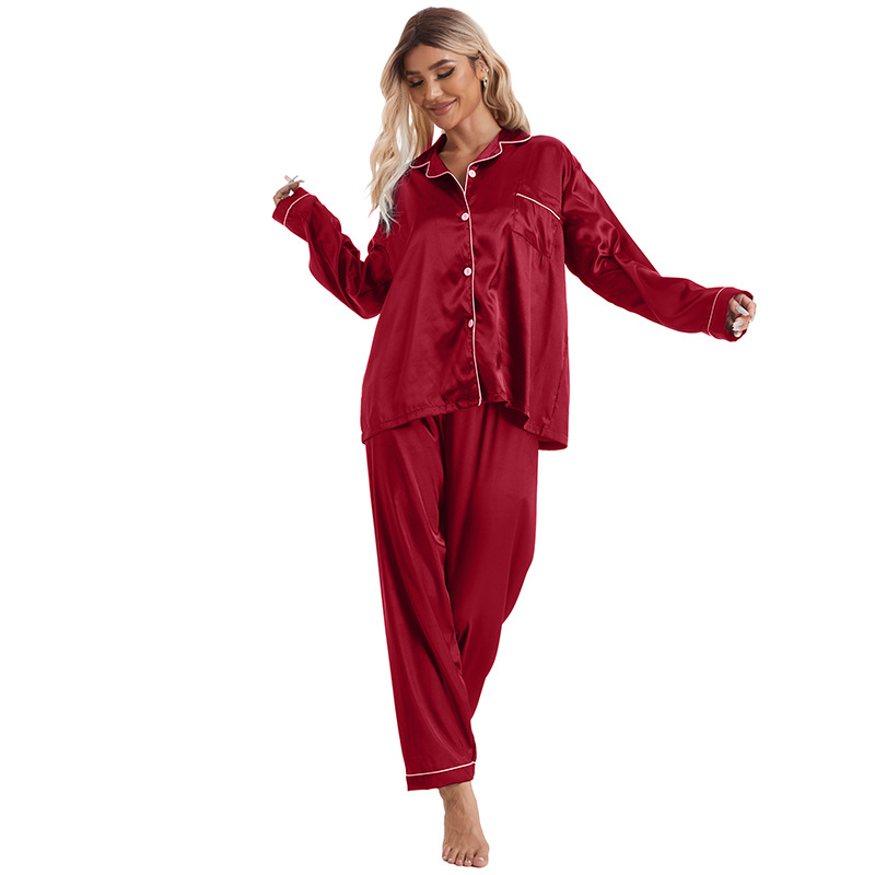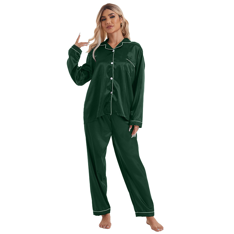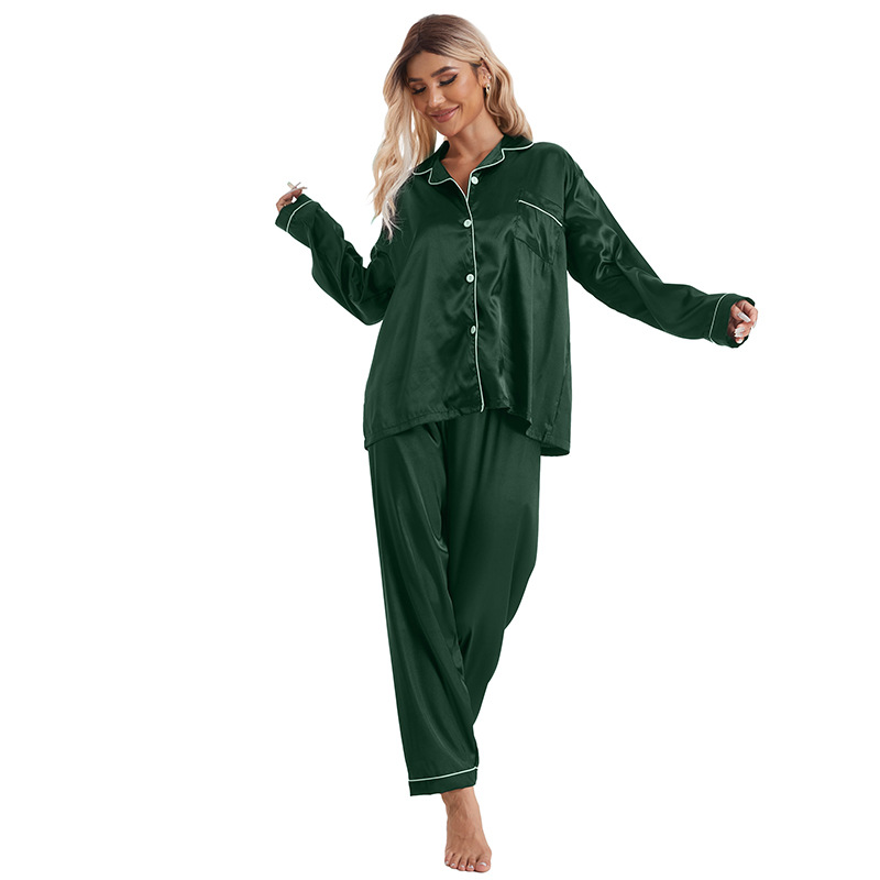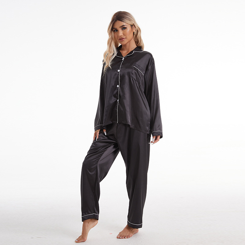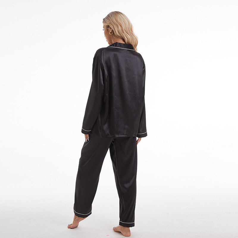 유럽과 미국의 대외 무역 홈 착용 옷깃 아이스 실크 잠옷 여성 세트 긴팔 바지 투피스 세트 플러스 사이즈 새틴 공급스토어 가기