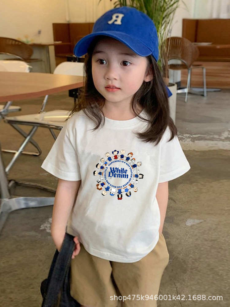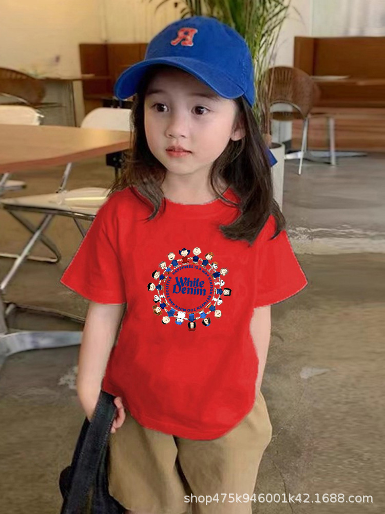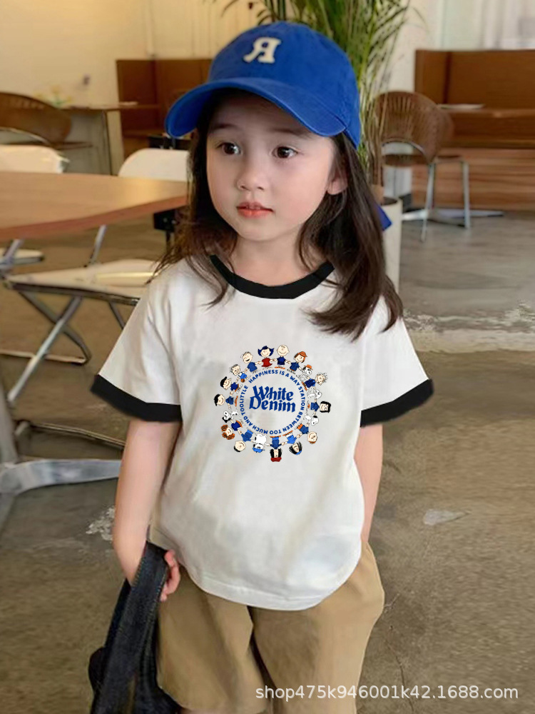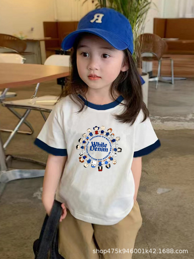 국경 백 칼라 코튼 소년과 소녀 둥근 목 반팔 티셔츠 느슨한 어린이 만화 얇은 땀 흡수성 하프 슬리브 탑스토어 가기