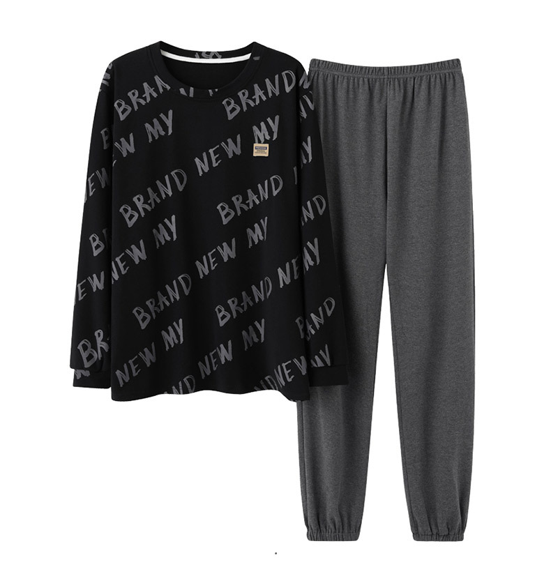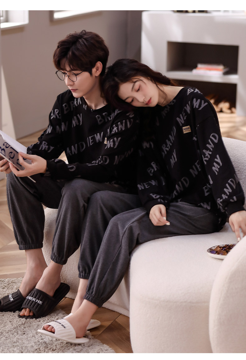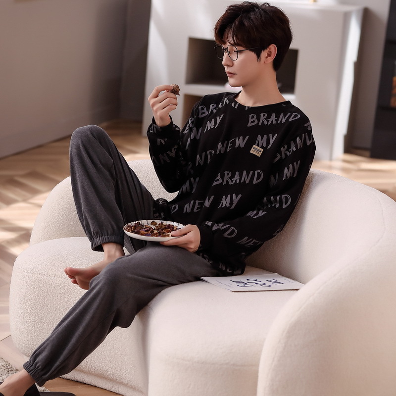 가을과 겨울 순수한면 커플 잠옷 둥근 목 풀오버 검은 슬리밍 남성 청소년 캐주얼 편안한 drawstring 따뜻한 홈웨어