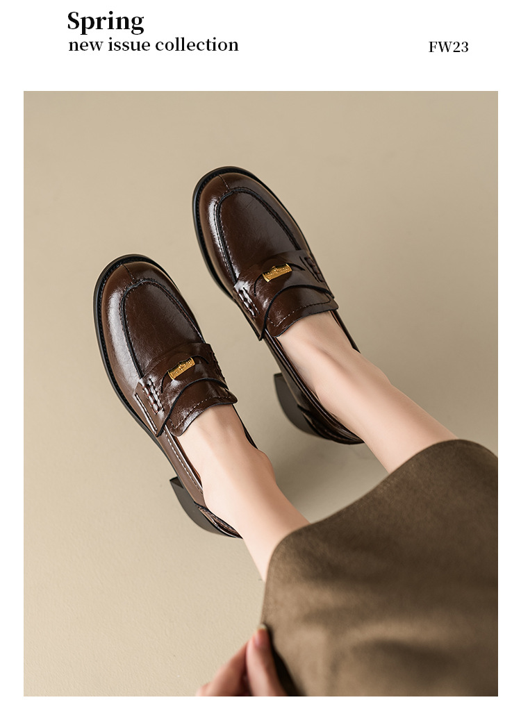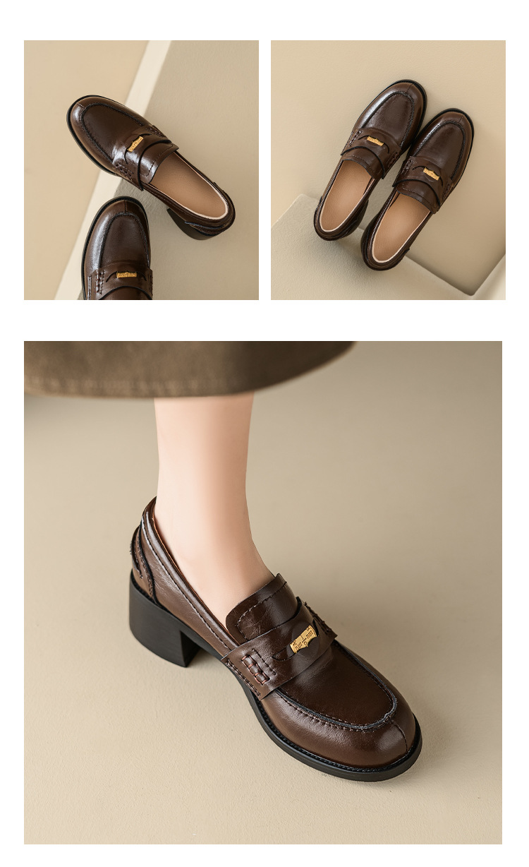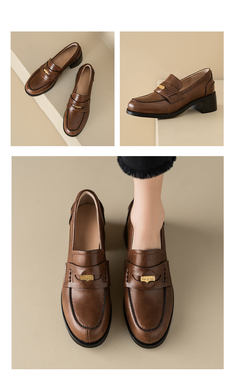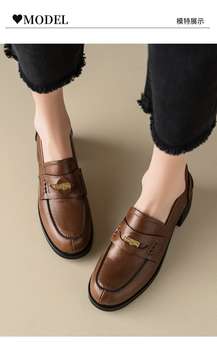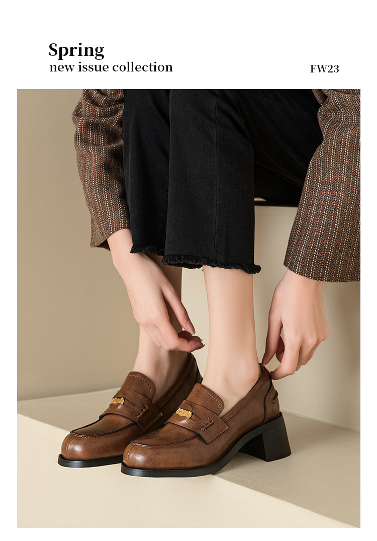 Maillard 스타일 레트로 다크 브라운 금화 블랙 가죽 신발 2023 새로운 가을 라운드 토 청키 힐 로퍼 싱글 레이어 신발스토어 가기
